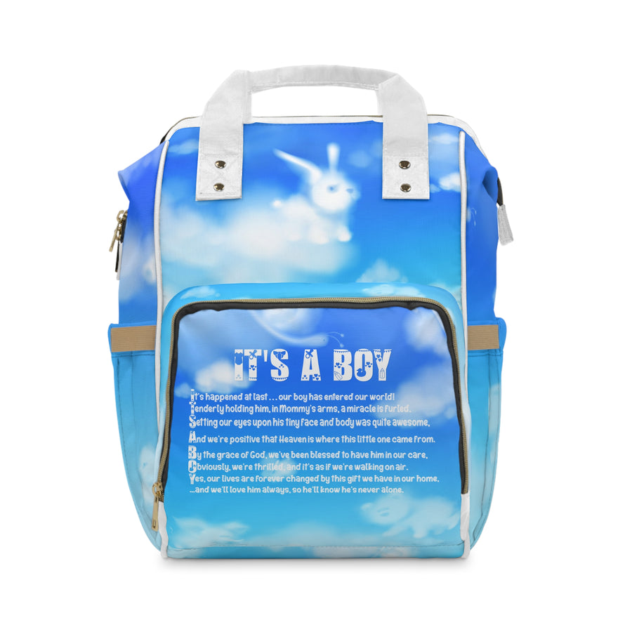 Looking for a bag that fits all your baby’s essentials? The Baby Steps acrostic poem, It's a Boy diaper backpack from Moments in Rhyme, is spacious, sturdy, and ready for busy days. The adorable cloud animals and font add to the charm of this diaper backpack. It’s great for errands or outings with toddlers, with room for bottles, wipes, and diapers. Made from lightweight, high-quality nylon, it is designed to withstand wear and tear. The open layout includes a main zippered pocket, three elastic pockets, and a net pocket for easy access. Adjustable shoulder straps, a padded back, and a cream interior lining add comfort and style. The bag measures 15.0 by 10.8 by 6.7 inches.