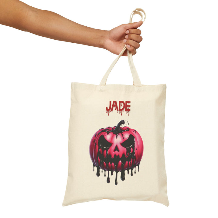 Get into the Halloween spirit with our It’s Just a Phrase candy tote bag, featuring an acrostic poem that spells out Happy Halloween and a spooky pink pumpkin.The amazing Halloween font adds to the charm of this tote. It's a fun and festive way to carry treats, and it can be used year after year. Great for both kids and adults who want to add a little extra spookiness to their costumes. Made from 100% cotton canvas with sturdy handles, this 15” x 16” tote is available in natural or black. To keep it looking its best, spot clean only, avoid bleach, and let it line dry. Do not iron directly over the print. To personalize it, simply provide the first name you would like on it. We’ll handle it from there.