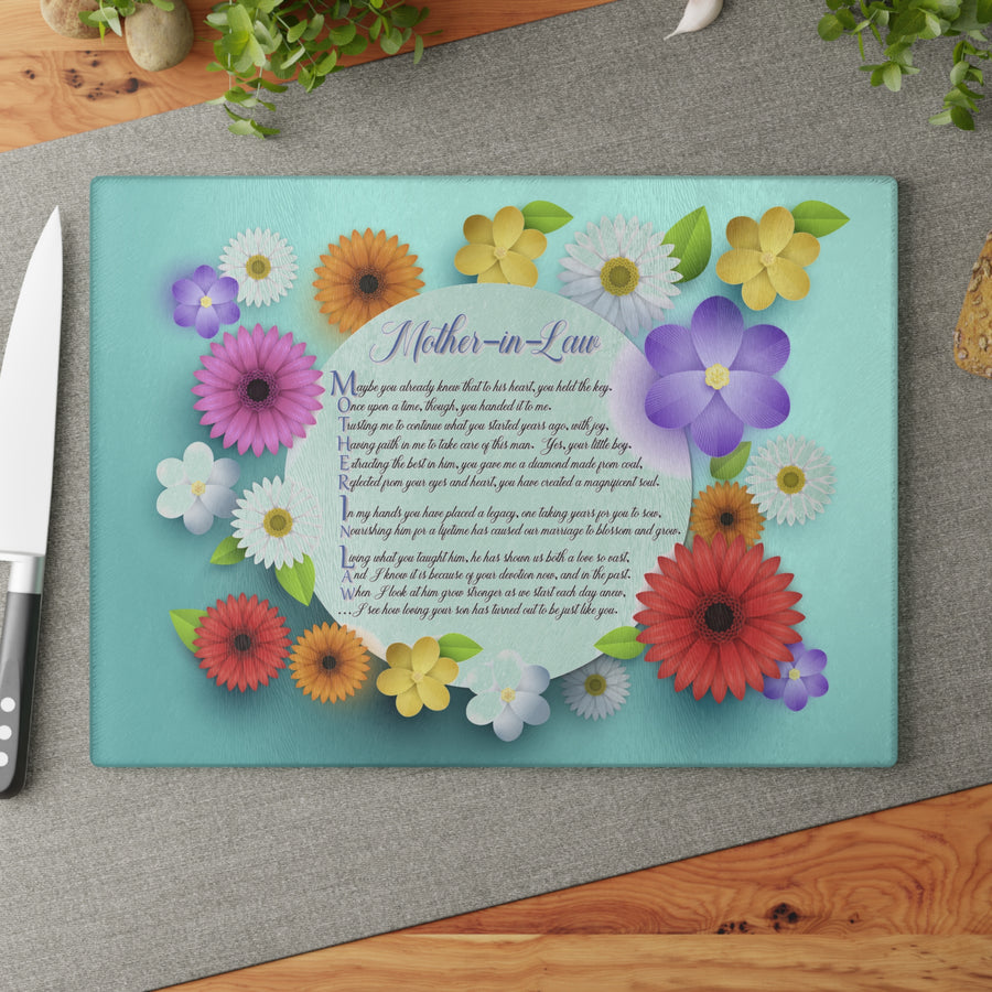 Moments in Rhyme presents our It's Just a Phrase "Forever Friends" Glass Cutting Board. In addition to celebrating your mother-in-law, this acrostic poem glass cutting board brings a touch of character into any kitchen. Its tempered glass material is robust and helps prepare many a tasty meal for a long time to come. The textured surface makes it an ideal chopping, slicing, and dicing area. Available in two sizes: 8" x 11" and 11" x 15".