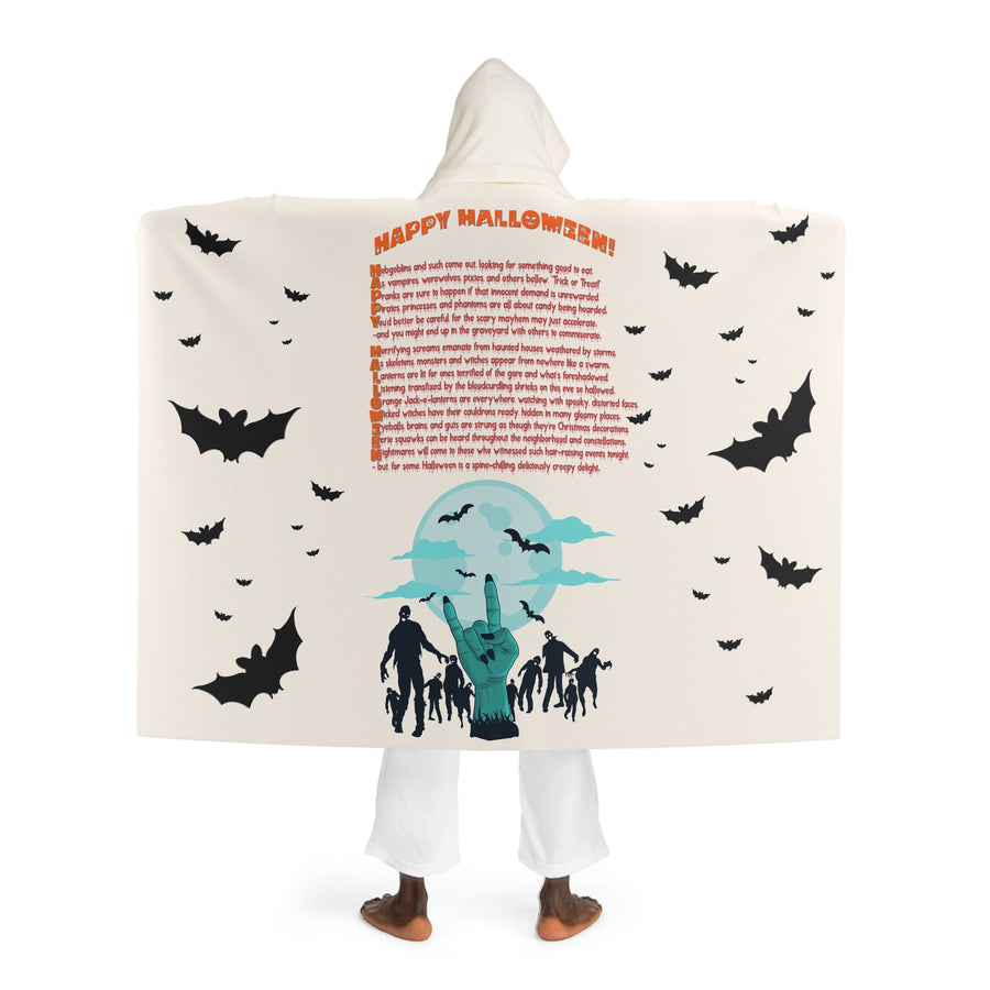 Give your loved one the gift of comfort with our It’s Just a Phrase Hooded Sherpa Blanket. This one features an acrostic poem that spells out Happy Halloween, with a Zombie hand reaching out from the grave. BOO! This blanket makes a thoughtful gift for any occasion and will become a favorite year after year. Made from high-quality materials, it is soft and vibrant. Whether relaxing indoors or spending time outside, this blanket keeps anyone warm and cozy. Made from 100% polyester for strength and durability, the plush fleece is extra soft, and the cream-colored Sherpa hood adds a special touch. Do not iron. Machine wash in cold water and tumble dry on a low setting. Do not bleach or dry-clean. One size: 70.5" x 52".
