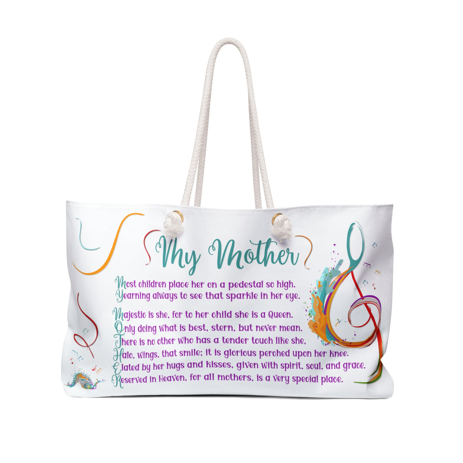 Take your essentials with you in style with our It’s Just a Phrase Weekender Bag Collection. This  roomy tote features an acrostic poem that spells out My Mother. This bag is more than just practical—it makes a statement and celebrates both words and special relationships. It’s great for weekends, the gym, or daily use, especially if you love literary art and all things creative. It also makes thoughtful gifts for bridesmaids, birthdays, holidays, or just for yourself. With lots of space for your things, this bag is sure to become a favorite. Give someone special a gift they can use for years. To personalize it, tell us your mom's first name that you want on the bag, and we'll take it from there. One size: 24" x13"