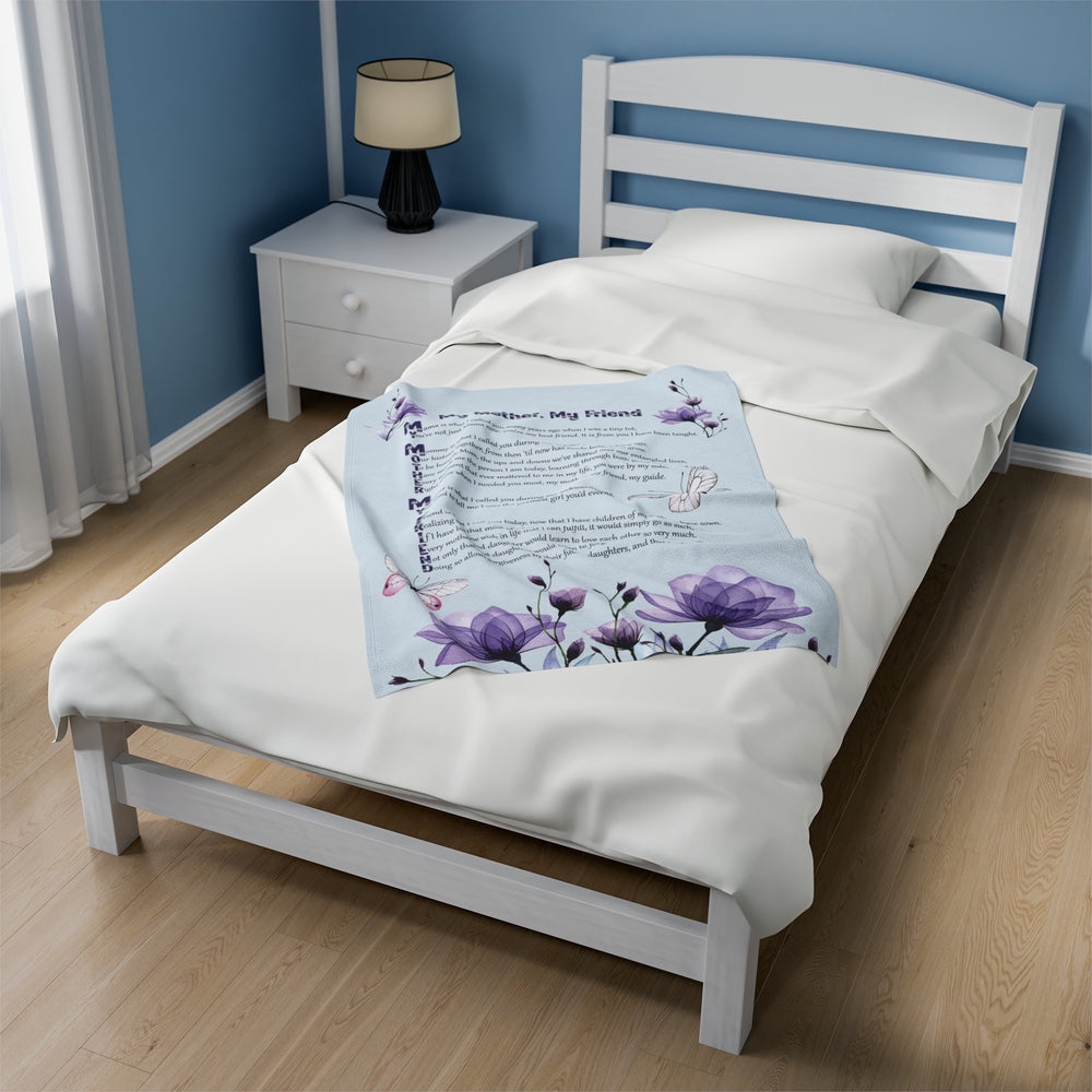 Help your Mother experience the utmost comfort with our luxurious Velveteen Plush Blanket, adorned with a heartwarming acrostic poem spelling out "My Mother, My Friend". This is not just any gift for your beloved mother, but a symbol of your deep love and appreciation. Crafted with only the finest materials, our blanket boasts delicate softness and vivid colors. Whether she's snuggled up at home or out enjoying special occasions, this blanket will provide warmth and coziness. Treat your Mom to the ultimate gift of comfort, and show her just how cherished she truly is. Don't hesitate - give the gift of lasting comfort!