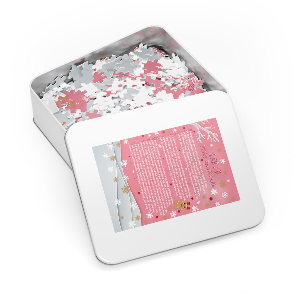 Baby's First Christmas Acrostic Poem Jigsaw Puzzle - Gingerbread - Pink - Tin Box