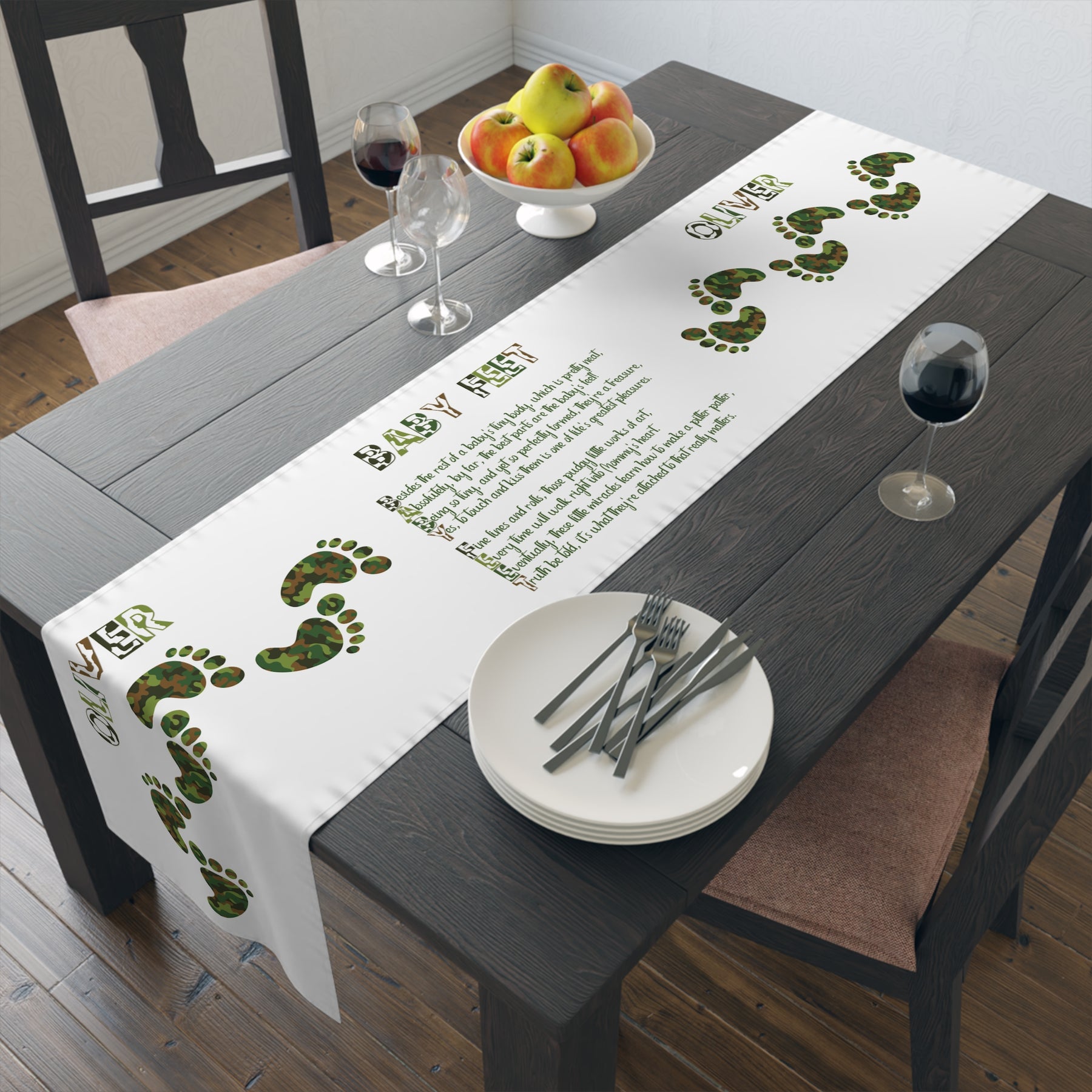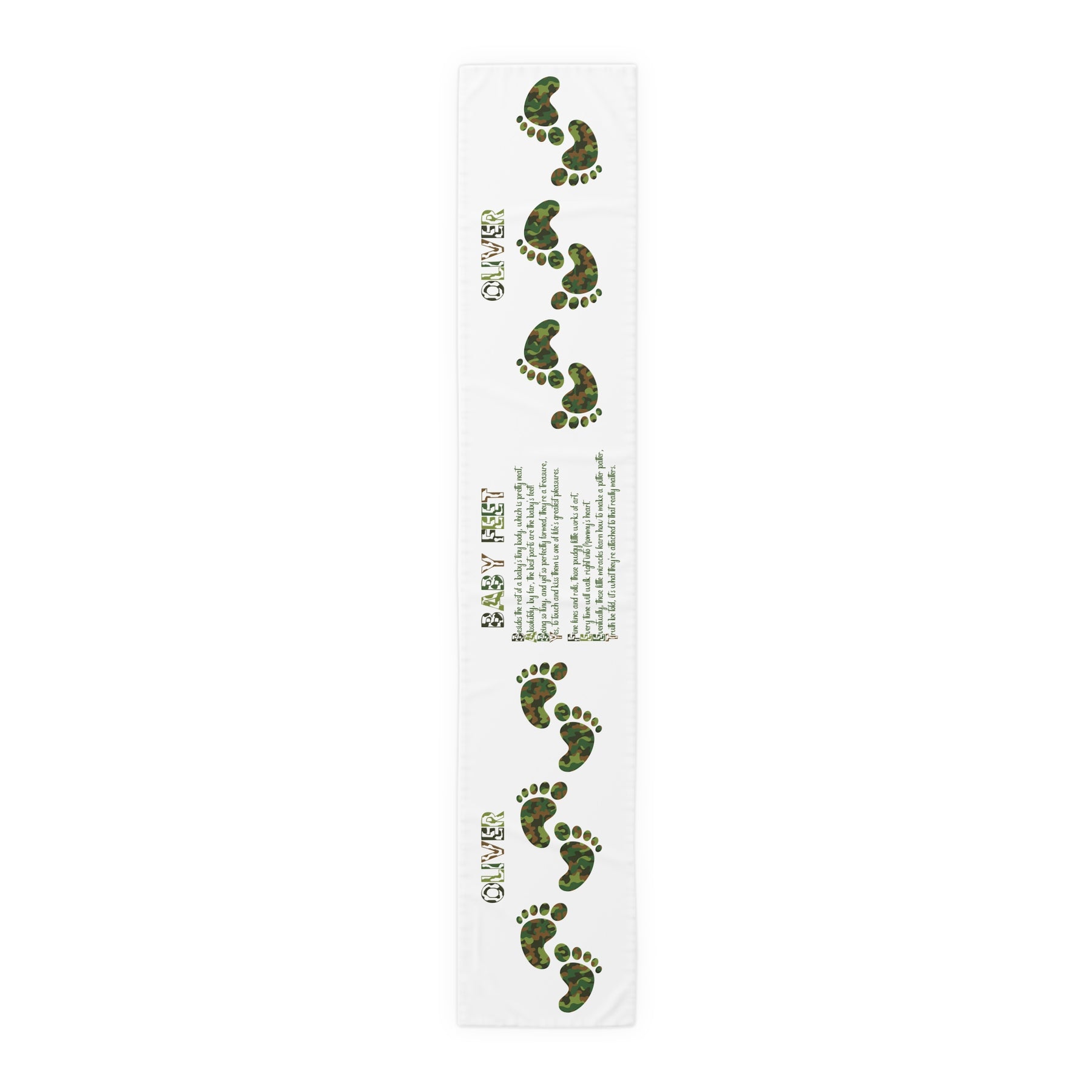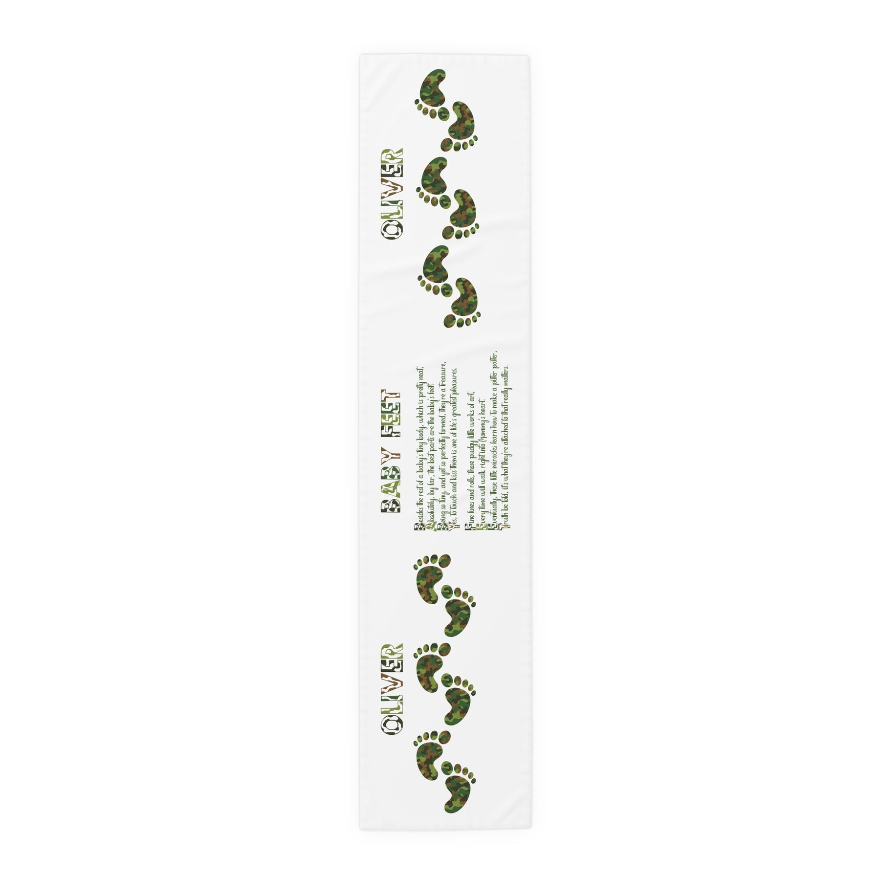 Add warmth and creativity to any baby shower with this beautiful Baby Steps acrostic poem table runner. The design features an acrostic poem that spells out Baby Feet and heartfelt prose. The adorable design and font make it a unique addition to any party celebrating a newborn's arrival. Perfect for adding a pop to the table setting, this runner creates a fun atmosphere. Care instructions: machine wash cold on a gentle cycle with mild detergent. Do not bleach. Line dry. To personalize, add the baby's first name at checkout. A $5.00 personalization fee will be added to your cart.