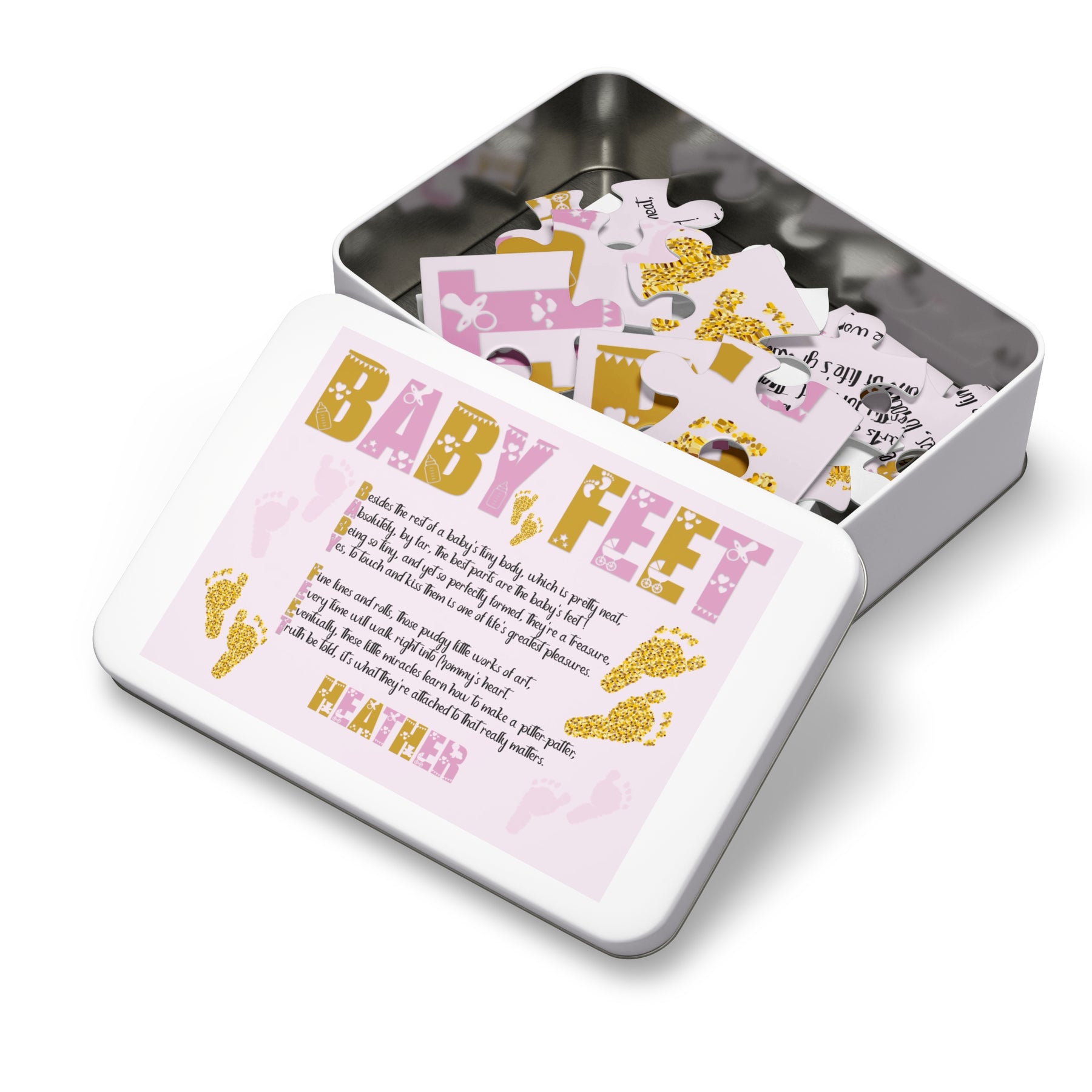Take a look at this Baby Steps puzzle. It features an adorable design and an acrostic poem that spells out Baby Feet. It’s a fun activity for your baby shower that guests can enjoy throughout the party. They’re sure to love it, and it also makes a lovely keepsake or a gift for another new mom. The puzzle is made from sturdy board with a glossy finish and comes in a gift-ready box that highlights the design. Choose from various sizes. To personalize, add the baby's first name at checkout. A $5.00 personalization fee will be added to your cart.