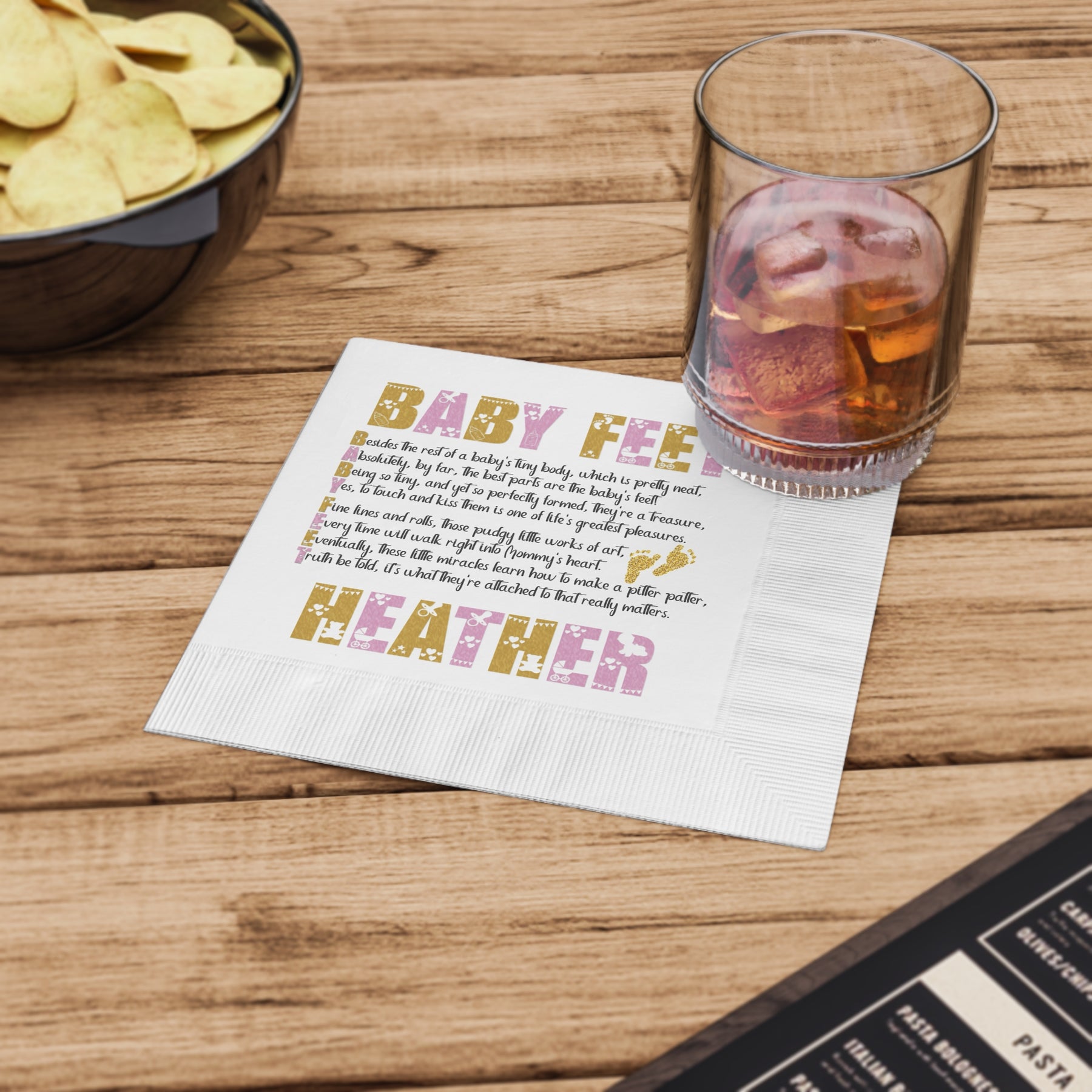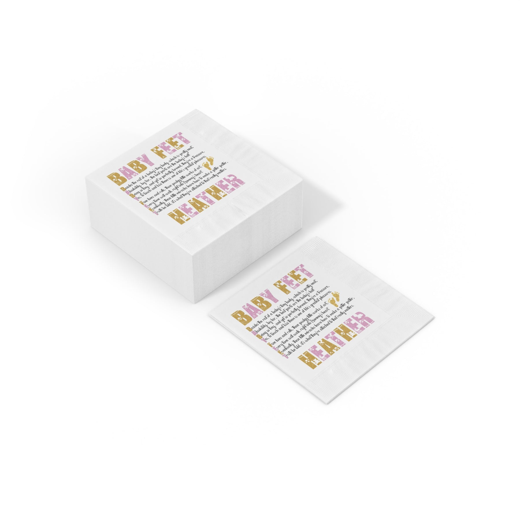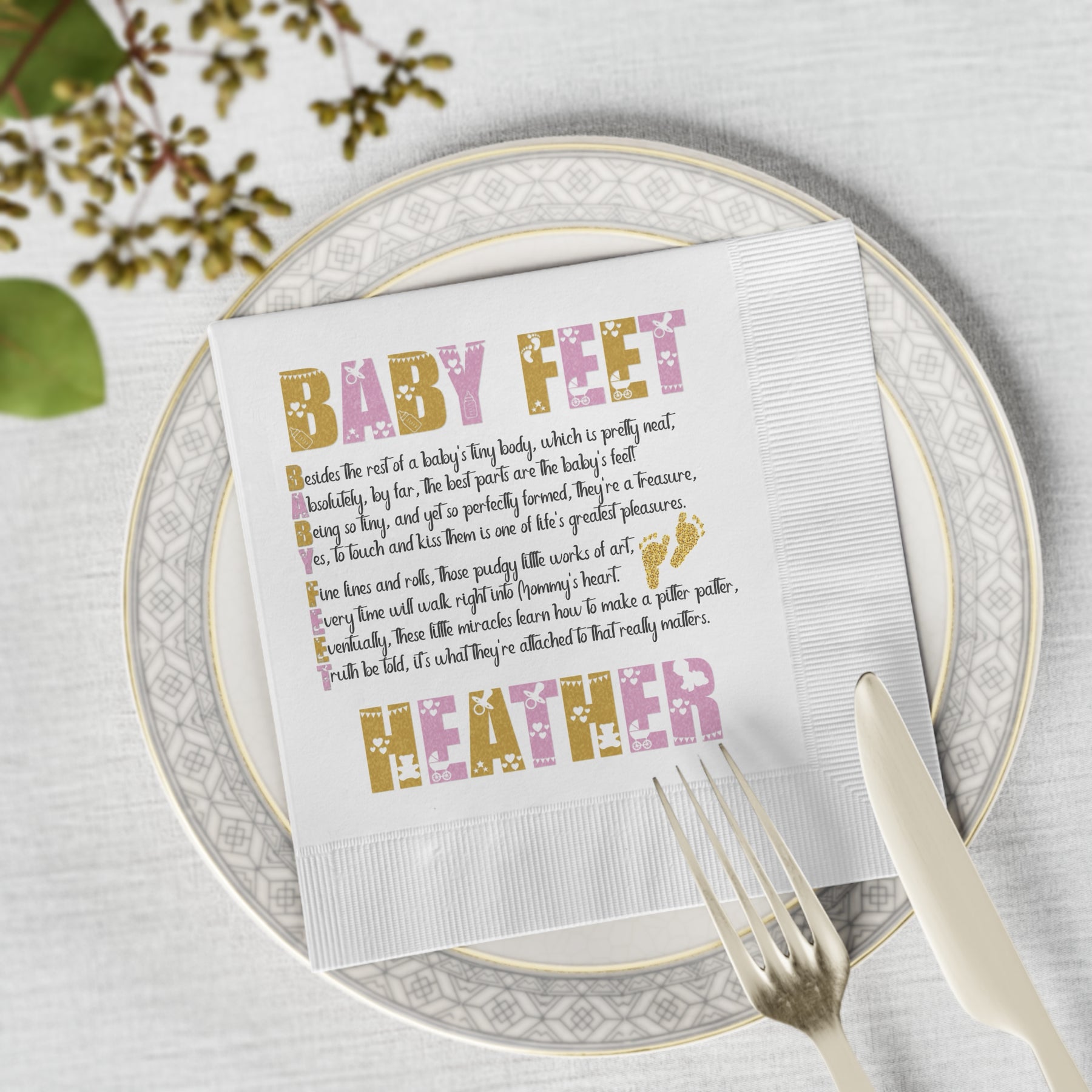 Transform the atmosphere of any baby shower with Baby Steps Napkins. This darling design features an adorable baby body suit design with polka dots, and an acrostic poem spelling out Baby Feet with a heartfelt message to welcome a new baby. You can create the perfect look for the special occasion. To personalize, add the baby's first name at checkout. A $5.00 personalization fee will be added to your cart.