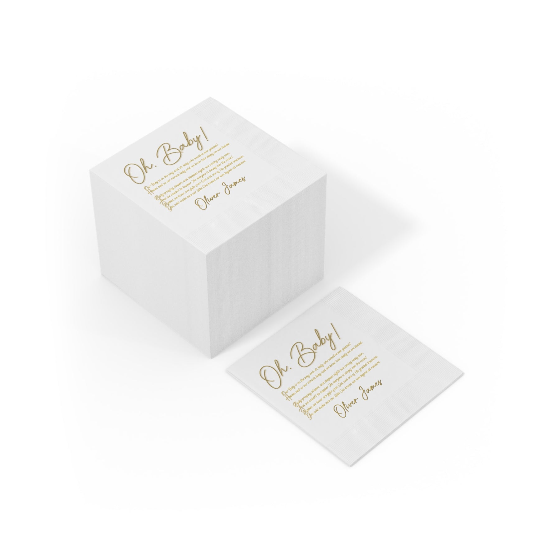 Moments in Rhyme's "Baby Steps" Collection features these soft, three-ply white coined napkins spelling out "Oh, Baby" with a heartfelt, sweet acrostic poem. With a smooth texture and coined edge borders, these napkins are perfect for any baby shower. Add the "Oh, Baby" selection of matching products, including a table runner, a puzzle, and a backdrop. To personalize these napkins, enter the baby's name upon checkout.