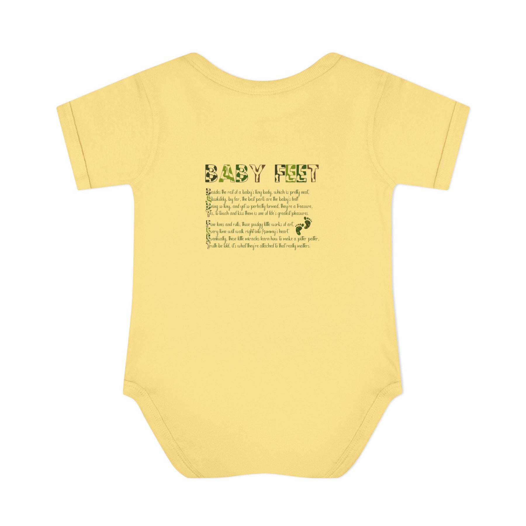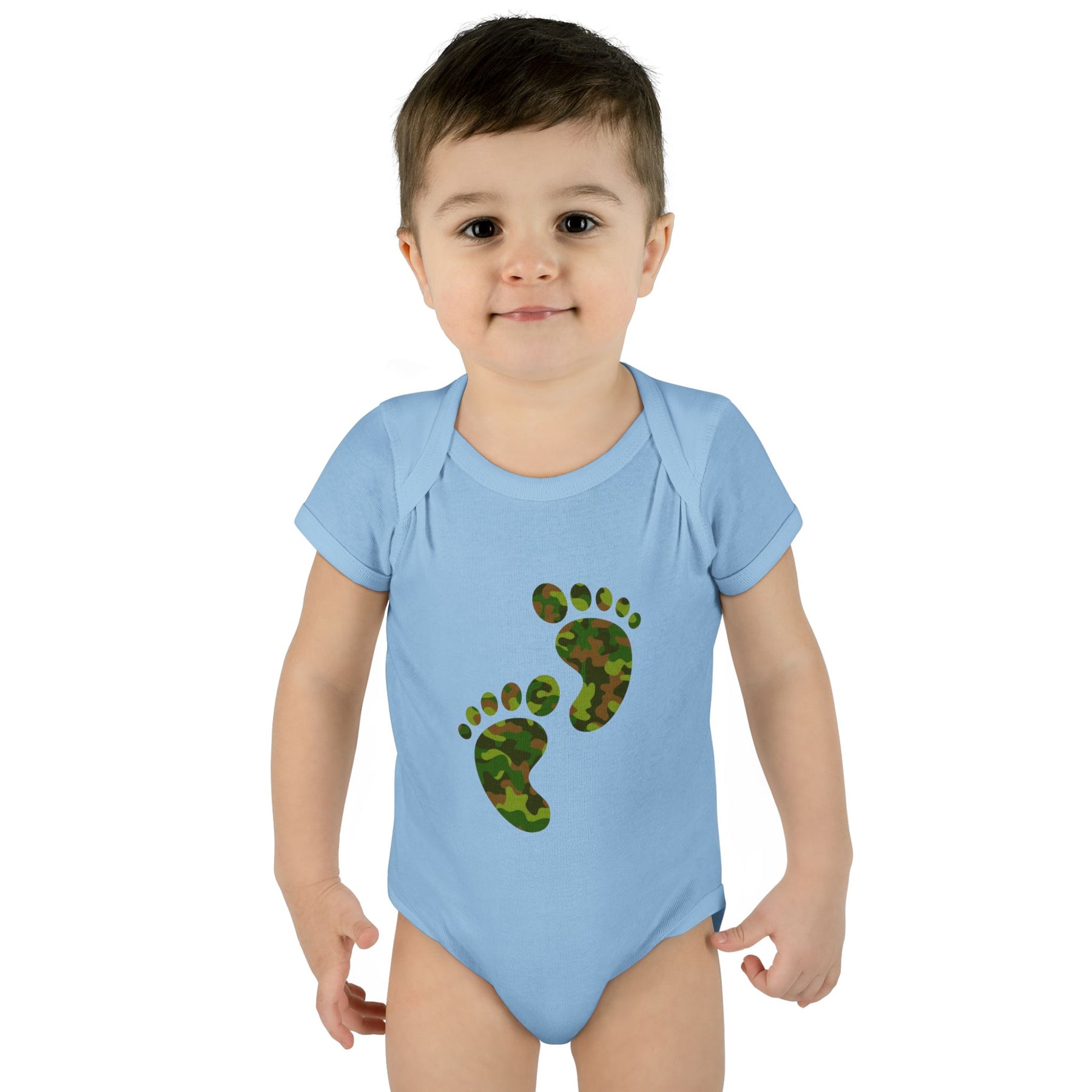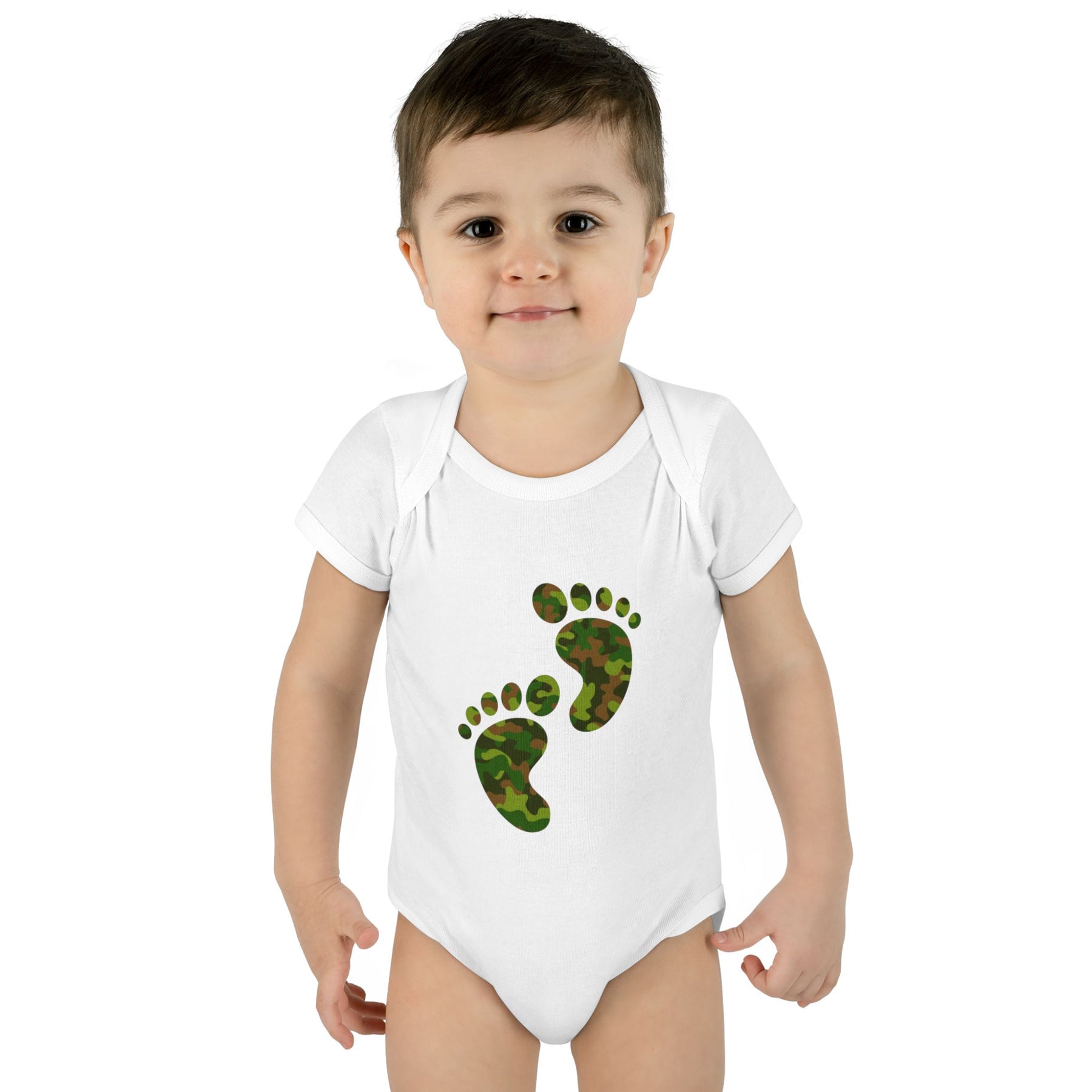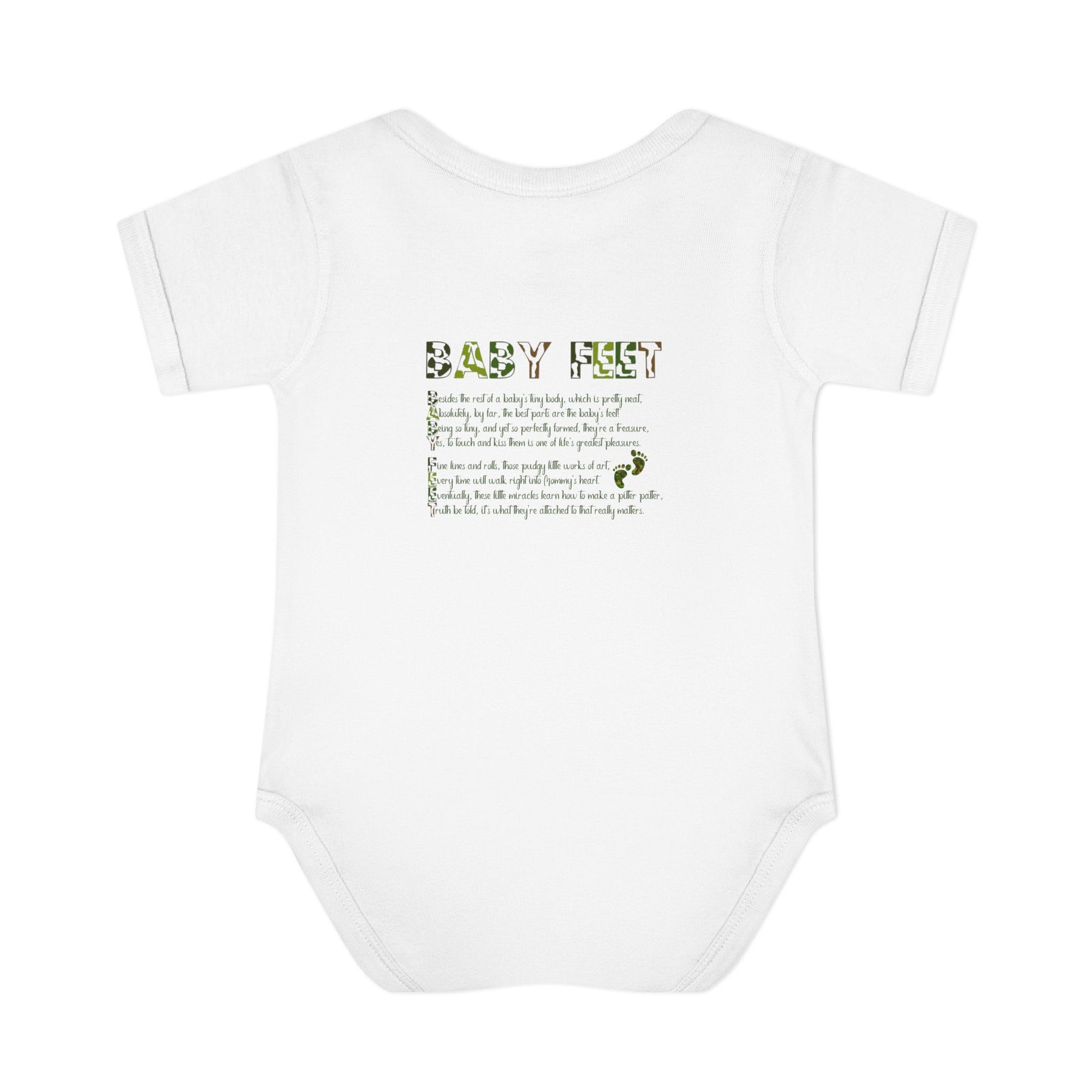 Our Baby Steps acrostic poem bodysuit collection is essential for any baby's wardrobe. This one spells out Baby Feet and features an adorable camo font and a precious design. Made of 100% ring-spun cotton, these bodysuits are comfortable and gentle on baby's skin. Lap shoulders and a three-snap closure make dressing easy for parents. Perfect for everyday wear or as a thoughtful gift for a baby shower. Double-needle ribbed binding creates a clean garment line, and side seams add structure and shape. The light fabric is 100% combed ringspun cotton. Do not iron or dry-clean. Machine wash cold. Use non-chlorine bleach as needed. Tumble dry on low heat.