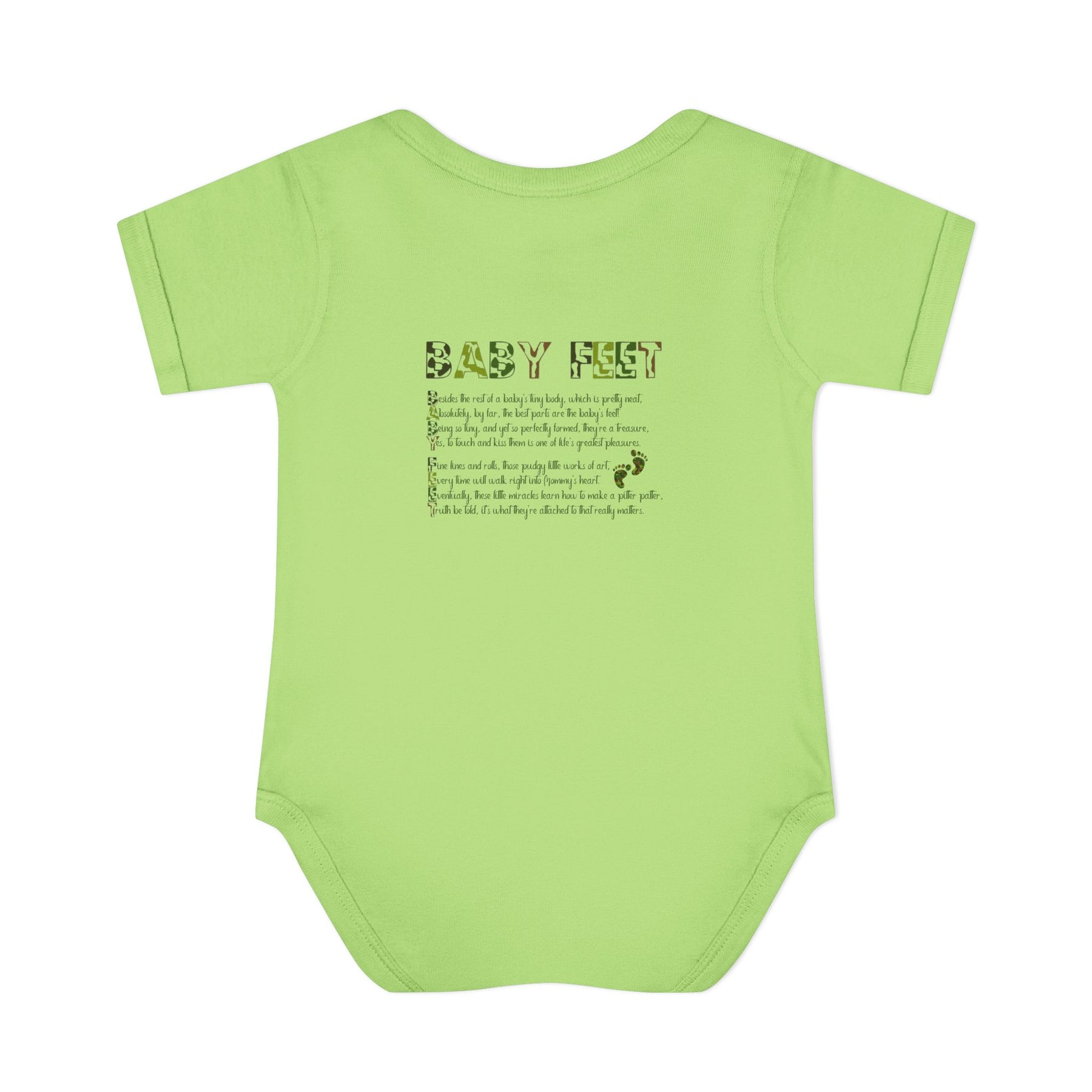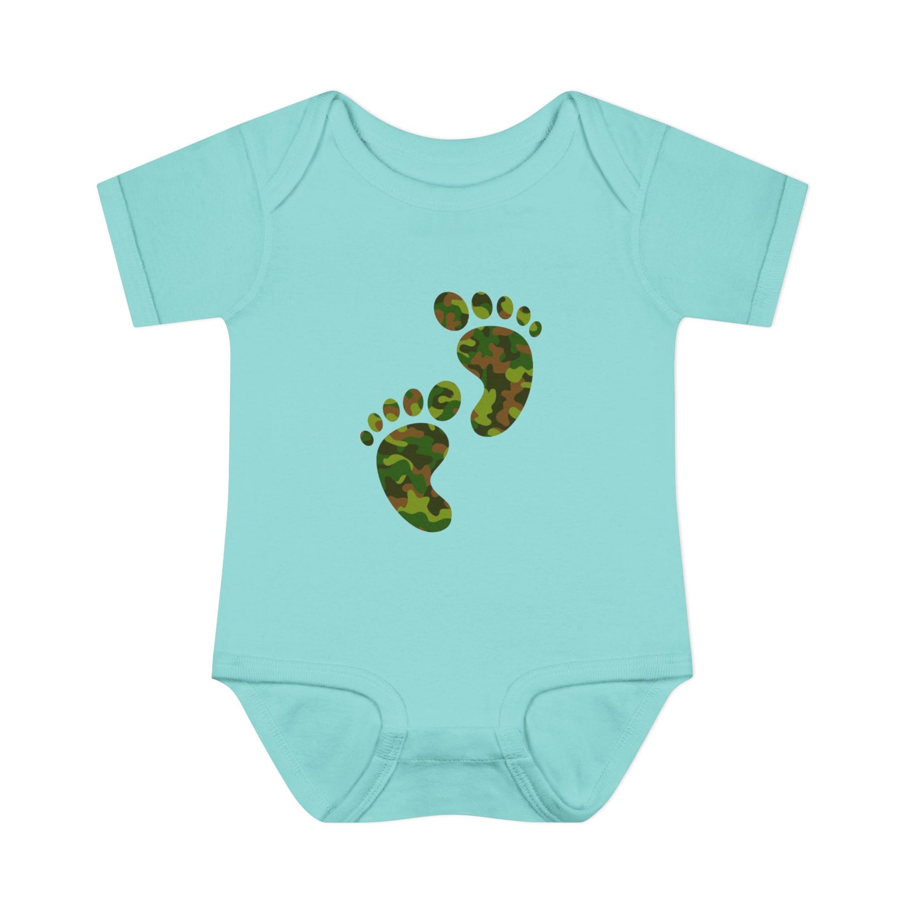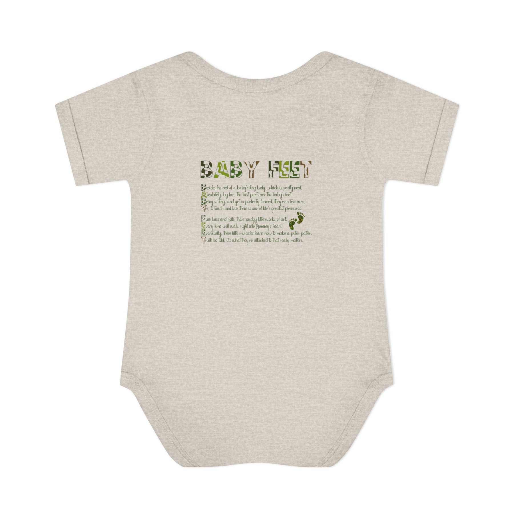 Our Baby Steps acrostic poem bodysuit collection is essential for any baby's wardrobe. This one spells out Baby Feet and features an adorable camo font and a precious design. Made of 100% ring-spun cotton, these bodysuits are comfortable and gentle on baby's skin. Lap shoulders and a three-snap closure make dressing easy for parents. Perfect for everyday wear or as a thoughtful gift for a baby shower. Double-needle ribbed binding creates a clean garment line, and side seams add structure and shape. The light fabric is 100% combed ringspun cotton. Do not iron or dry-clean. Machine wash cold. Use non-chlorine bleach as needed. Tumble dry on low heat.