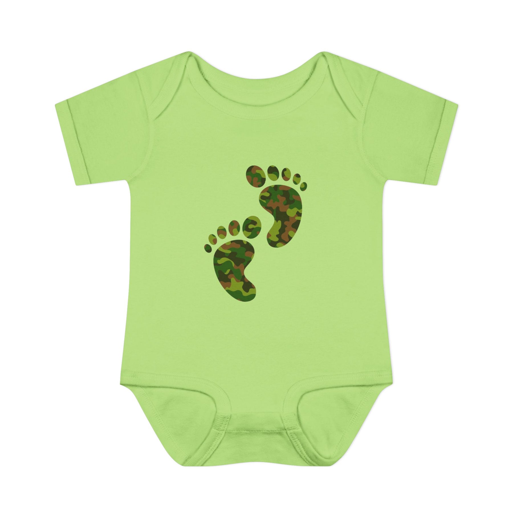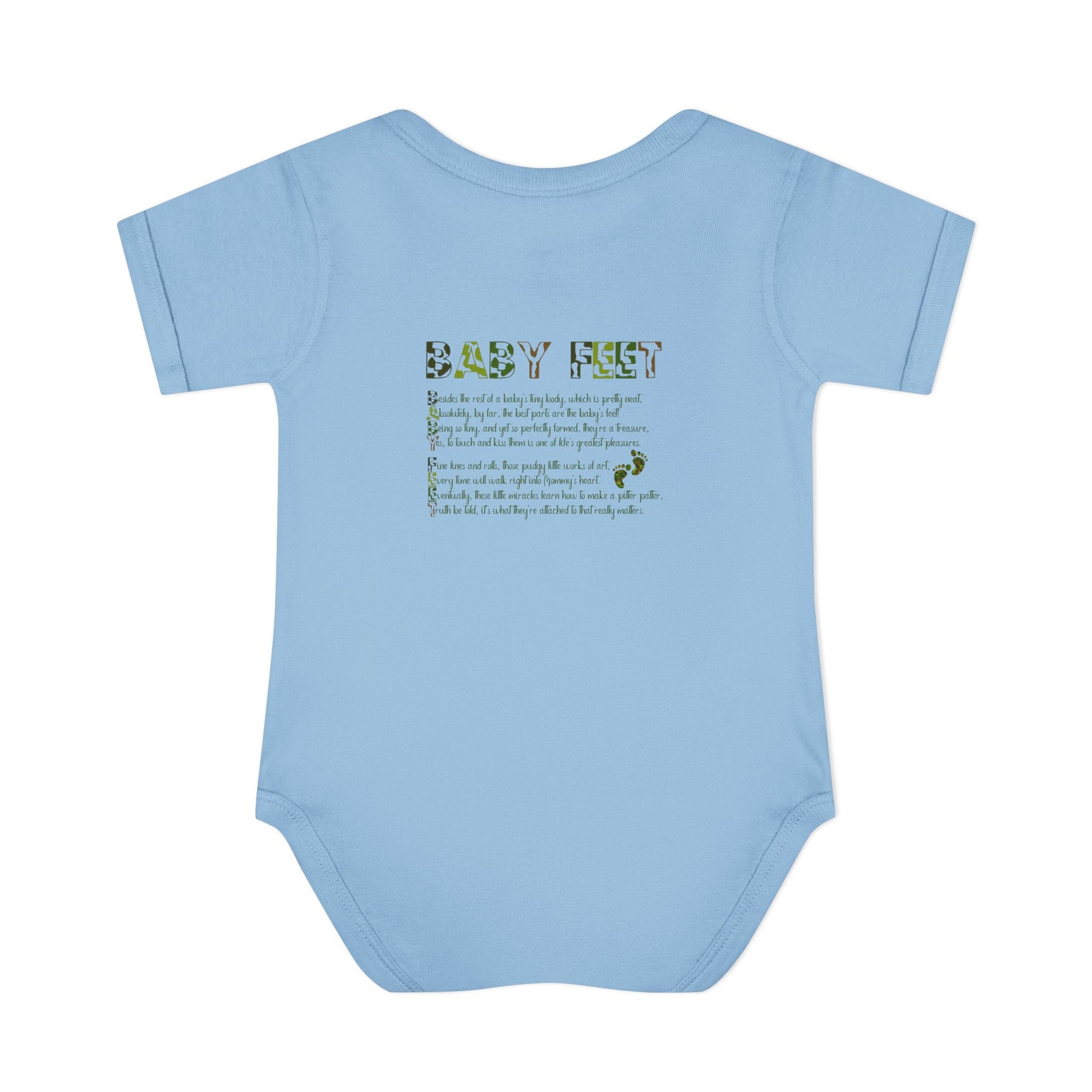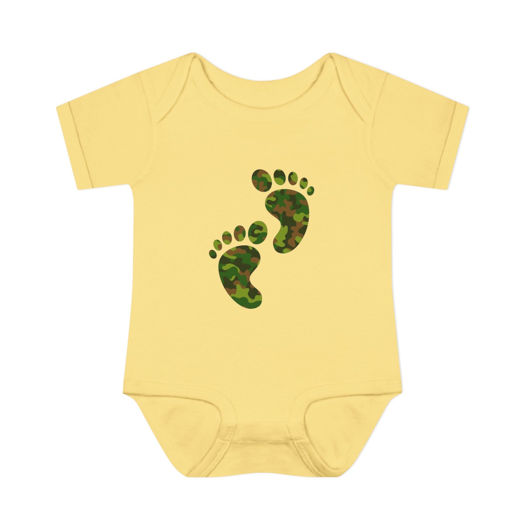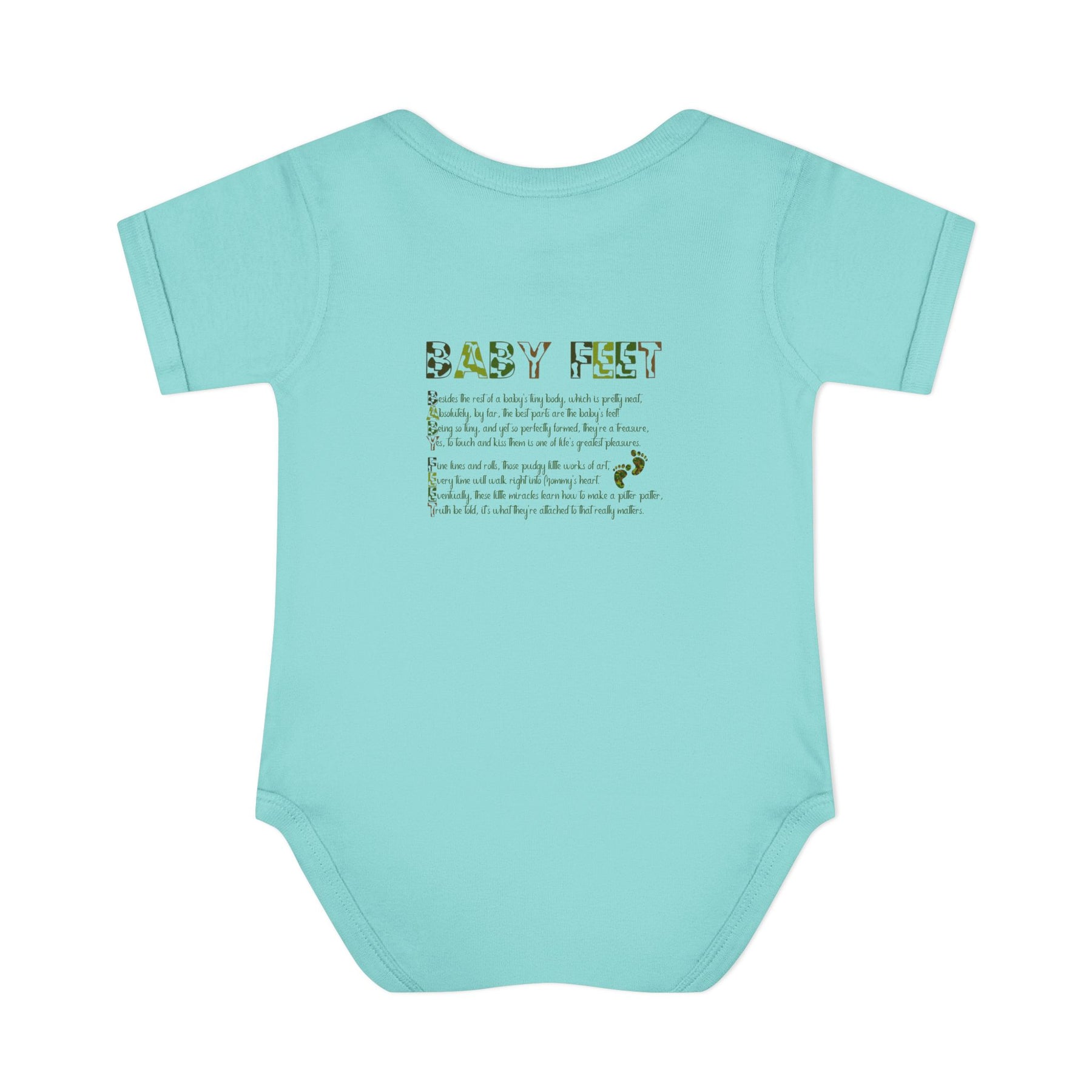 Our Baby Steps acrostic poem bodysuit collection is essential for any baby's wardrobe. This one spells out Baby Feet and features an adorable camo font and a precious design. Made of 100% ring-spun cotton, these bodysuits are comfortable and gentle on baby's skin. Lap shoulders and a three-snap closure make dressing easy for parents. Perfect for everyday wear or as a thoughtful gift for a baby shower. Double-needle ribbed binding creates a clean garment line, and side seams add structure and shape. The light fabric is 100% combed ringspun cotton. Do not iron or dry-clean. Machine wash cold. Use non-chlorine bleach as needed. Tumble dry on low heat.
