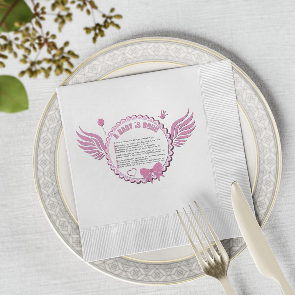 Add gentle charm to your table with our Baby Steps Napkins. Each napkin features a unique acrostic poem where sweet phrases come to life—the first letter of each line spelling out the phrase. These aren't your typical napkins; they're carefully crafted celebrations of language and the beauty found in life's simple moments. Perfect for enhancing the decor and ambiance of a baby shower or celebrating the amazing arrival of a newborn baby. For those who appreciate the power of words and thoughtful details.