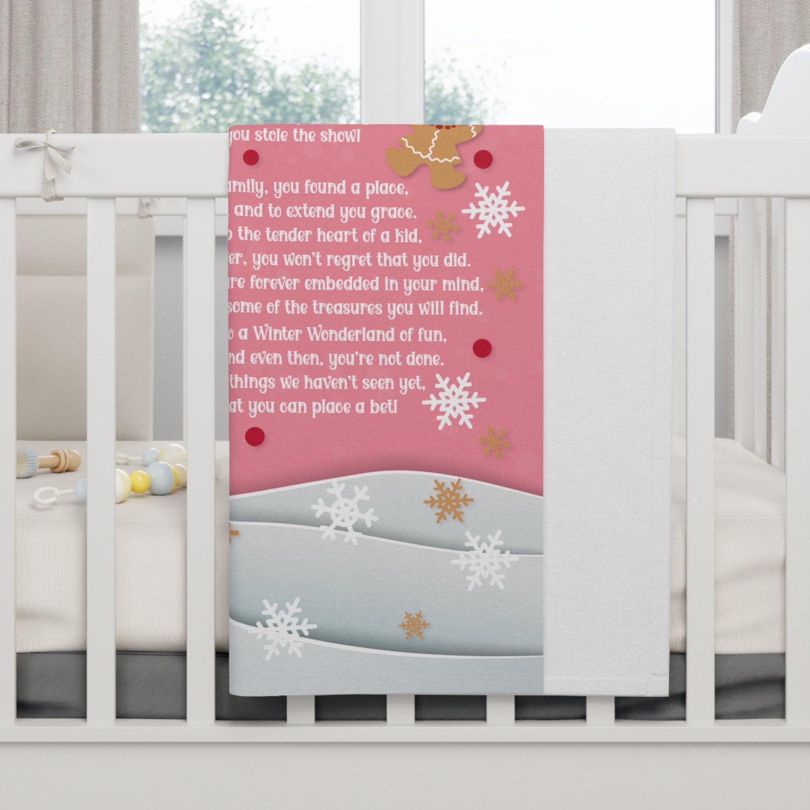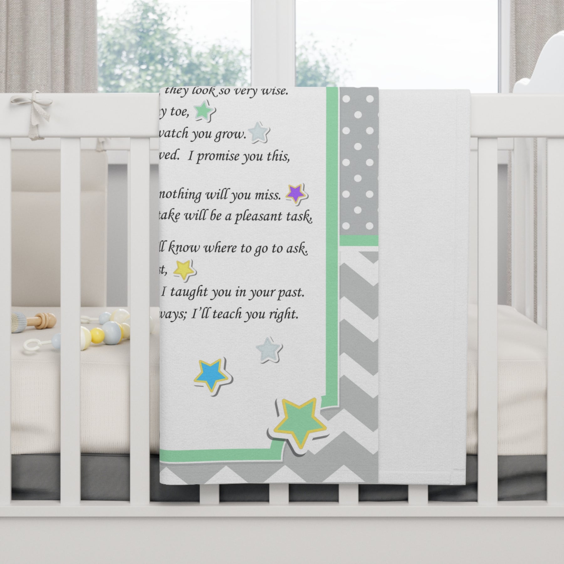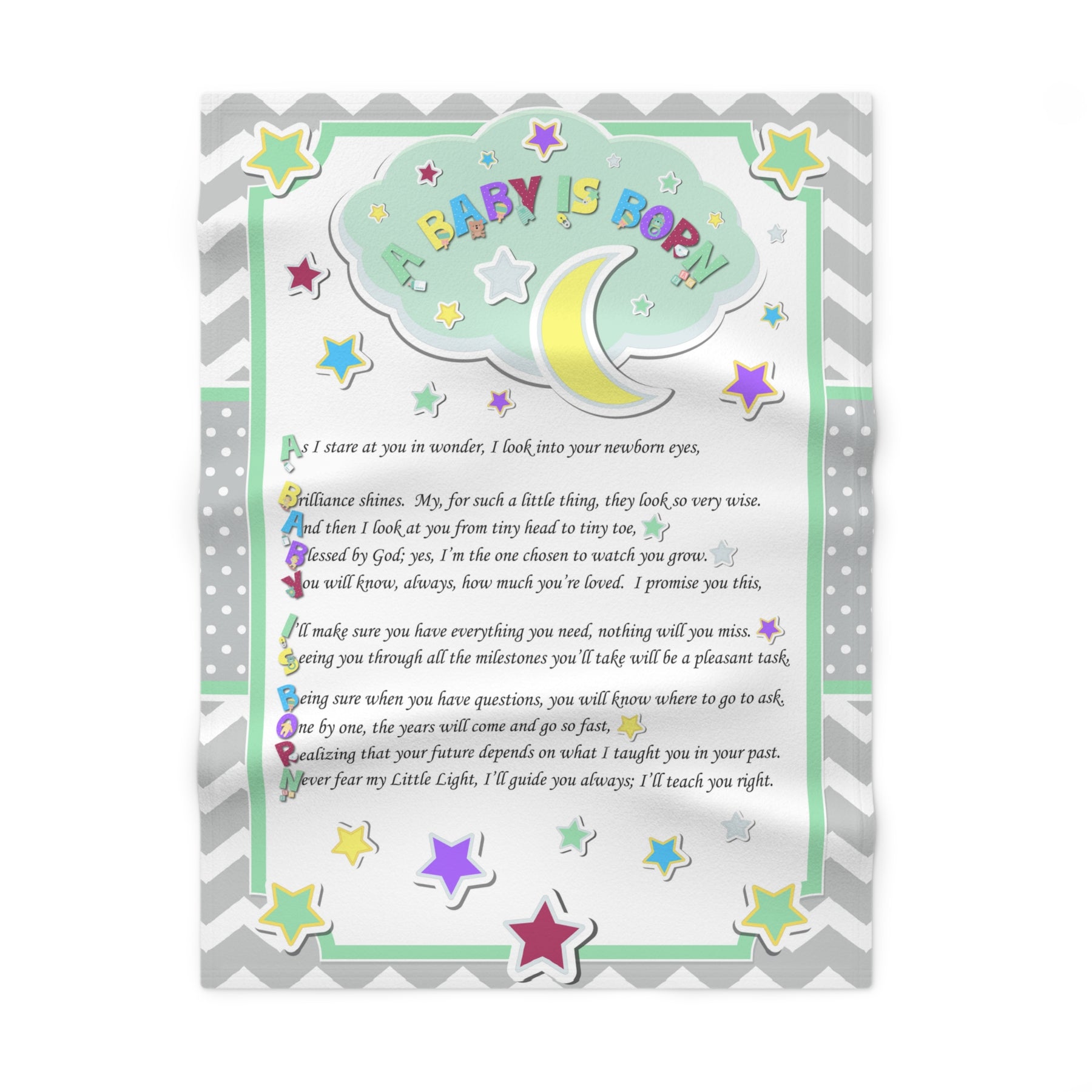 Wrap your little one in warmth and love with our Baby Steps blanket. Adorned with an acrostic poem that spells out A Baby is Born and decorated with the moon and stars. This soft and cozy blanket is perfect for a nursery or as a unique baby shower gift. Celebrate your newest bundle of joy with Moments in Rhyme's beautiful blanket. Delicate, soft and colorful, it's the perfect blanket for children's nurseries. Another thing that makes this blanket so unique is the adorable font. Too cute! Sure to become a lifetime keepsake!