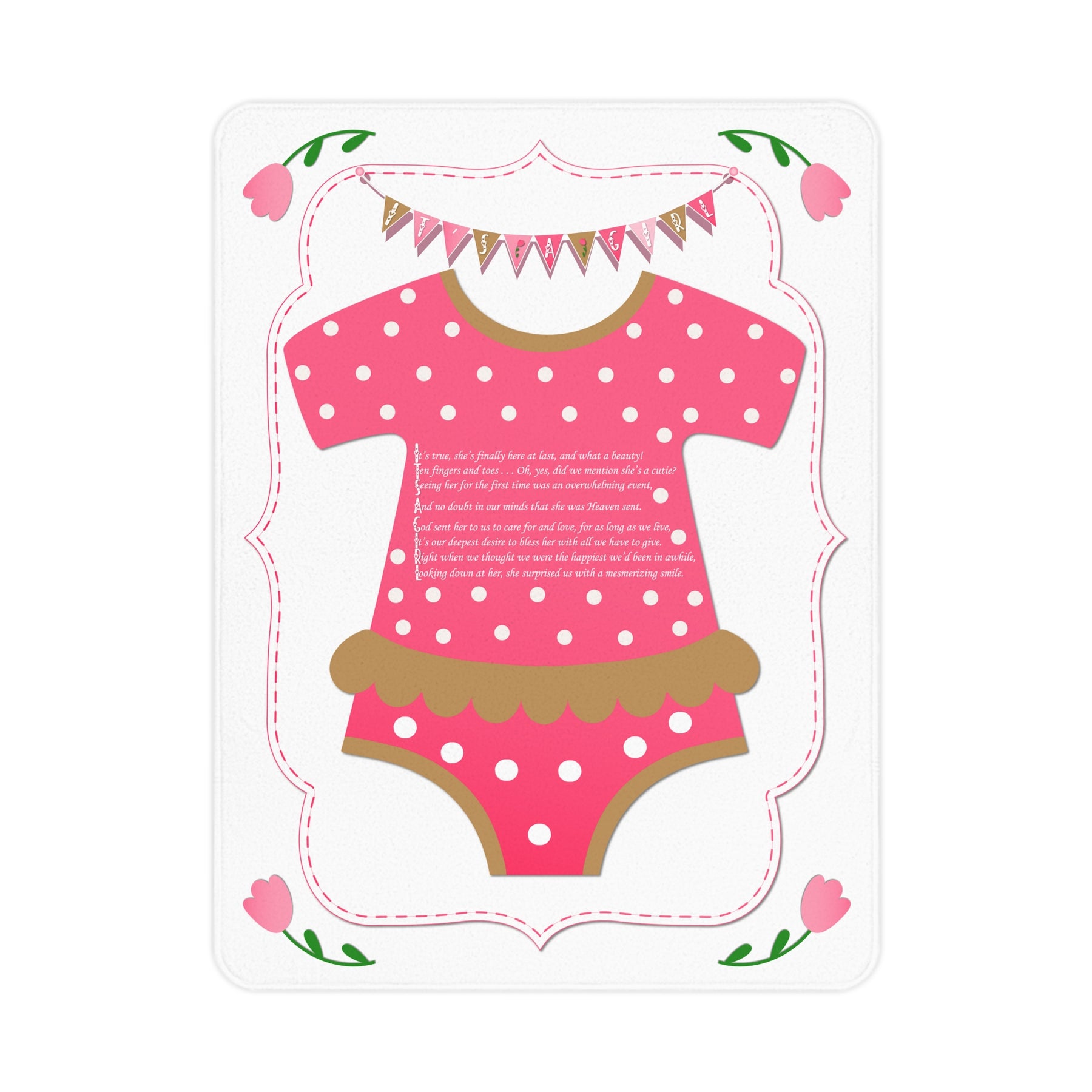 Wrap your little one in warmth and comfort with our delightful "Baby Steps" toddler blanket. It has a beautiful acrostic poem that spells out "It's a Girl". This is perfect for snuggles and playtime. Crafted from ultra-soft fleece, it adds a cozy touch to any nursery or toddler’s room. Its vibrant colors and playful design will brighten up any space, making it an ideal addition to your child’s adventures. Designed for parents who want the best for their toddlers, this blanket fosters a sense of security and warmth. Whether it's for a baby shower, a first birthday, or just a cozy cuddle, this blanket is a thoughtful gift that resonates with love and practicality. Perfect for everyday use or as a cherished keepsake, it celebrates the joy of the early years and the sweet memories created.