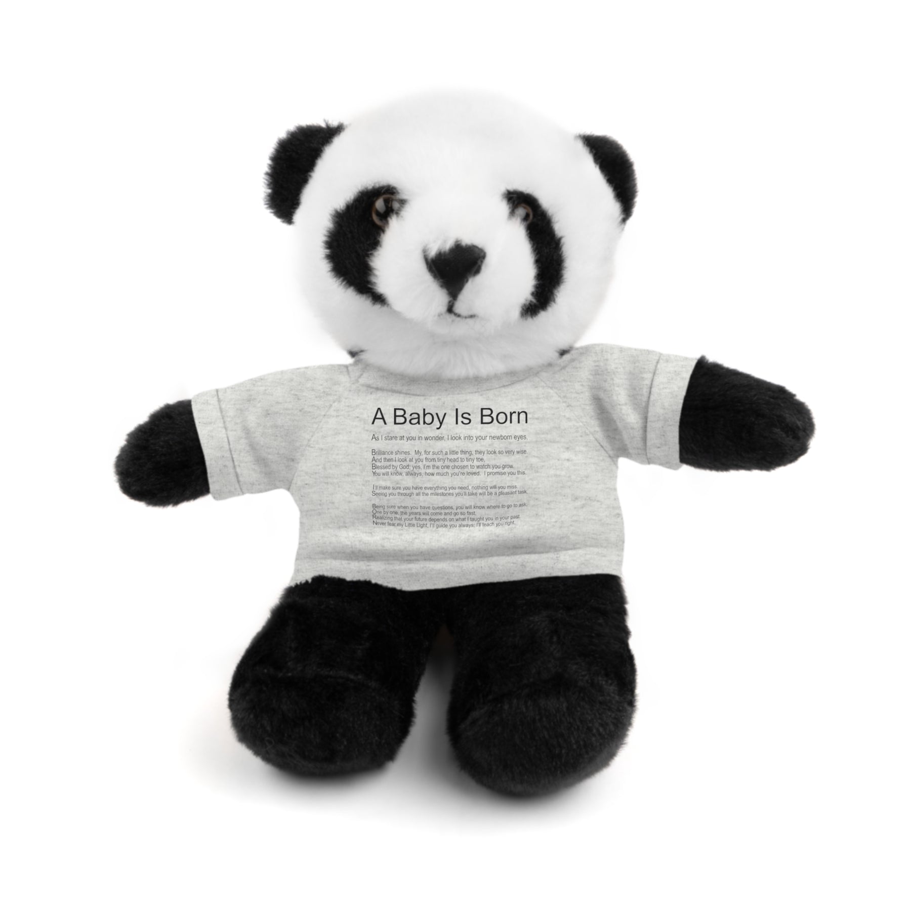 Created to put ear-to-ear smiles on any child, these stuffed animals come with a playful attitude and an acrostic poem spelling out "A Baby is Born". Each plushie is 8" tall, and features polyester and plastic pellet stuffing, while their tees are 100% cotton. Perfect for ages 3+. Available animals: Panda, Lion, Bear, Bunny, Jaguar, and Sheep.