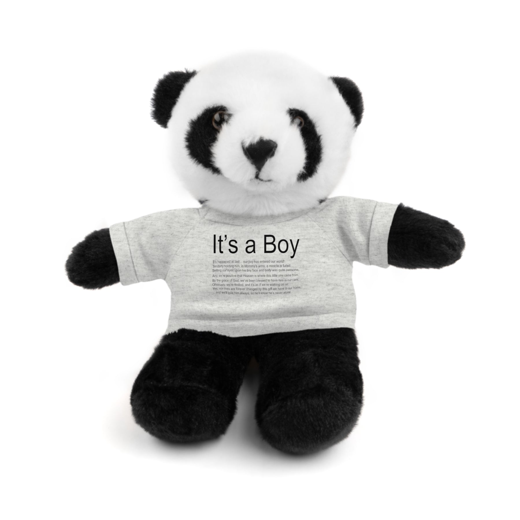 Created to put ear-to-ear smiles on any child, these stuffed animals come with a playful attitude and an acrostic poem spelling out "It's a Boy". Each plushie is 8" tall, features polyester and plastic pellet stuffing, while their tees are 100% cotton. Perfect for ages 3+. Available animals: Panda, Lion, Bear, Bunny, Jaguar, and Sheep.