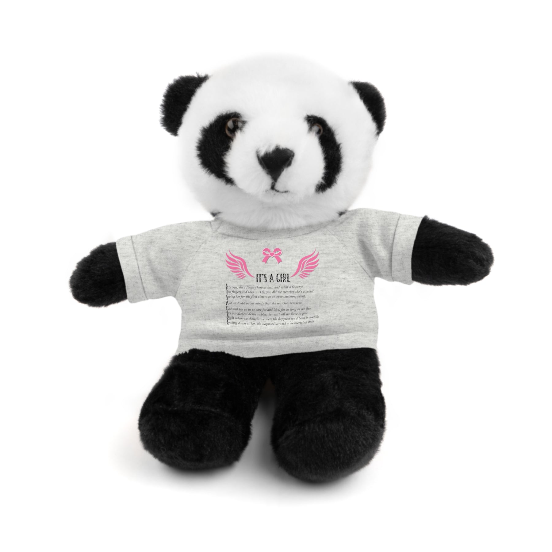 Created to put ear-to-ear smiles on any child, these stuffed animals come with a playful attitude and an acrostic poem spelling out "It's a Girl". Each plushie is 8" tall, features polyester and plastic pellet stuffing, while their tees are 100% cotton. Perfect for ages 3+. Available animals: Panda, Lion, Bear, Bunny, Jaguar, and Sheep.