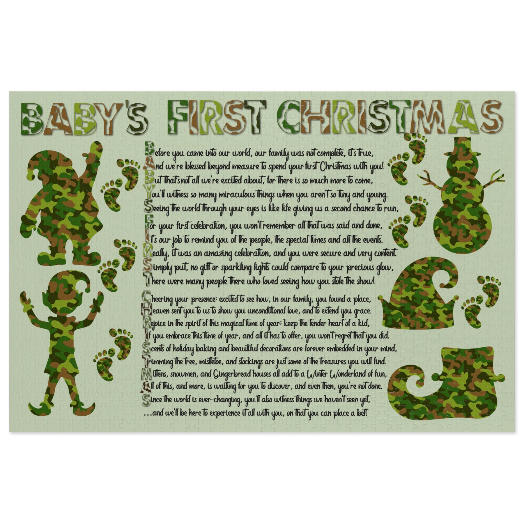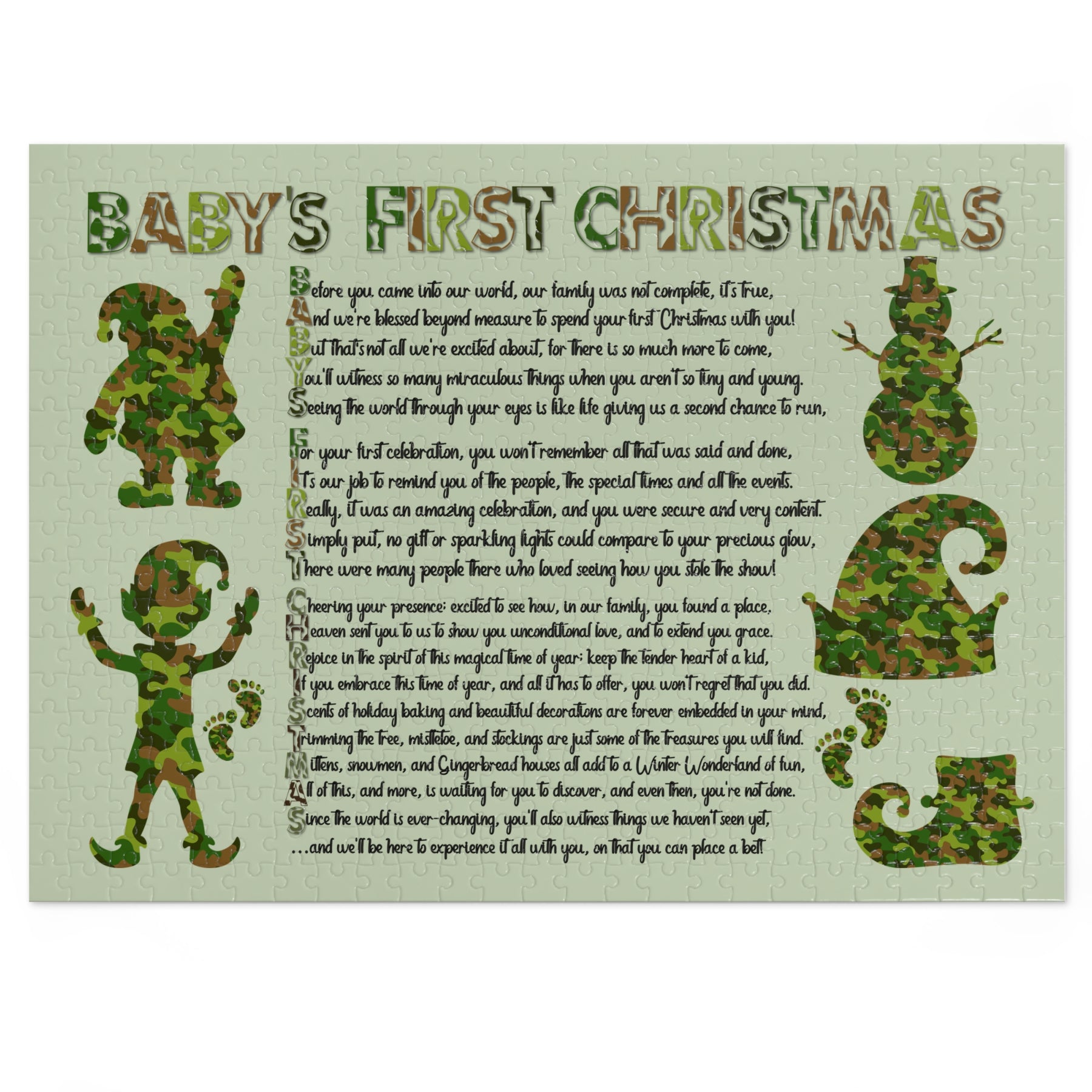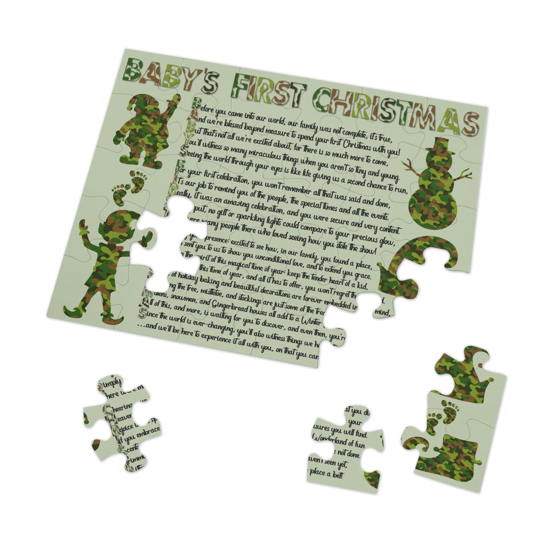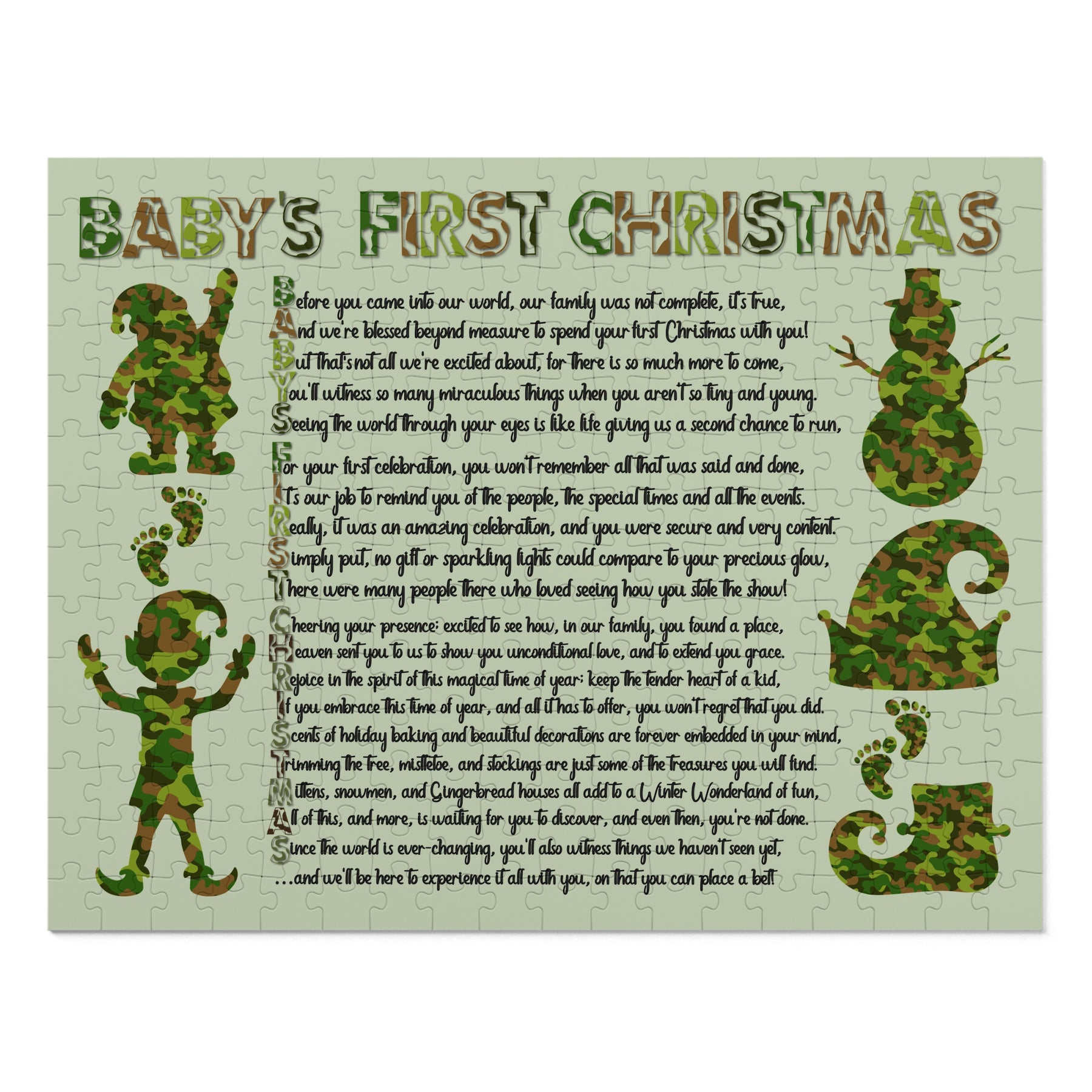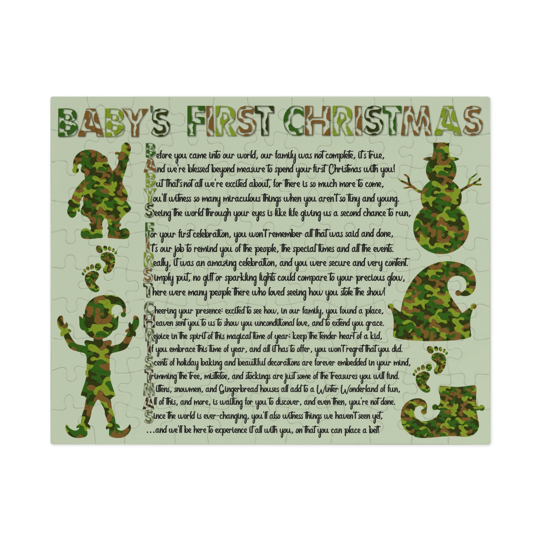Celebrate the holidays with our Baby Steps jigsaw puzzle, featuring an acrostic poem that spells out Baby's First Christmas in a super-cute camo design and camo font. Designed as a lifetime keepsake, this puzzle will encourage your child to play with it each holiday season and remind them of how special they are. The heartfelt poem shares the story of their first Christmas and how much they added to the world, even though they do not remember that time. It makes a thoughtful gift for newborns and is sure to be treasured for years to come. Perfect for anyone marking a baby's first Christmas. Made from sturdy puzzle board with a glossy finish, it comes in a gift-ready tin box that highlights the design. Several sizes are available.