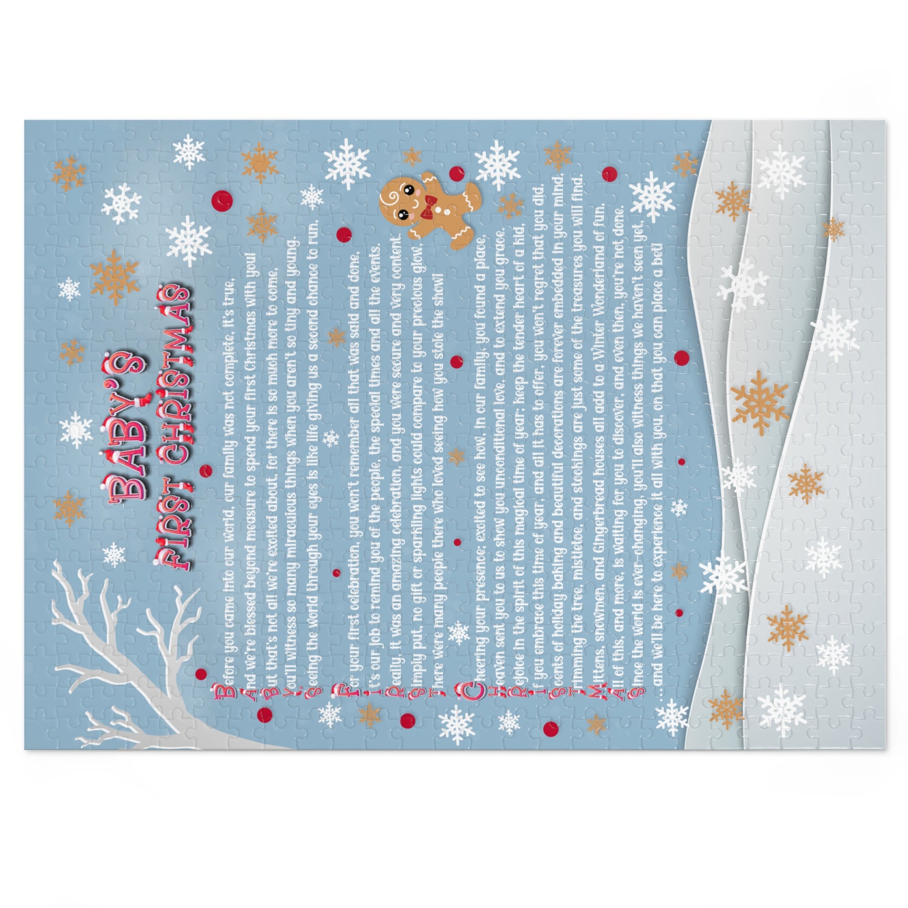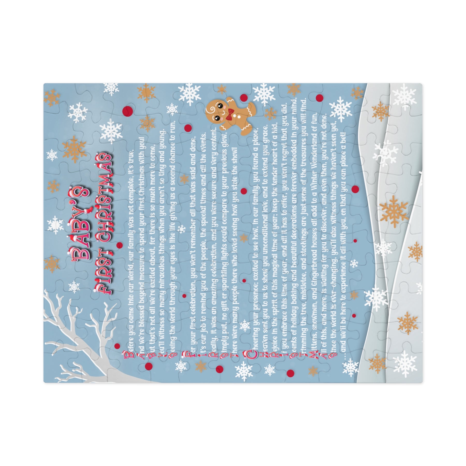 Celebrate the holidays with our Baby Steps jigsaw puzzle, featuring an acrostic poem that spells out Baby's First Christmas in a super-cute Santa hat font. Designed as a lifetime keepsake, this puzzle will encourage your child to play with it each holiday season, reminding them of how special they are. The heartfelt poem shares the story of their first Christmas and how much they contributed to the world, even though they no longer remember that time. It makes a thoughtful gift for newborns and is sure to be treasured for years to come. Perfect for anyone marking a baby's first Christmas. Made from sturdy puzzle board with a glossy finish, it comes in a gift-ready tin box that highlights the design. Several sizes are available.
