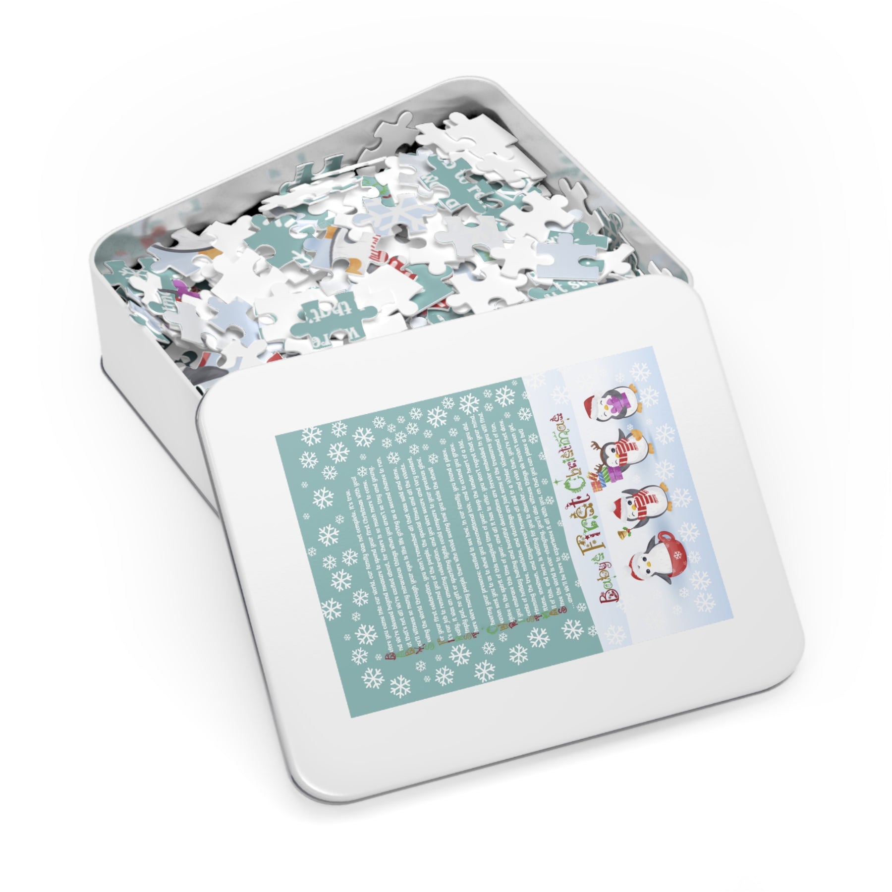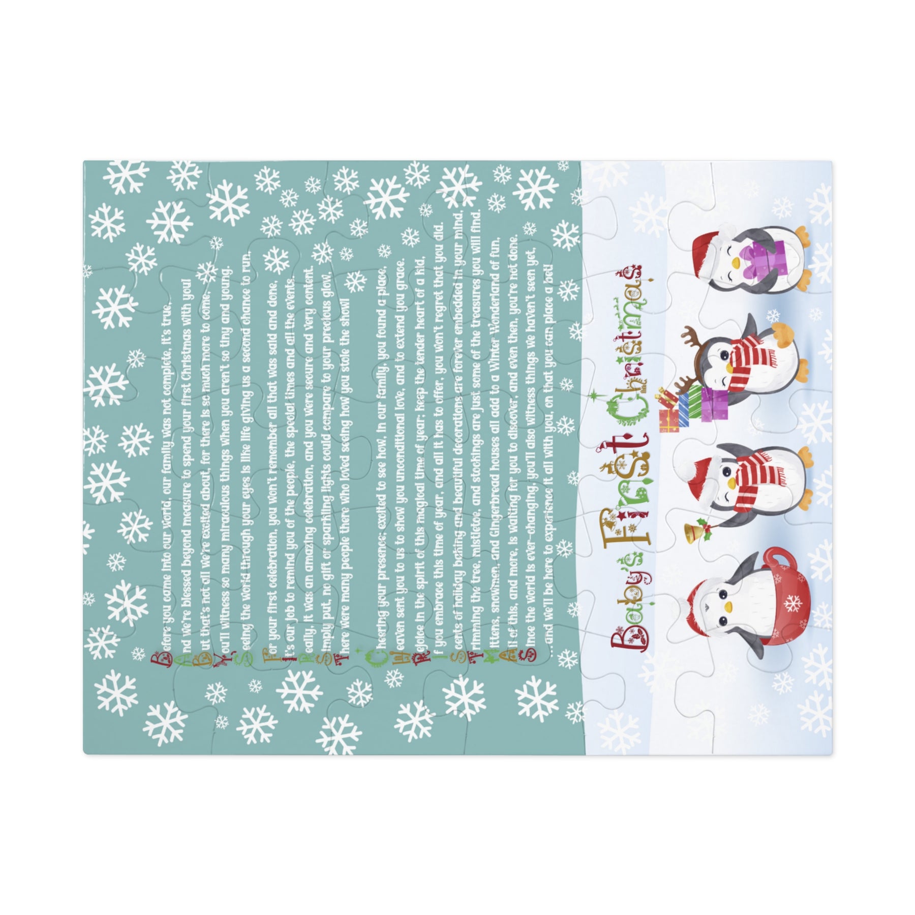 Celebrate the holidays with our Baby Steps jigsaw puzzle, featuring an acrostic poem that spells out Baby's First Christmas in a super-cute Christmas item font. Designed as a lifetime keepsake, this puzzle will encourage your child to play with it each holiday season, reminding them of how special they are. The heartfelt poem shares the story of their first Christmas and how much they added to the world, even though they do not remember that time. It makes a thoughtful gift for newborns and is sure to be treasured for years to come. Perfect for anyone marking a baby's first Christmas. Made from sturdy puzzle board with a glossy finish, it comes in a gift-ready tin box that highlights the design. Several sizes are available.