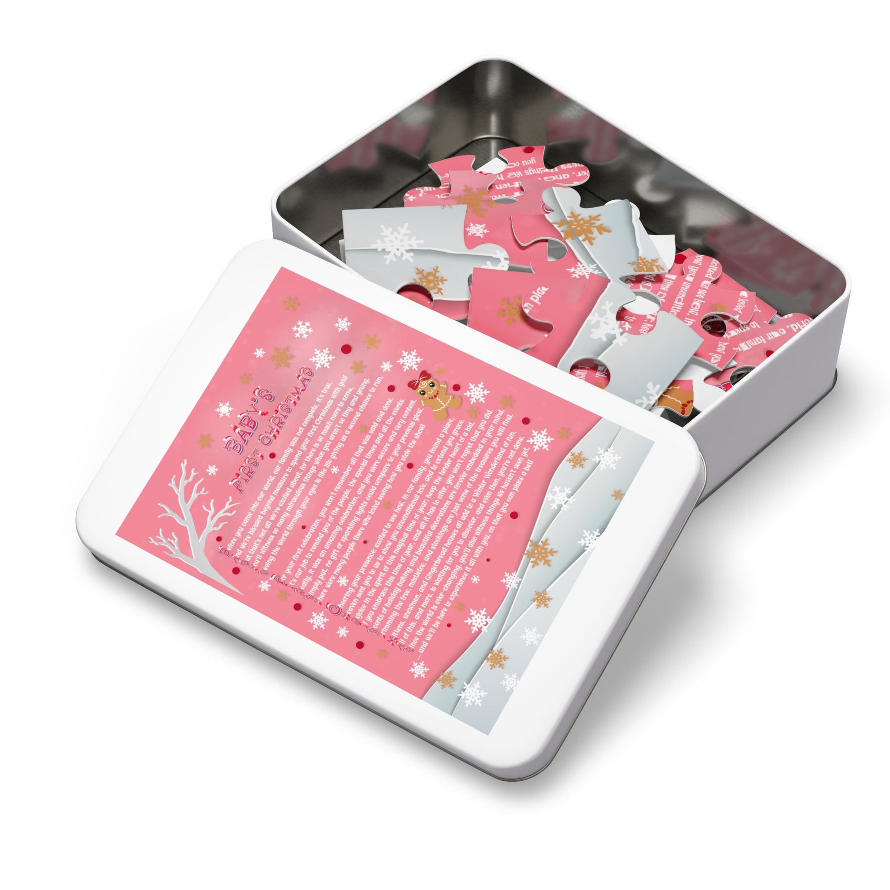 Celebrate the holidays with our Baby Steps jigsaw puzzle, featuring an acrostic poem that spells out Baby's First Christmas in a super-cute Santa hat font. Designed as a lifetime keepsake, this puzzle will encourage your child to play with it each holiday season and remind them of how special they are. The heartfelt poem shares the story of their first Christmas and how much they added to the world, even though they do not remember that time. It makes a thoughtful gift for newborns and is sure to be treasured for years to come. Perfect for anyone marking a baby's first Christmas. Made from sturdy puzzle board with a glossy finish, it comes in a gift-ready tin box that highlights the design. Several sizes are available.