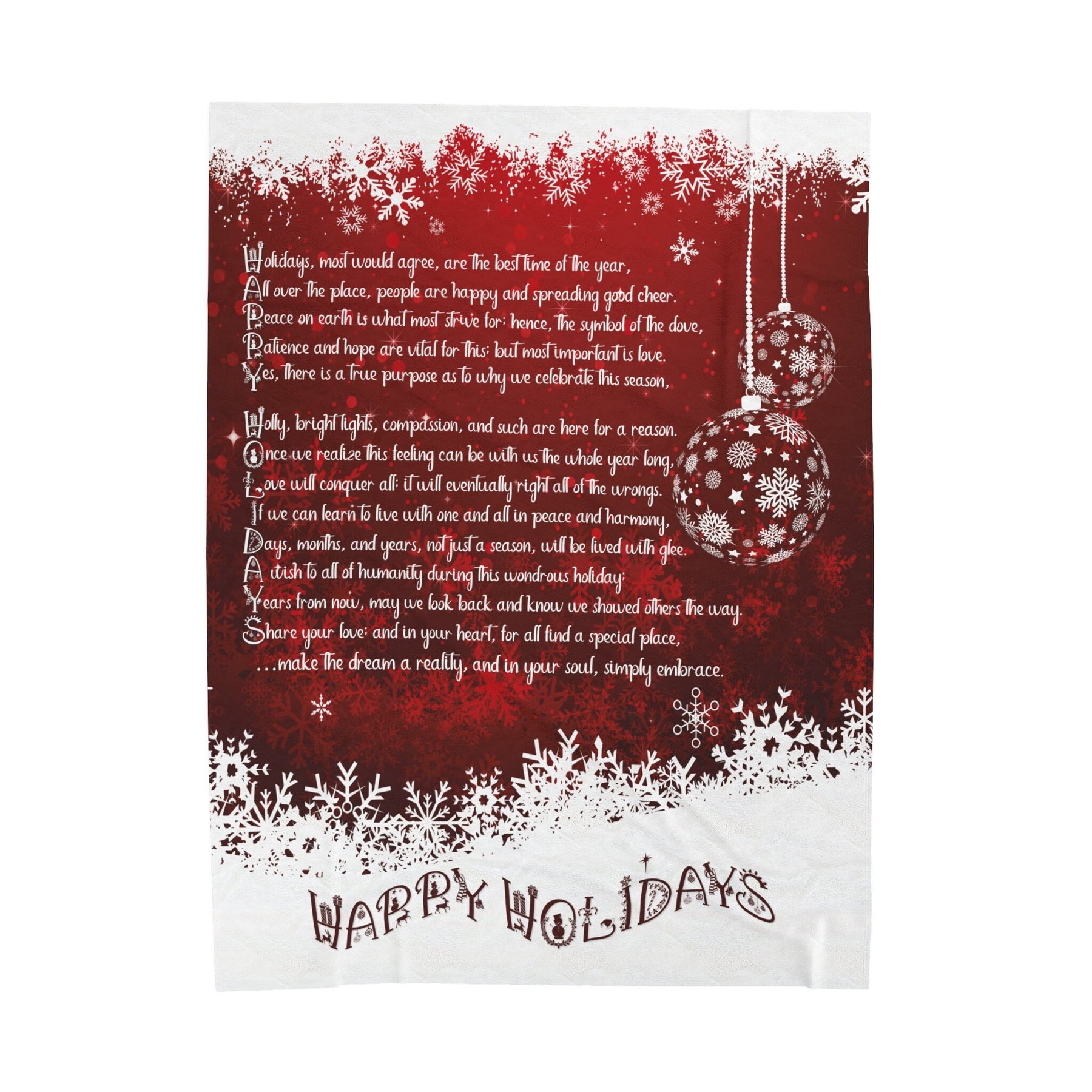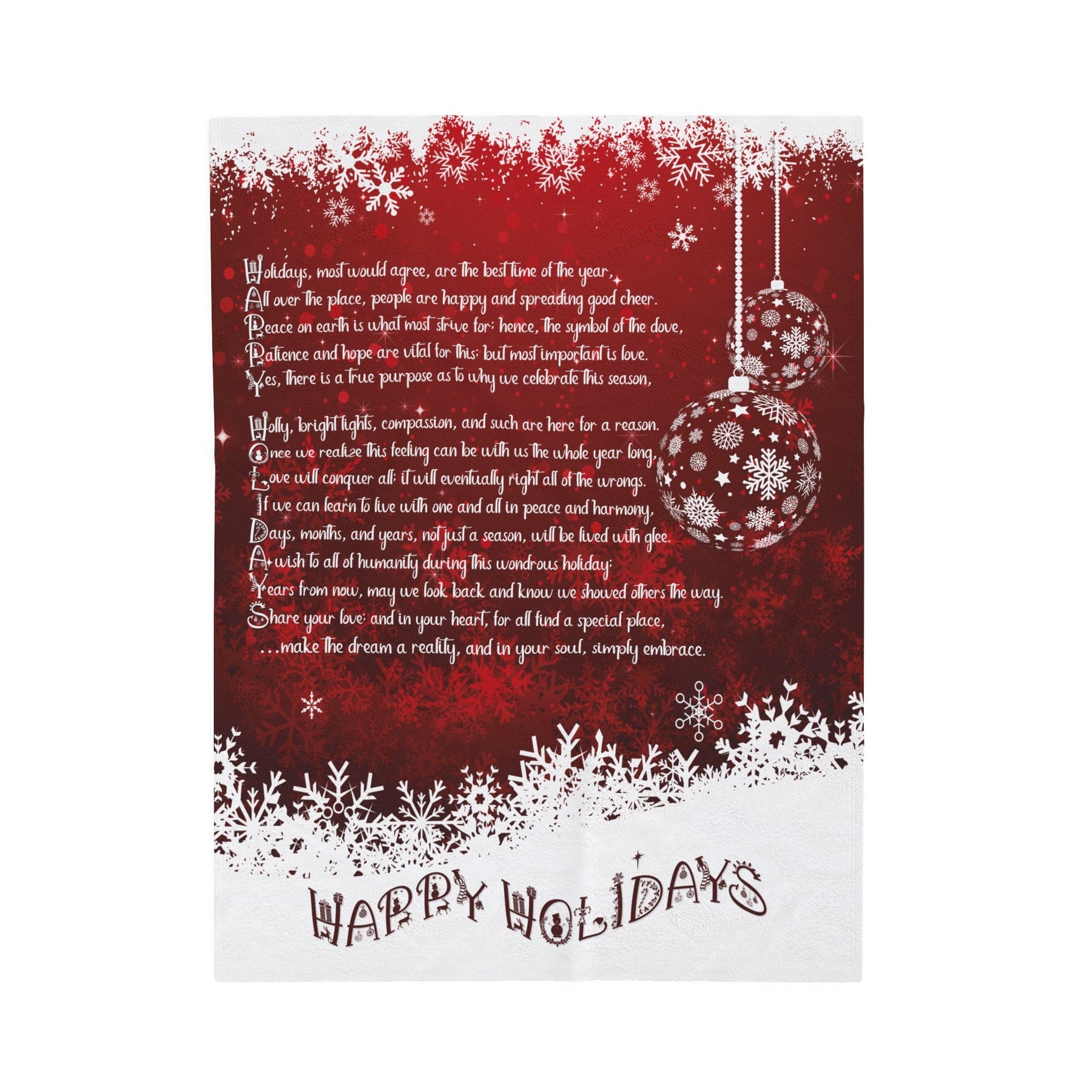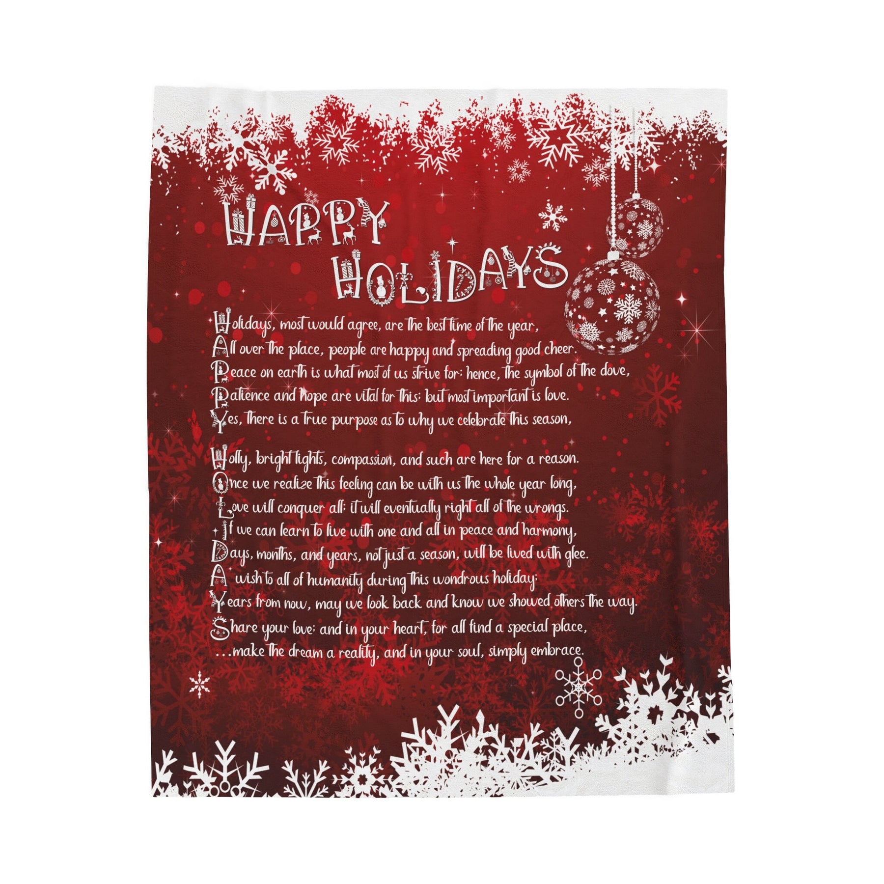 The snuggle is real! Say hello to your new go-to holiday throw. These ultra-comfy velveteen blankets are incredibly plush. Get into the holiday spirit by cozying up with luxurious softness. Our "Happy Holidays" acrostic poem blankets are whimsical, velvety, and bright. Perfect for both outdoor gatherings and chilly winter cuddles. Also makes an awesome present!