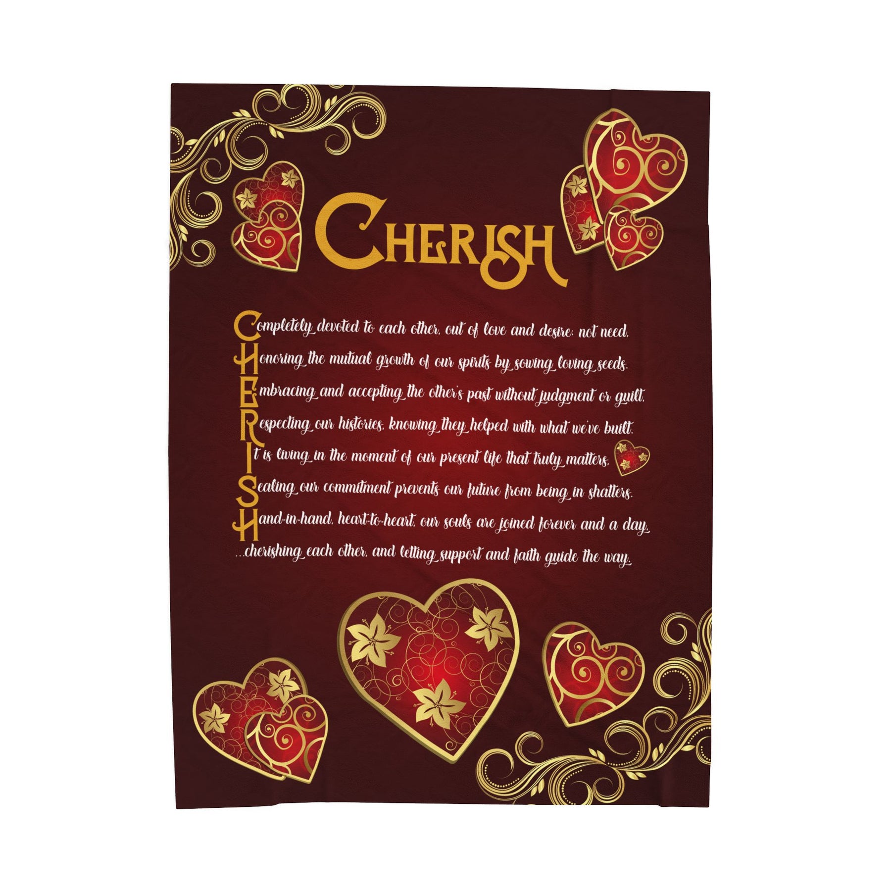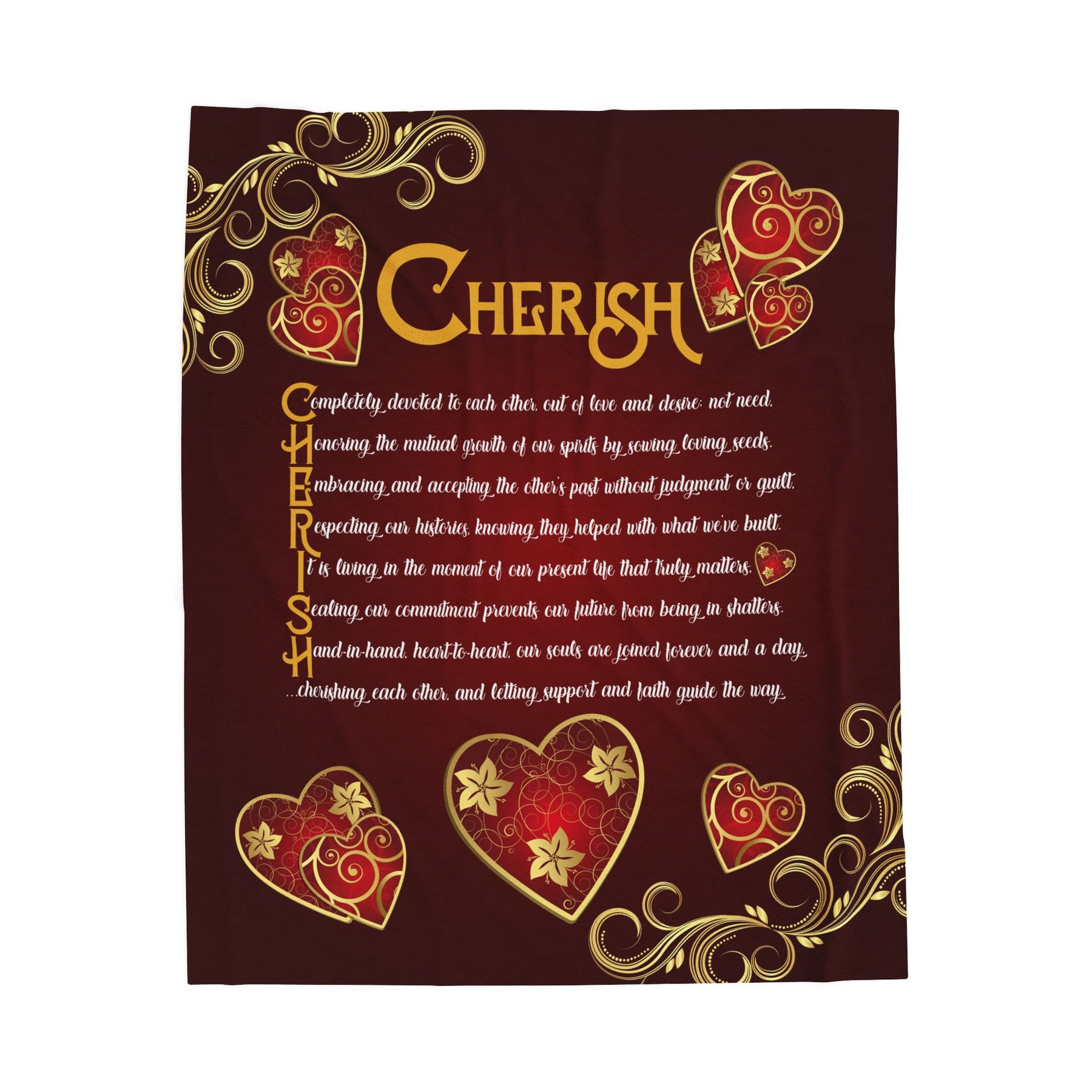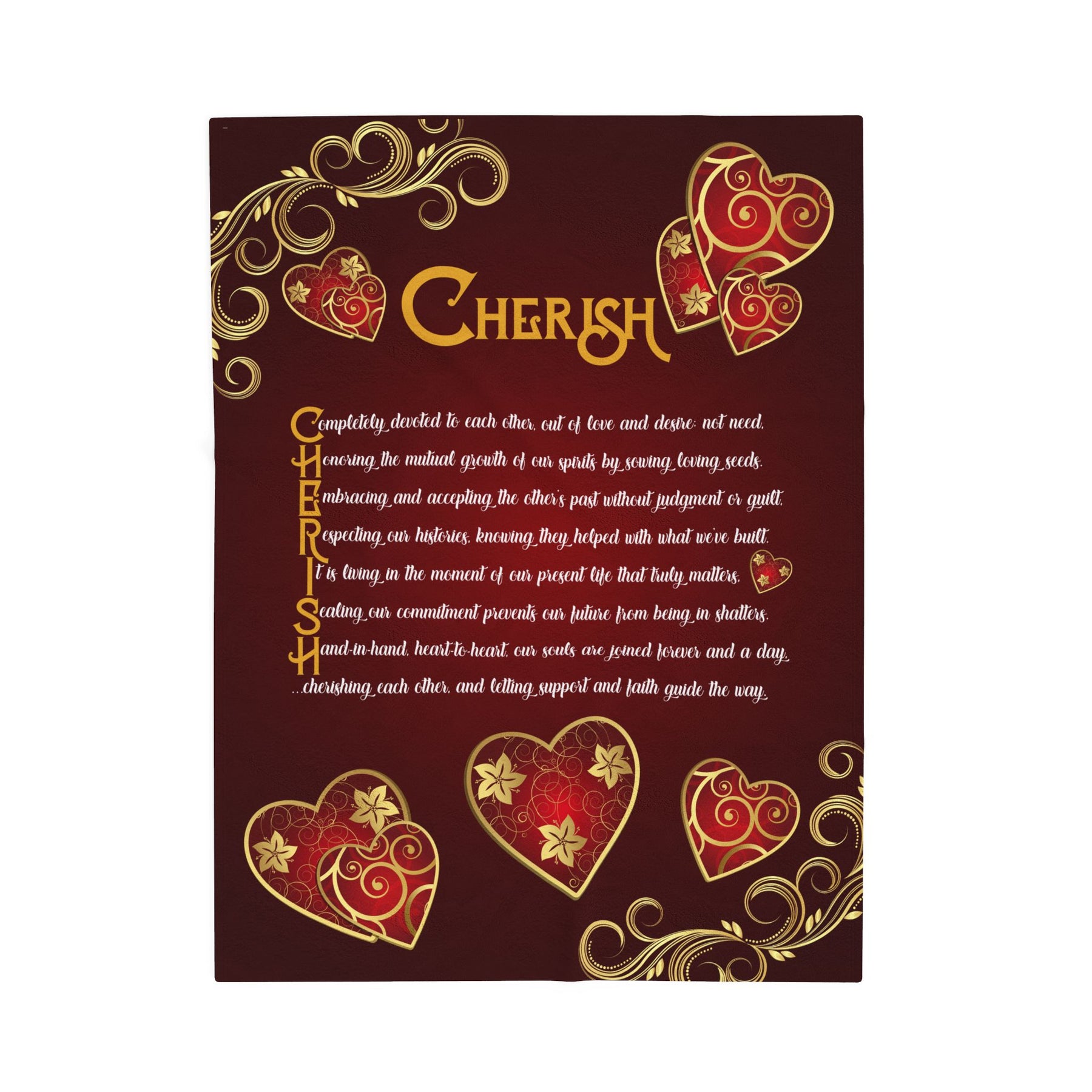 Discover our It’s Just a Phrase Blanket Collection from Moments in Rhyme. This velveteen plush blanket could become your new favorite. It features an acrostic poem that spells out Cherish with extra-large graphics and sweet, sentimental prose, making it a fun and thoughtful Valentine's Day, Christmas, or birthday gift for anyone who loves to snuggle. These blankets are soft, vibrant, and delicate—perfect for outdoor events or cozy winter nights. The unique font adds a special touch. Made from 83% polyester and 17% spandex, the fabric feels exceptionally soft. Available in three sizes. Machine wash in cold water and tumble dry on a low heat setting. Do not bleach or dry-clean.