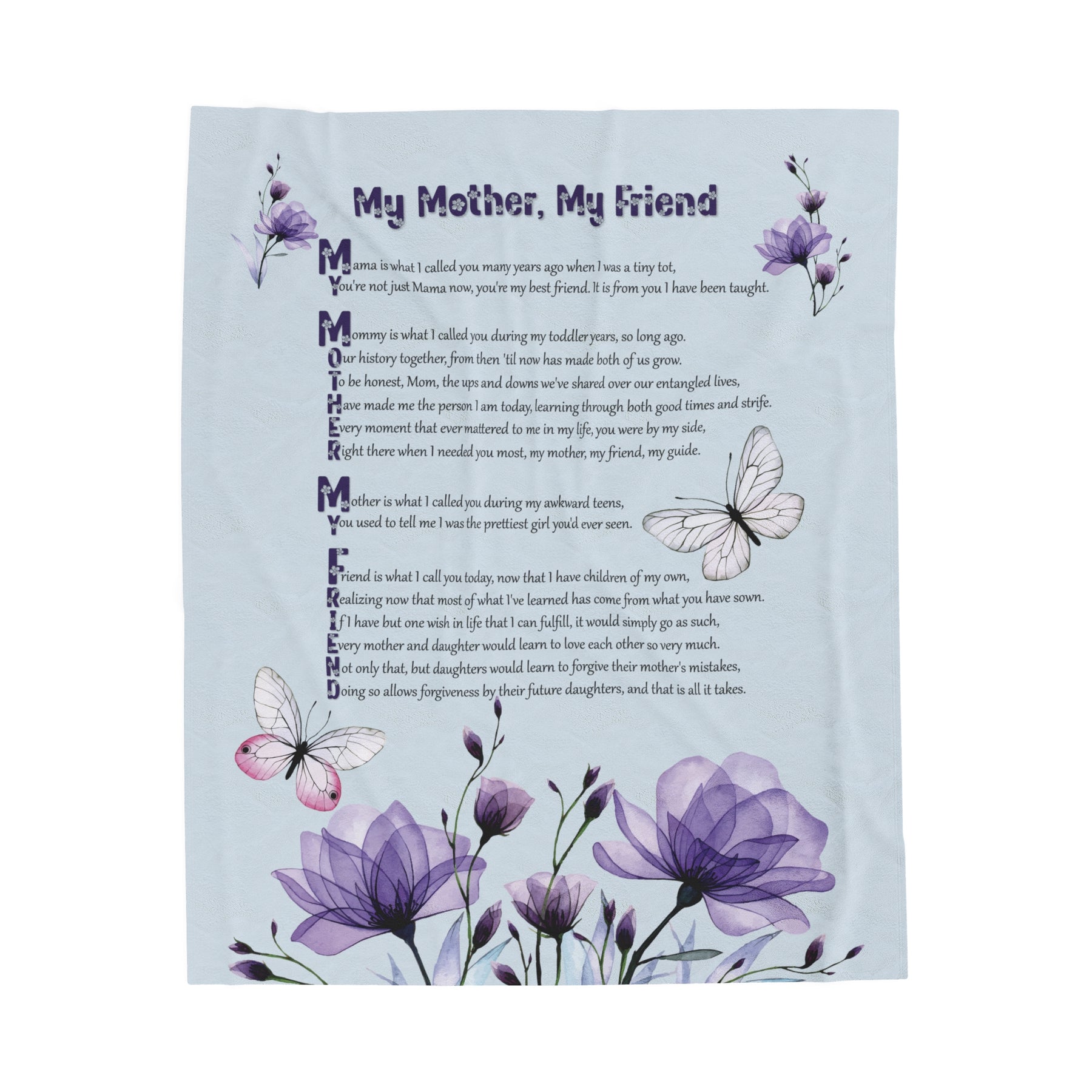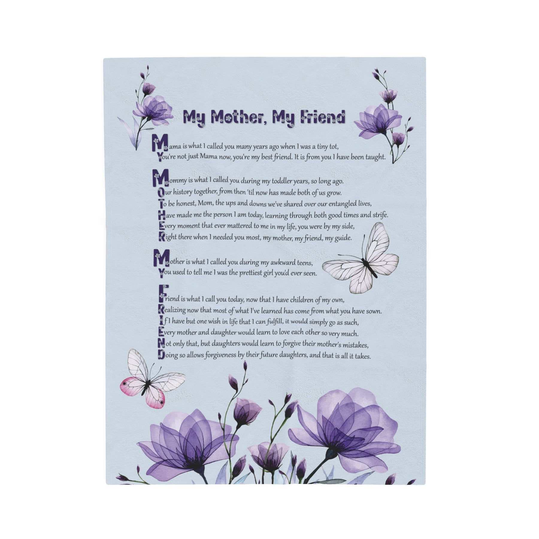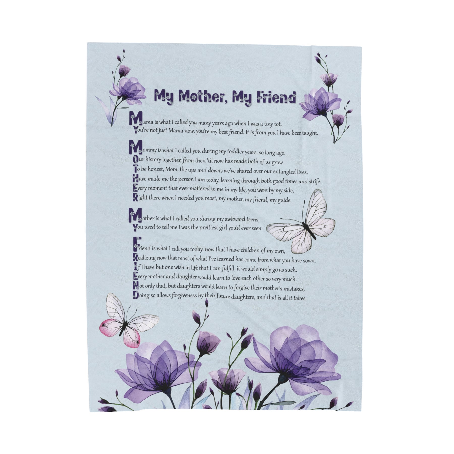 Help your Mother experience the utmost comfort with our luxurious Velveteen Plush Blanket, adorned with a heartwarming acrostic poem spelling out "My Mother, My Friend". This is not just any gift for your beloved mother, but a symbol of your deep love and appreciation. Crafted with only the finest materials, our blanket boasts delicate softness and vivid colors. Whether she's snuggled up at home or out enjoying special occasions, this blanket will provide warmth and coziness. Treat your Mom to the ultimate gift of comfort, and show her just how cherished she truly is. Don't hesitate - give the gift of lasting comfort!