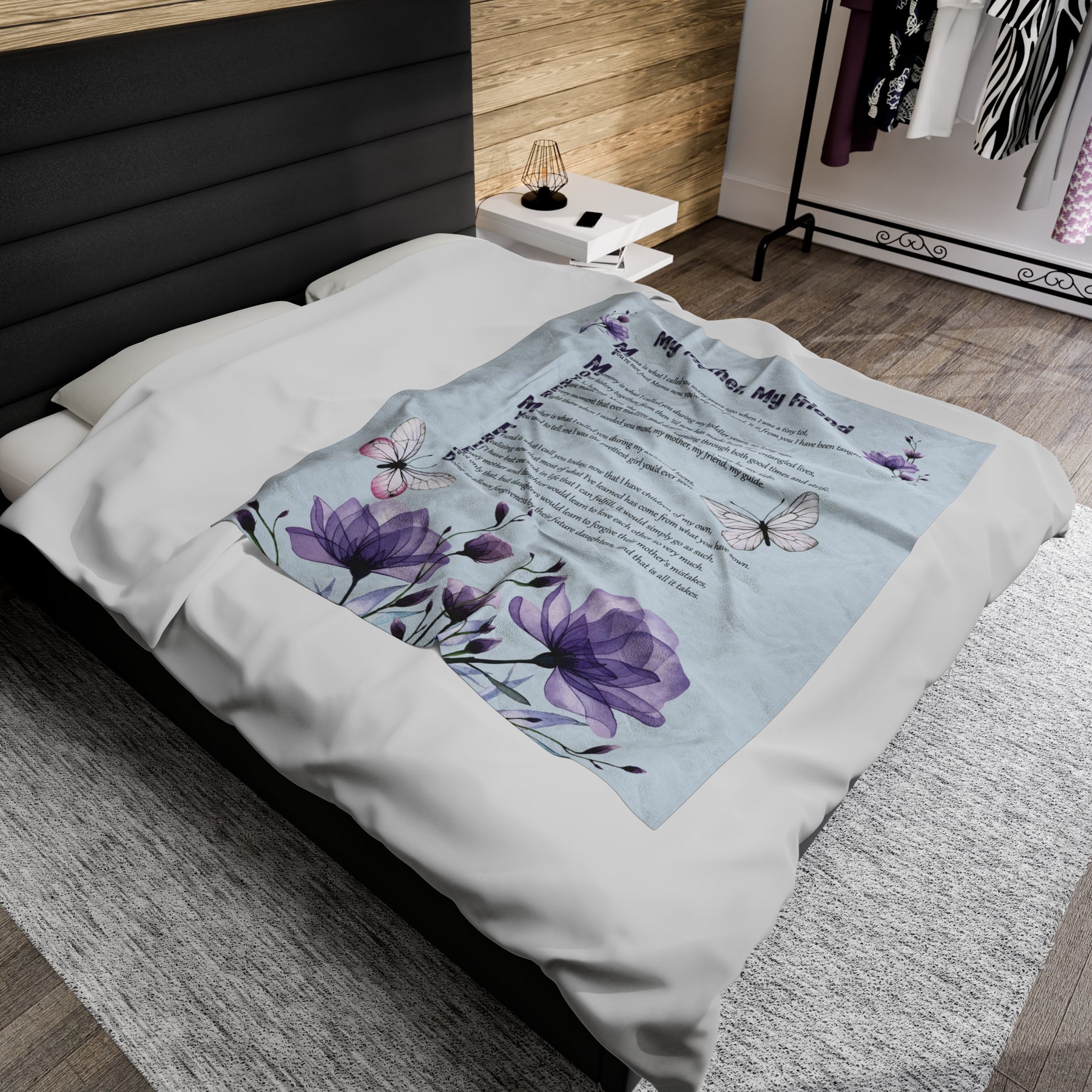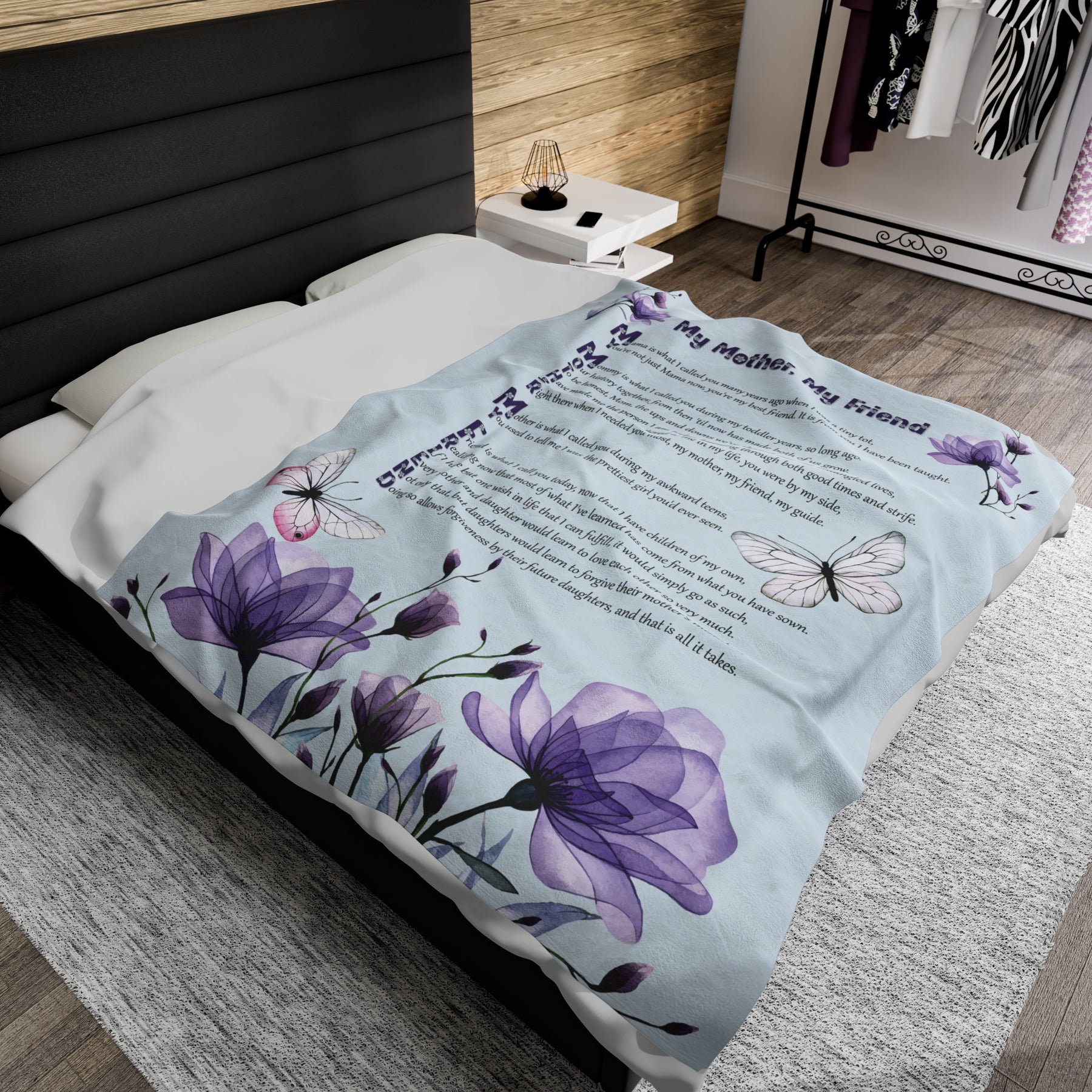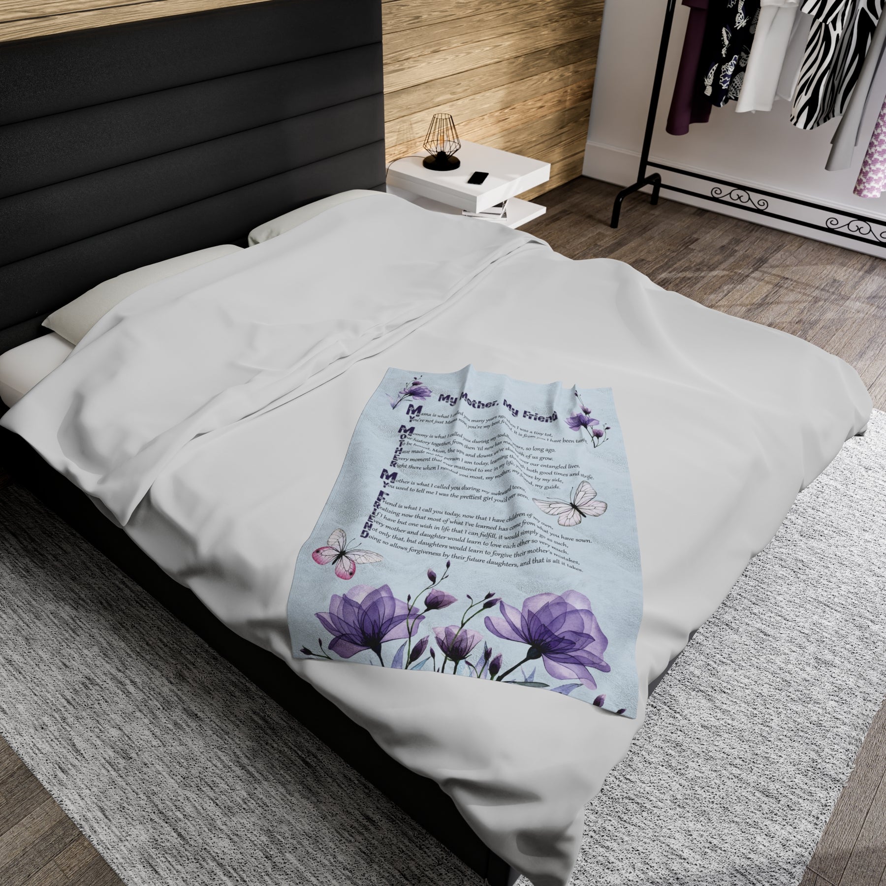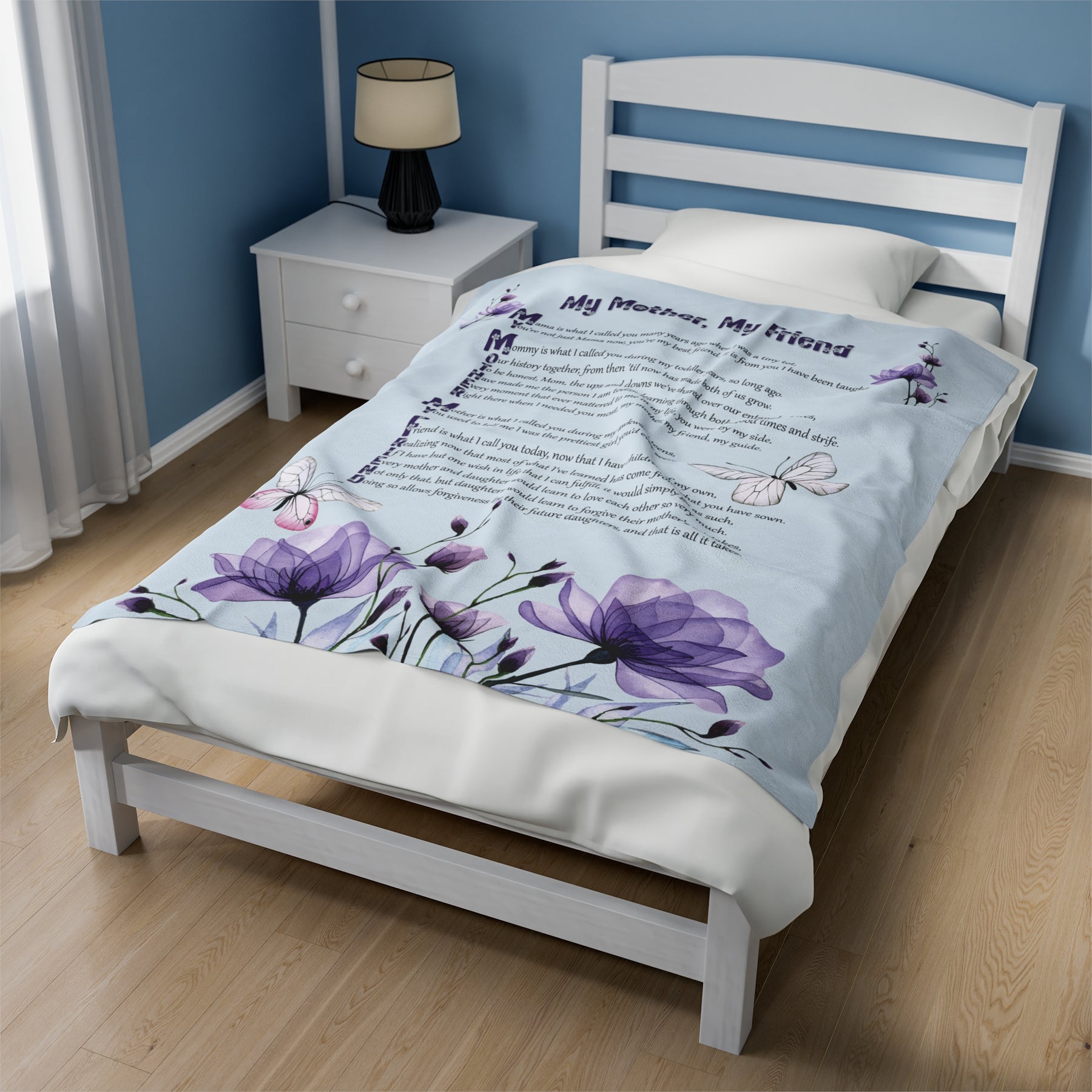 Help your Mother experience the utmost comfort with our luxurious Velveteen Plush Blanket, adorned with a heartwarming acrostic poem spelling out "My Mother, My Friend". This is not just any gift for your beloved mother, but a symbol of your deep love and appreciation. Crafted with only the finest materials, our blanket boasts delicate softness and vivid colors. Whether she's snuggled up at home or out enjoying special occasions, this blanket will provide warmth and coziness. Treat your Mom to the ultimate gift of comfort, and show her just how cherished she truly is. Don't hesitate - give the gift of lasting comfort!