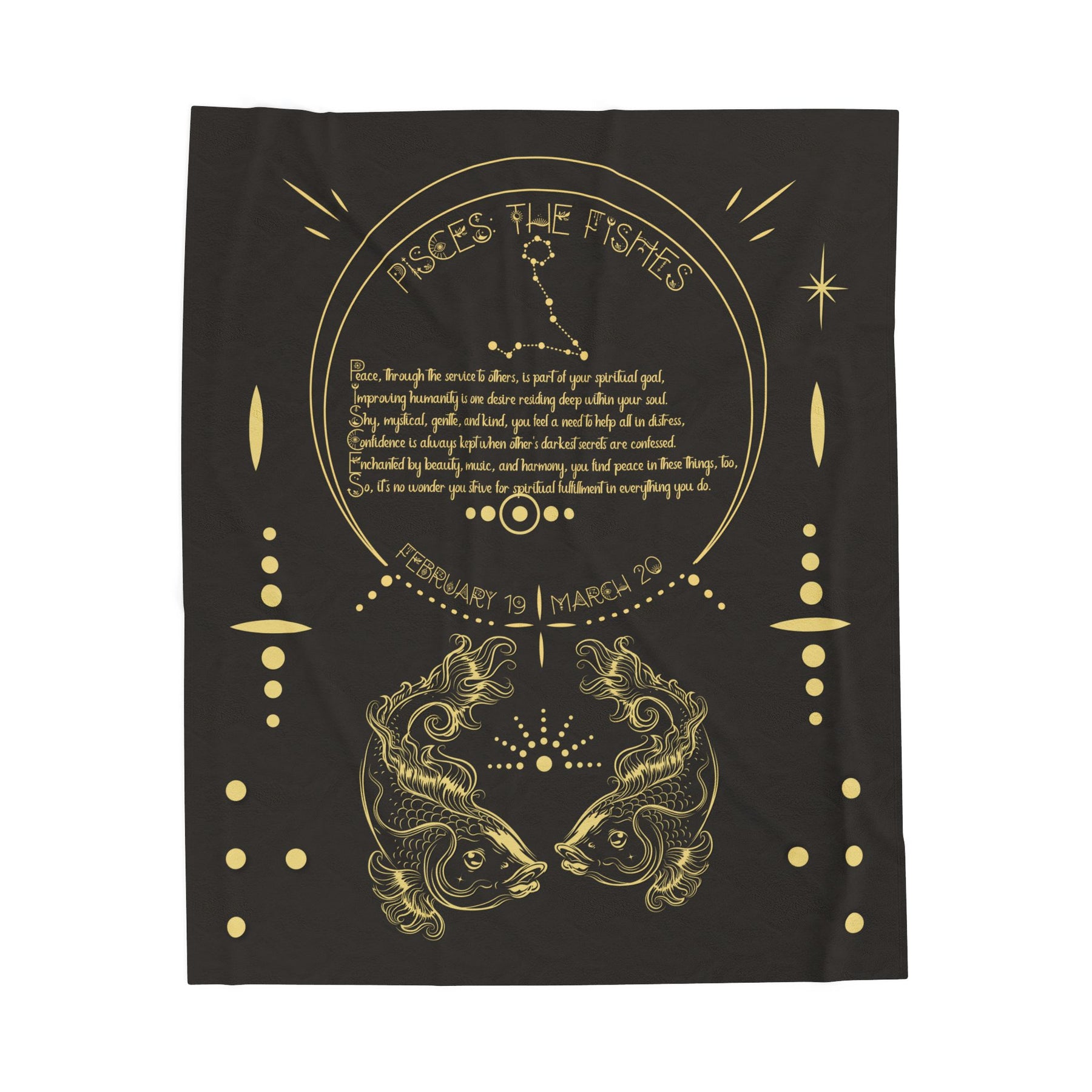 Moments in Rhyme introduces our Written in the Stars Blanket Collection. Welcome to your new favorite blanket. Take the stars with you with this beautiful Velveteen plush blanket. Its acrostic poem spells out Pisces with a large, unique graphic of Pisces the Fishes, making it the perfect Christmas or birthday gift for any astrology lover. These blankets are delicate, soft, and vibrant. Ideal for outdoor events and cozy winter snuggles. The unique Celestial font adds extra charm. Made from 83% Polyester and 17% Spandex, a medium- to heavyweight fabric that feels exceptionally soft to the touch. Available in three sizes.