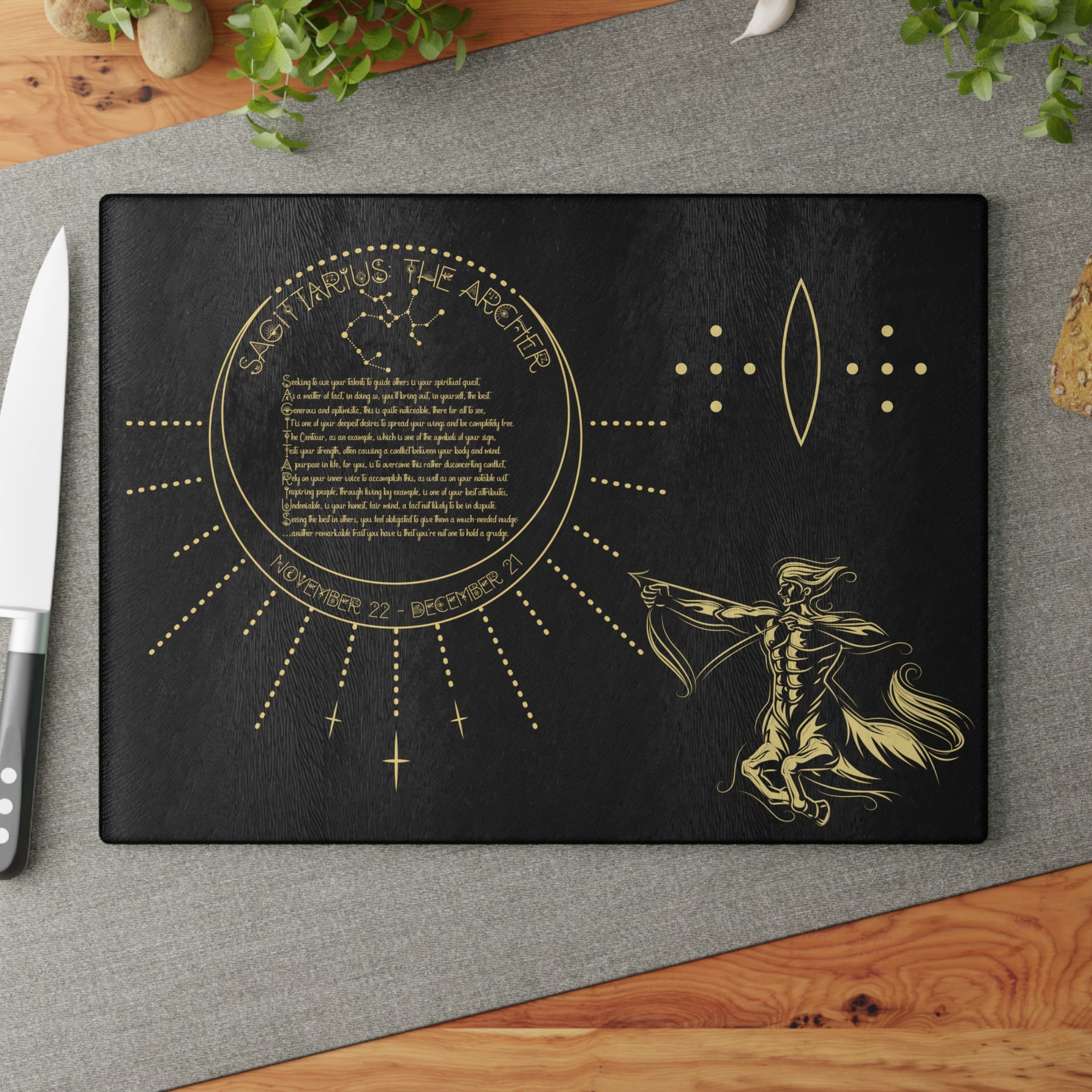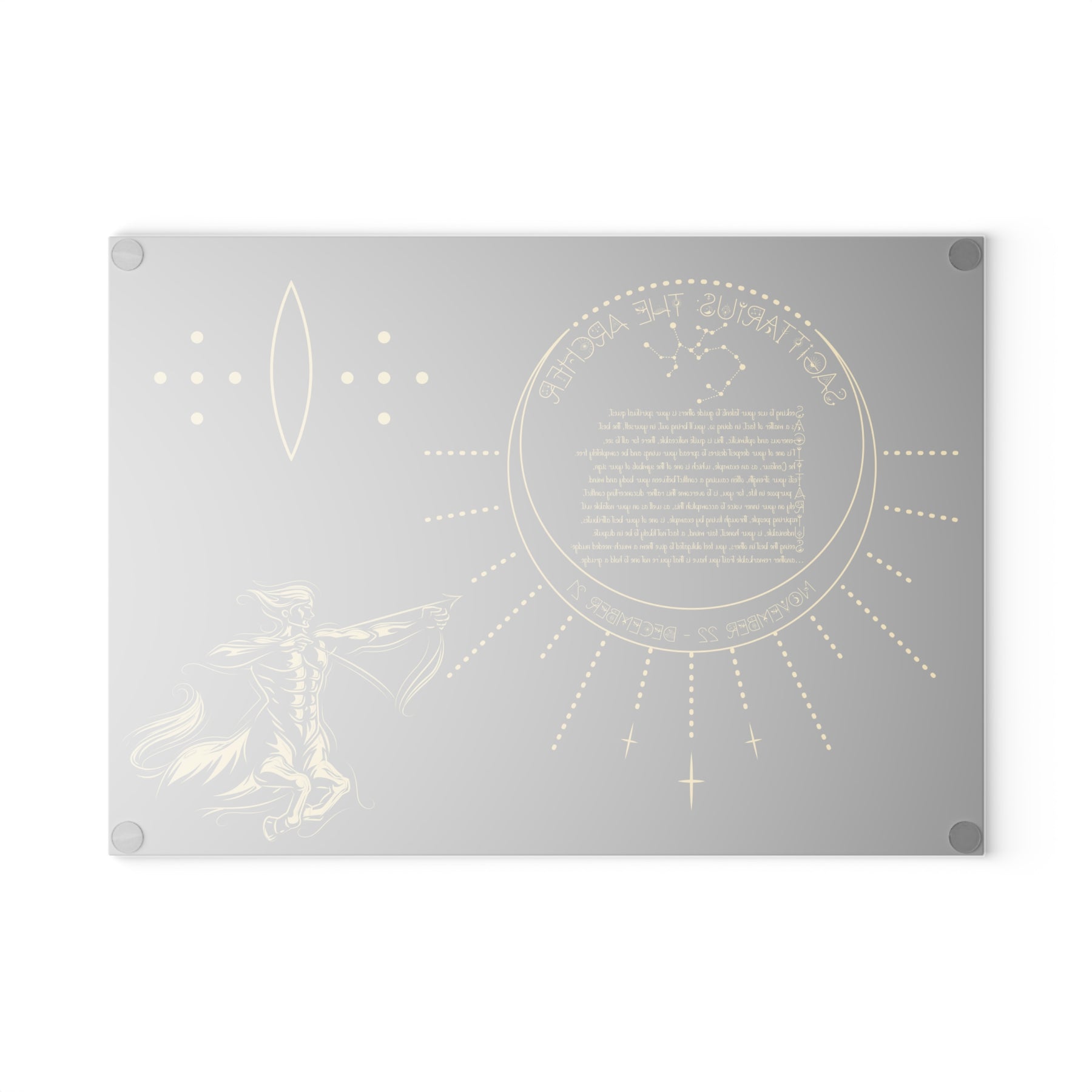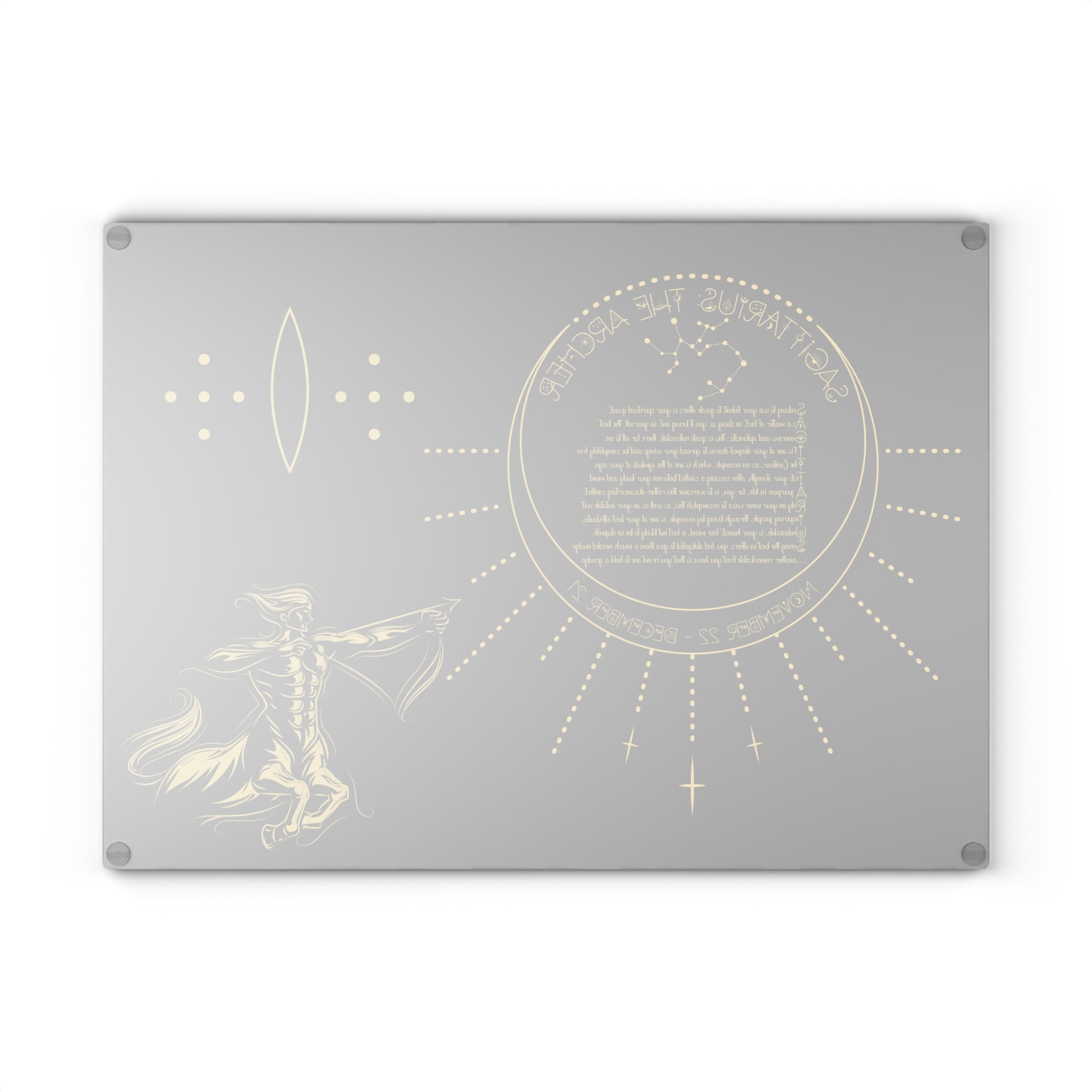 Add some personality to your kitchen with a custom glass cutting board from our Written in the Stars collection. The board features a poem spelling out Sagittarius, accompanied by a Sagittarius the Archer graphic and Celestial Font. The poem embodies the spiritual goal and traits associated with your sign. Made from durable tempered glass, it stands up to years of meal prep. The textured surface is perfect for chopping, slicing, and dicing. Four rubber feet keep it steady on your counter. Choose from two sizes: 8" x 11" or 11" x 15". For best results, hand wash only.