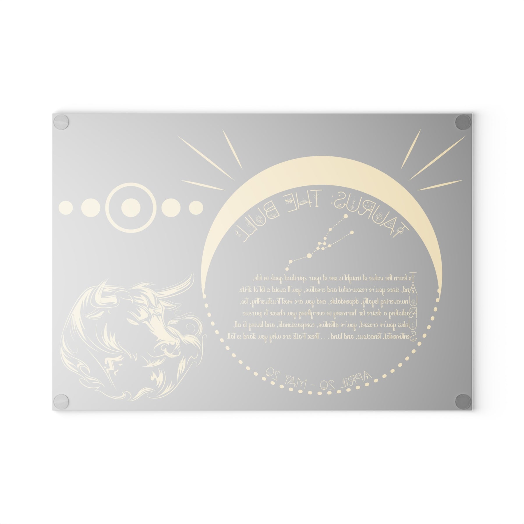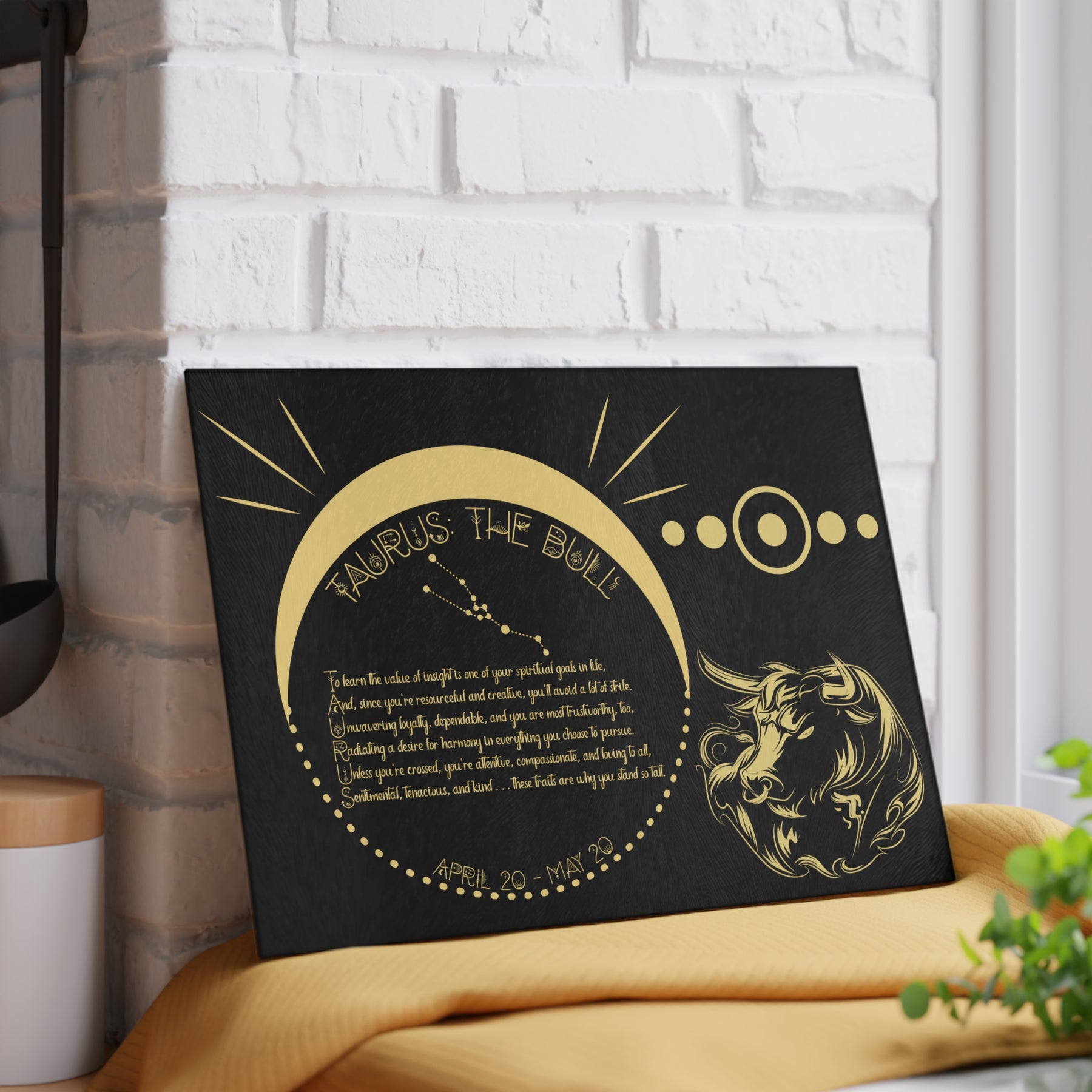 Add some personality to your kitchen with a custom glass cutting board from our Written in the Stars collection. The board features a poem spelling out Taurus, accompanied by a Taurus the Bull graphic and Celestial Font. The poem embodies the spiritual goal and traits associated with your sign. Made from durable tempered glass, it stands up to years of meal prep. The textured surface is perfect for chopping, slicing, and dicing. Four rubber feet keep it steady on your counter. Choose from two sizes: 8" x 11" or 11" x 15". For best results, hand wash only.