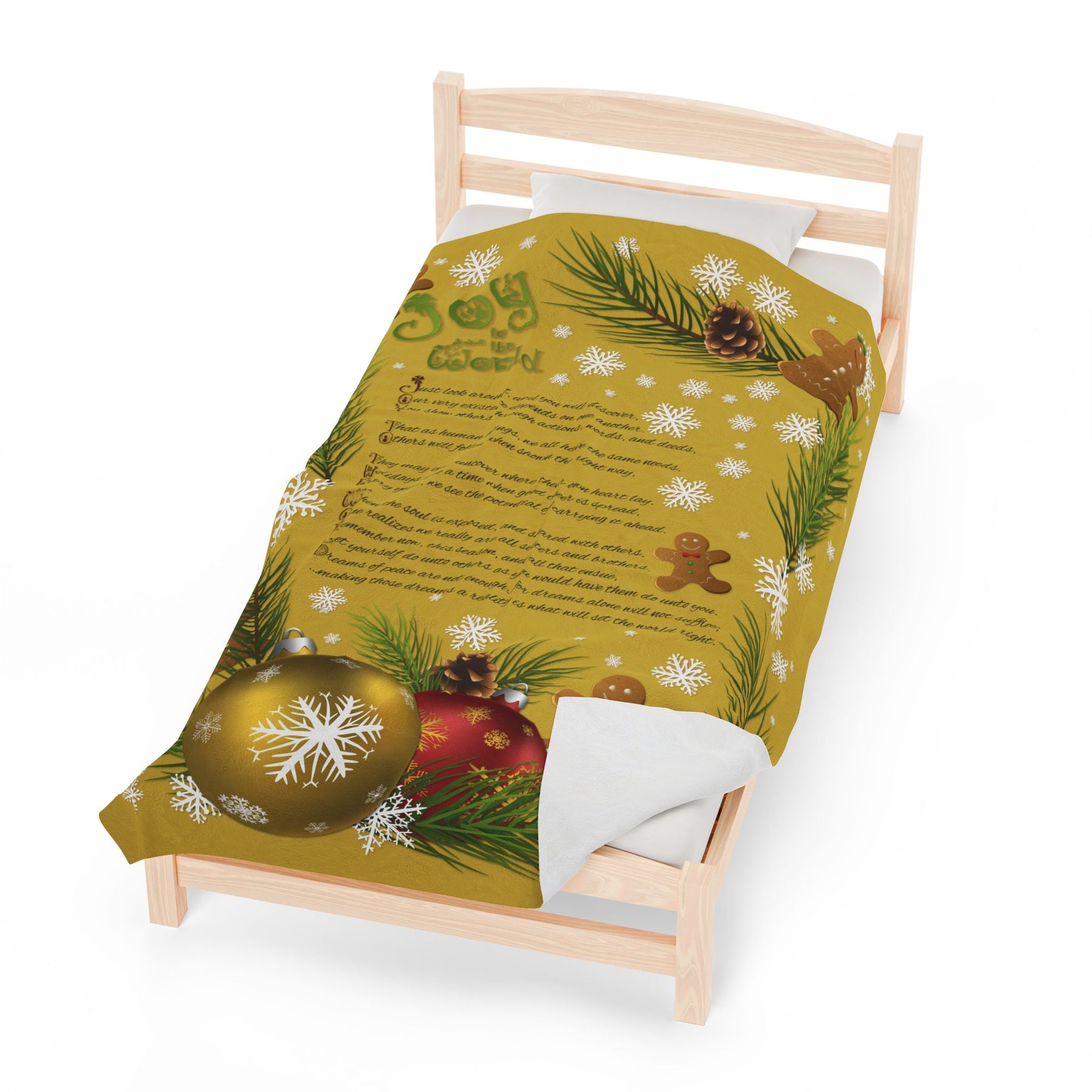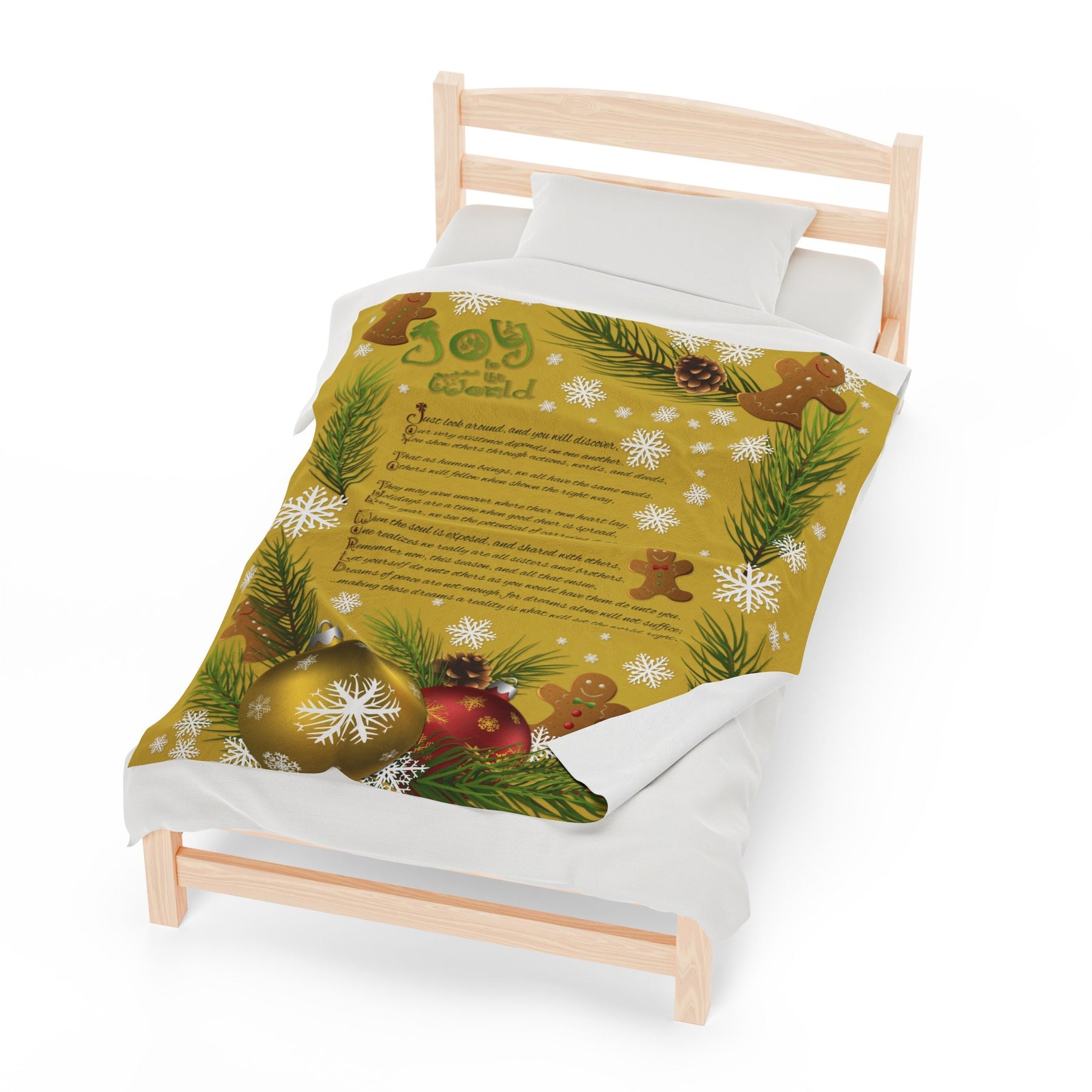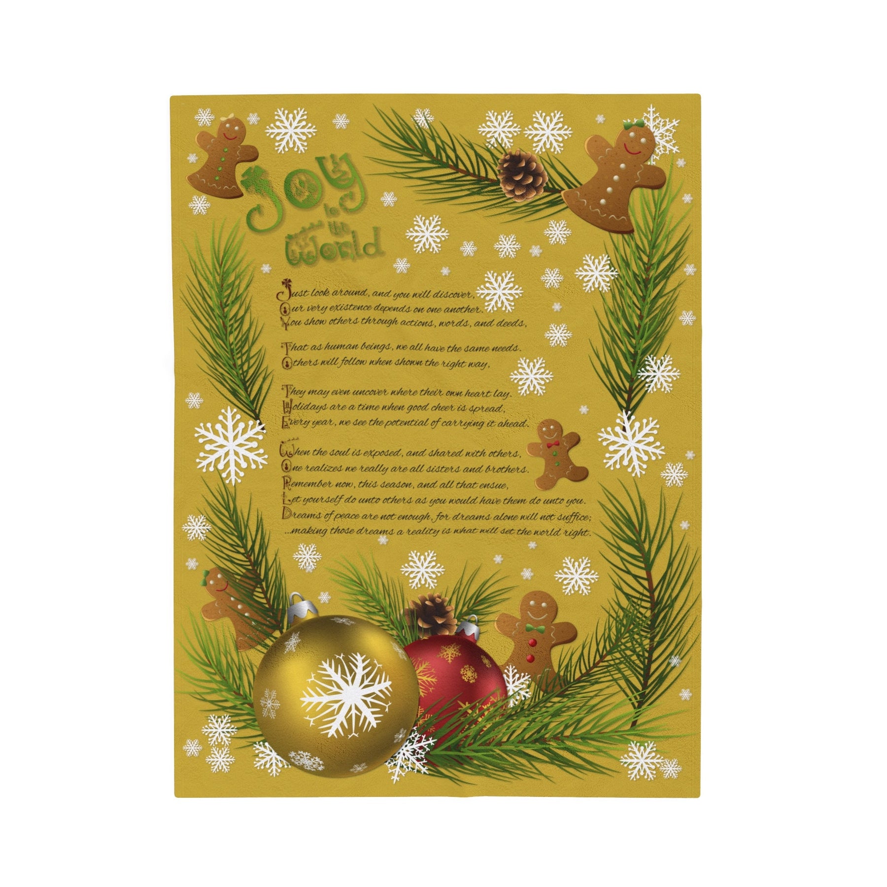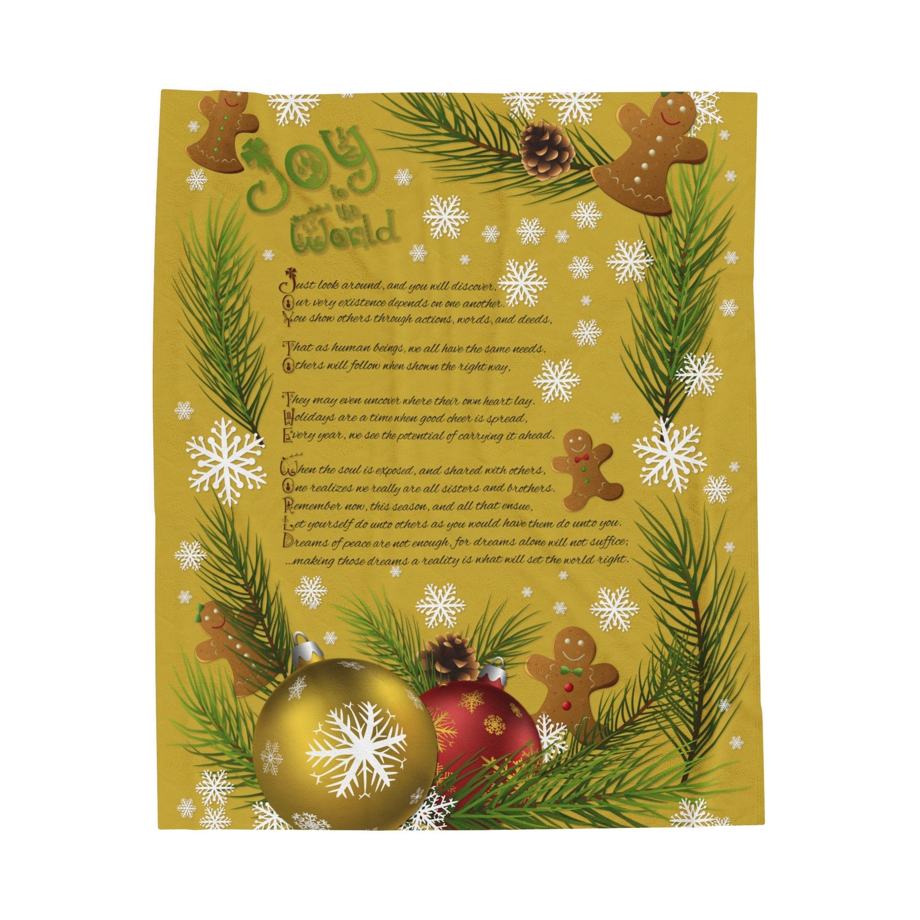 Get cozy and festive this holiday season with our Velveteen Plush Blanket featuring a playful Gingerbread and Ornament design and a whimsical acrostic poem that spells out "Joy to the World". Made with a luxurious and soft 83% Polyester and 17% Spandex blend, this medium heavy-weight blanket is perfect for snuggling up in the cold weather. Makes a great Holiday or Christmas gift for adults and kids alike! So why wait? Wrap yourself in joy today!