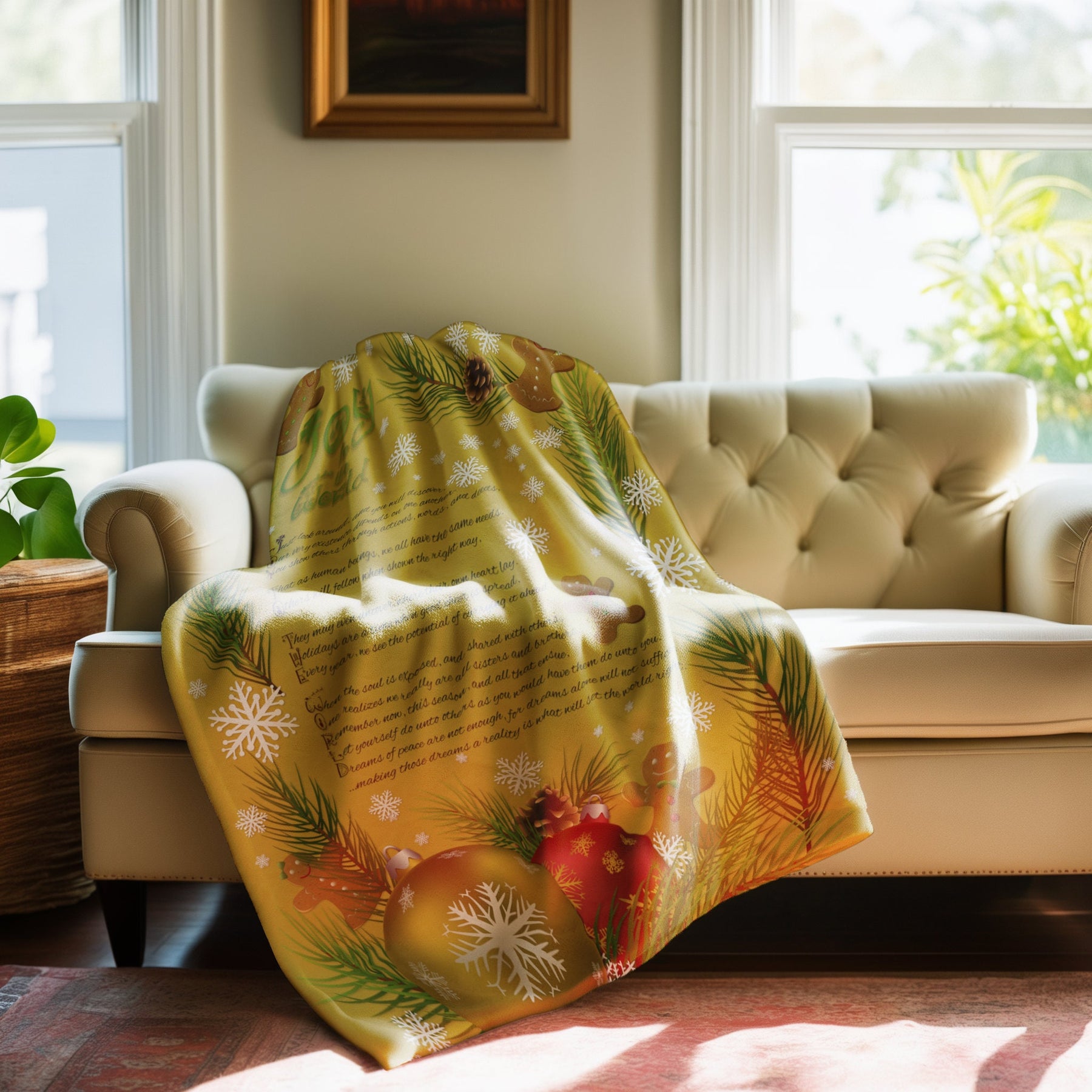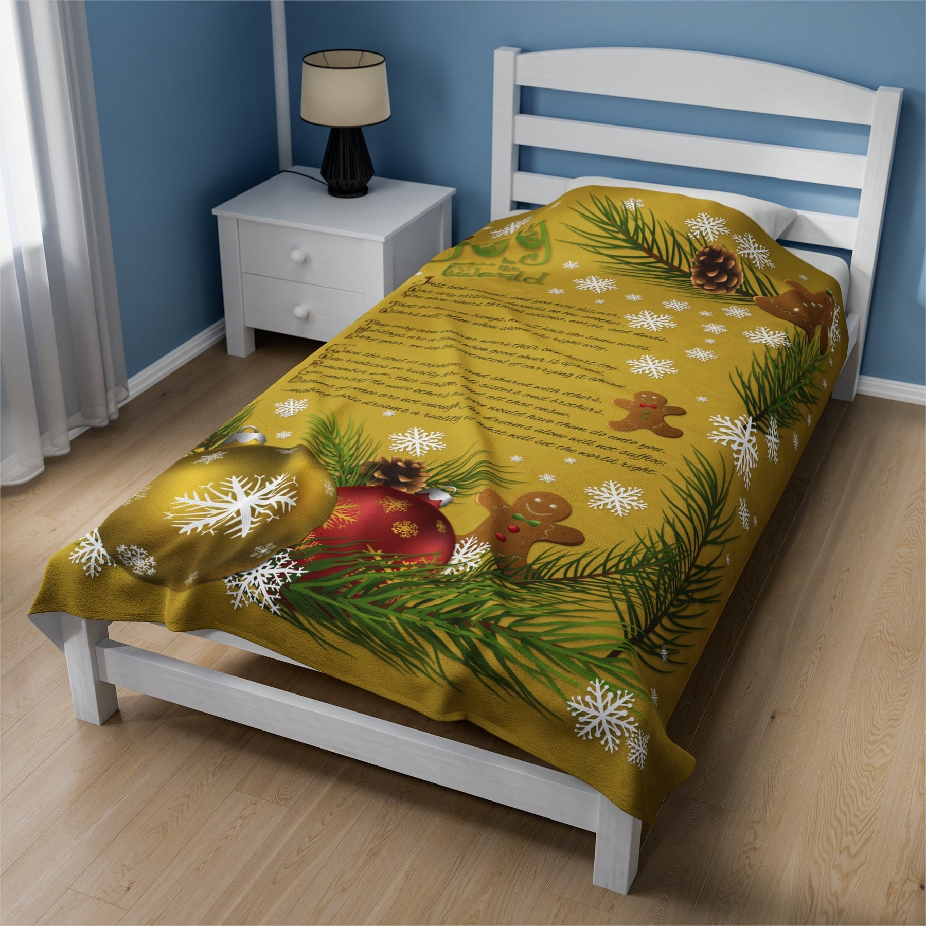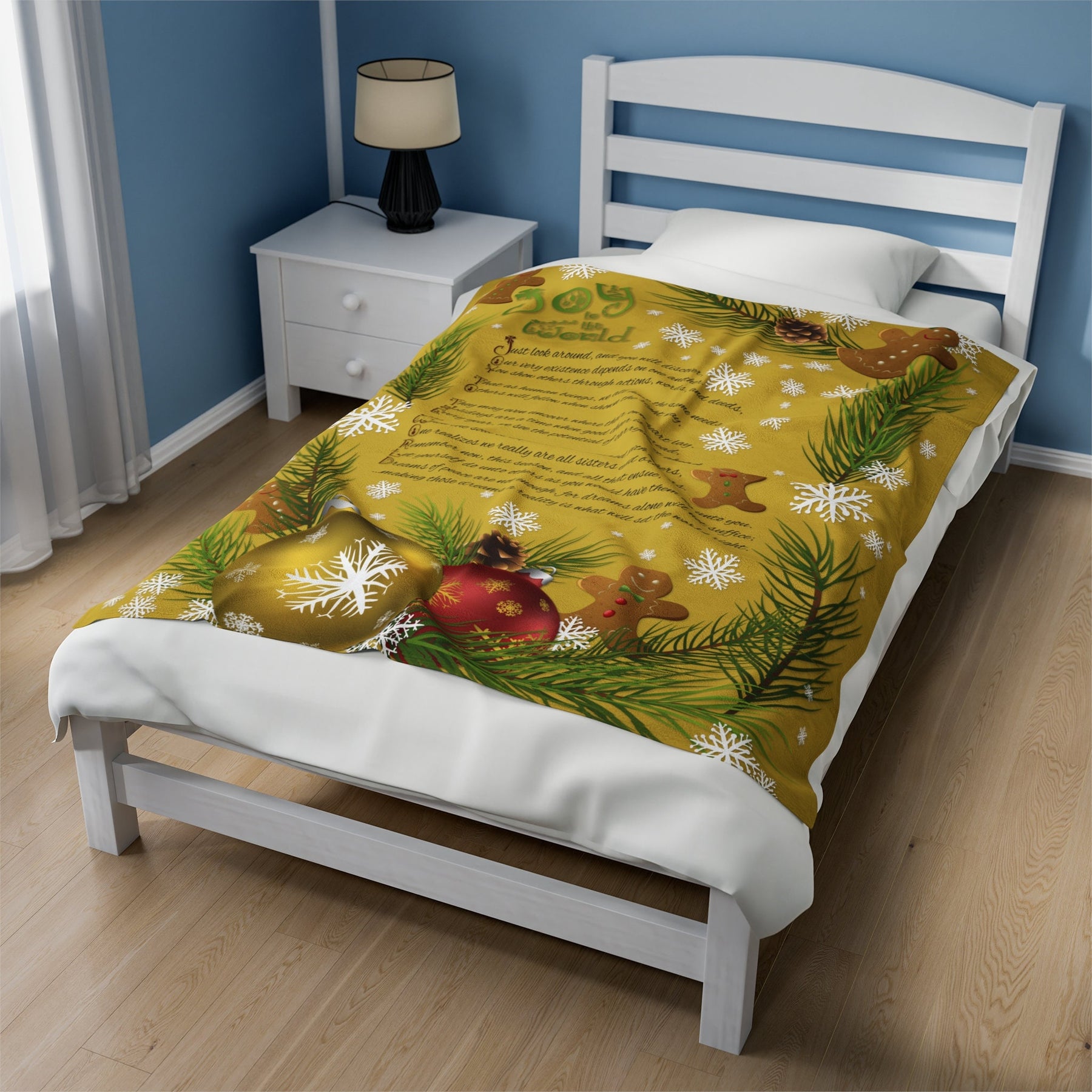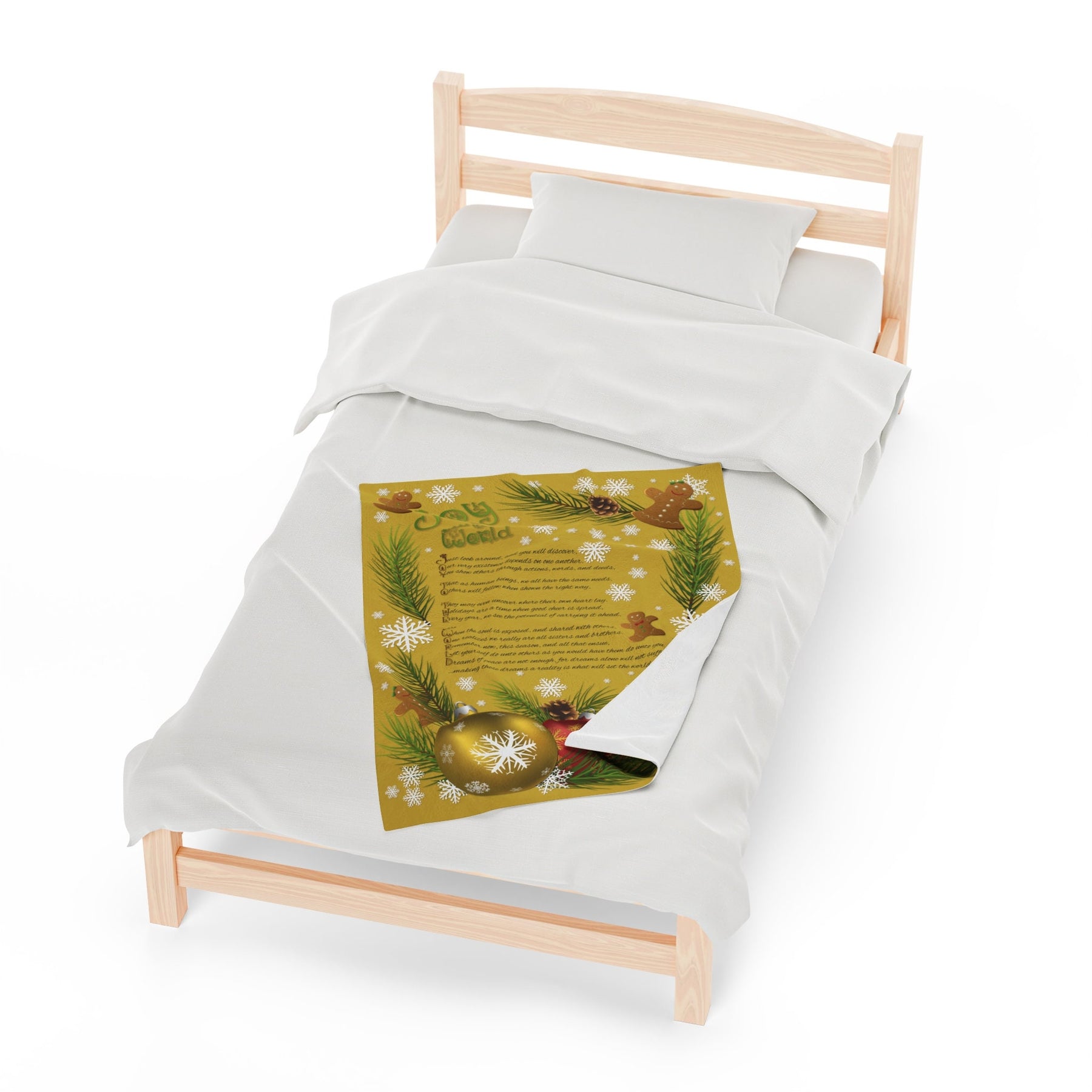 Get cozy and festive this holiday season with our Velveteen Plush Blanket featuring a playful Gingerbread and Ornament design and a whimsical acrostic poem that spells out "Joy to the World". Made with a luxurious and soft 83% Polyester and 17% Spandex blend, this medium heavy-weight blanket is perfect for snuggling up in the cold weather. Makes a great Holiday or Christmas gift for adults and kids alike! So why wait? Wrap yourself in joy today!