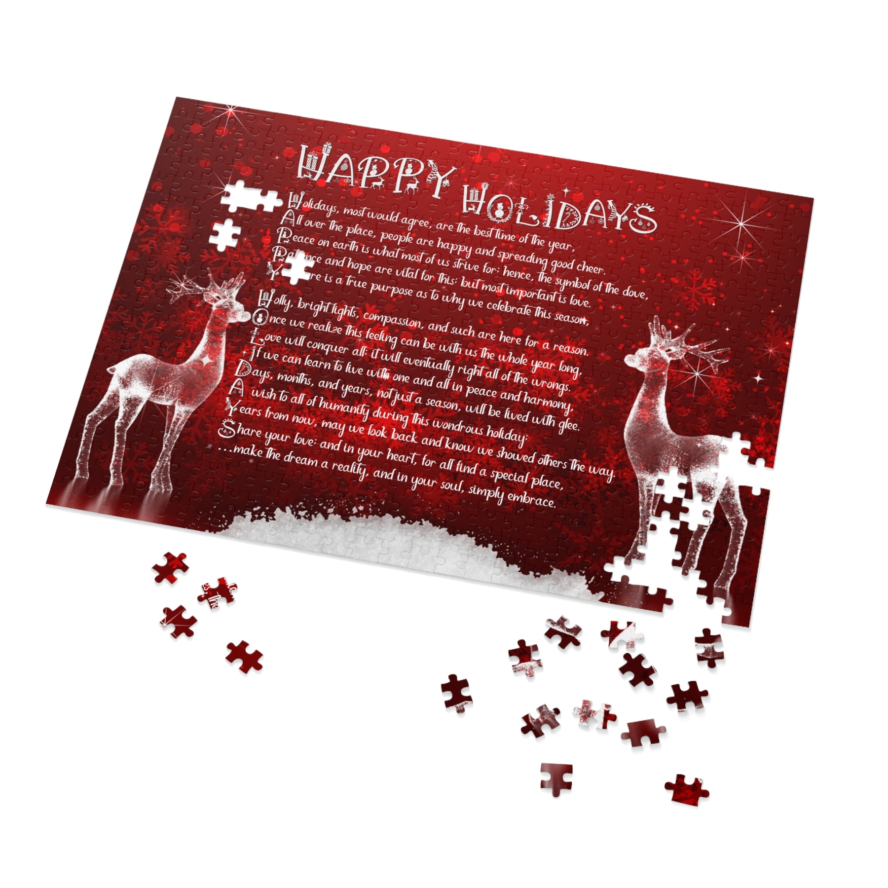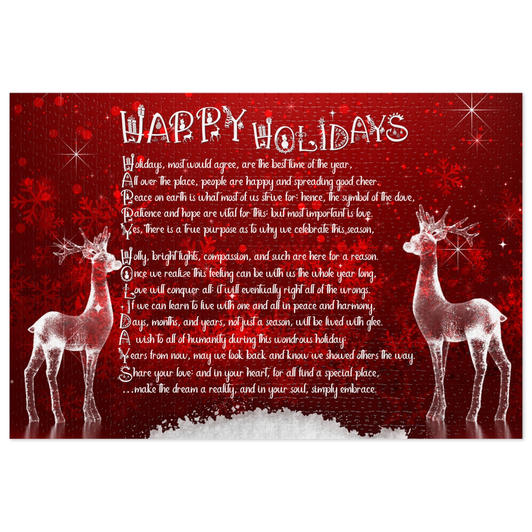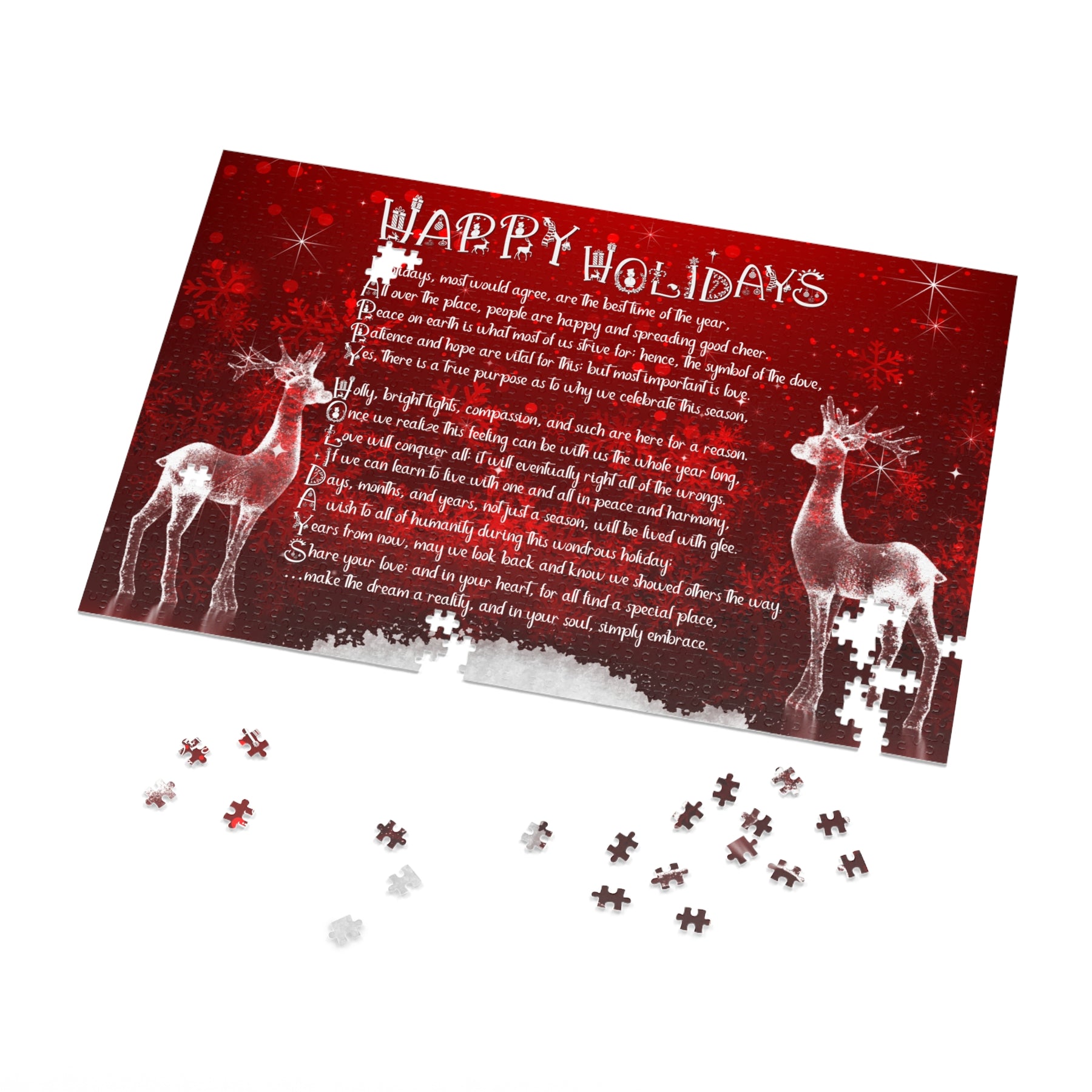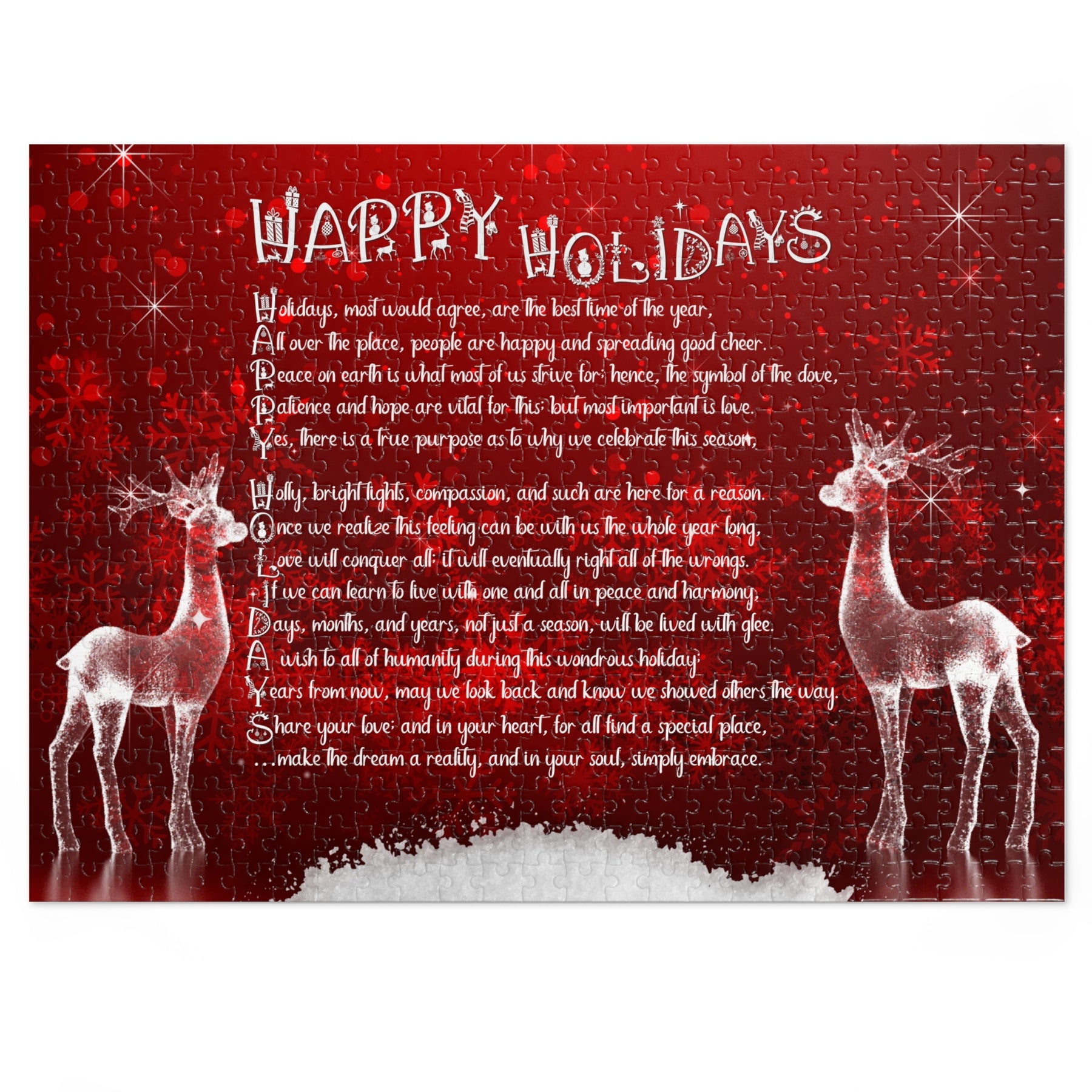 Moments in Rhyme introduces our It's Just a Phrase Puzzle Collection, meticulously crafted for puzzle enthusiasts and holiday lovers alike. Gorgeous design featuring an acrostic poem that spells out Happy Holidays. Leave this out all season long and invite family and guests to help with a piece or two here and there. They will piece together this enchanting puzzle, using each letter as a clue, unveiling a captivating poem about the holiday season. With its vibrant imagery and intricate design, it's also perfect for those seeking a mindful and immersive experience. Unleash your critical thinking skills and embrace the magic of this exquisite puzzle.