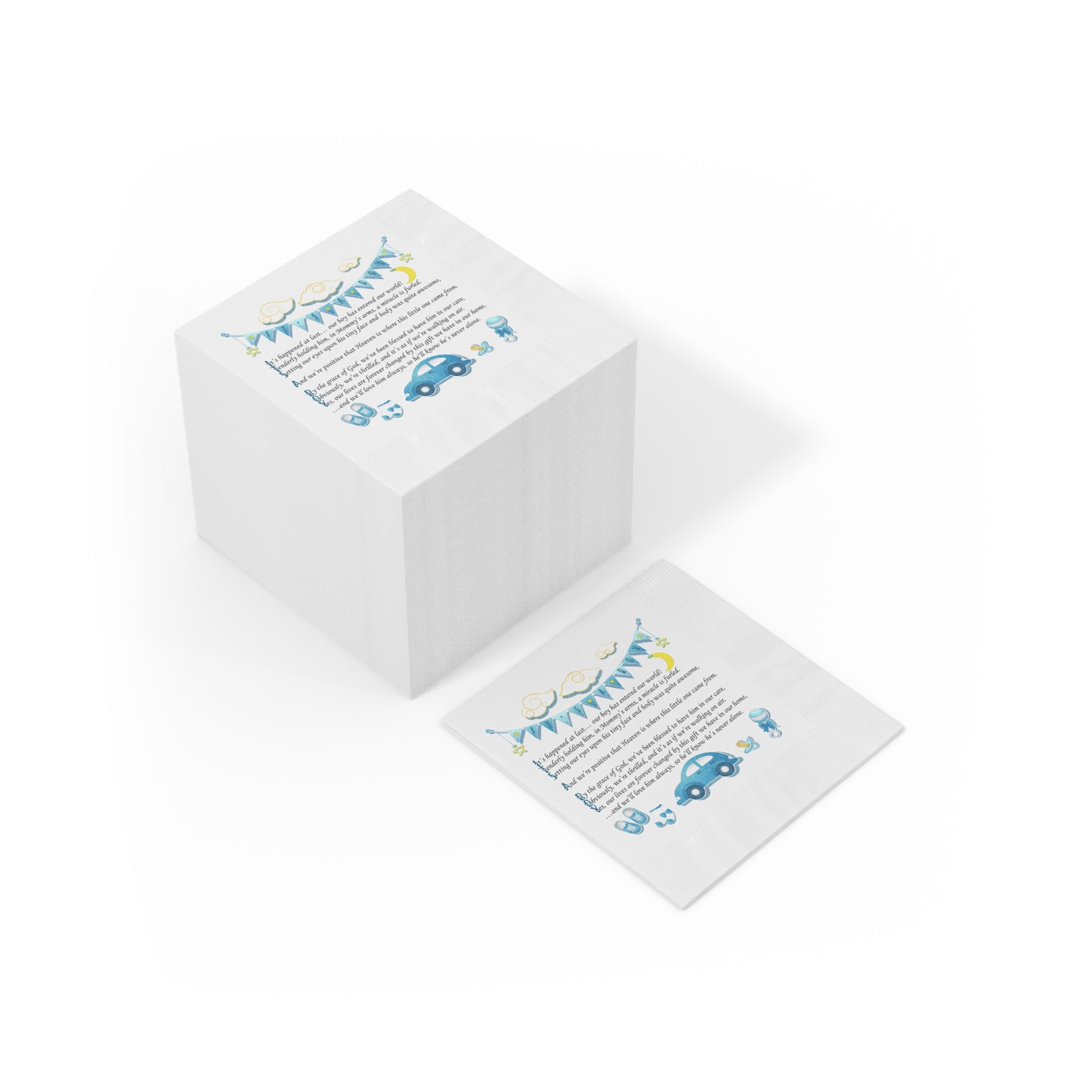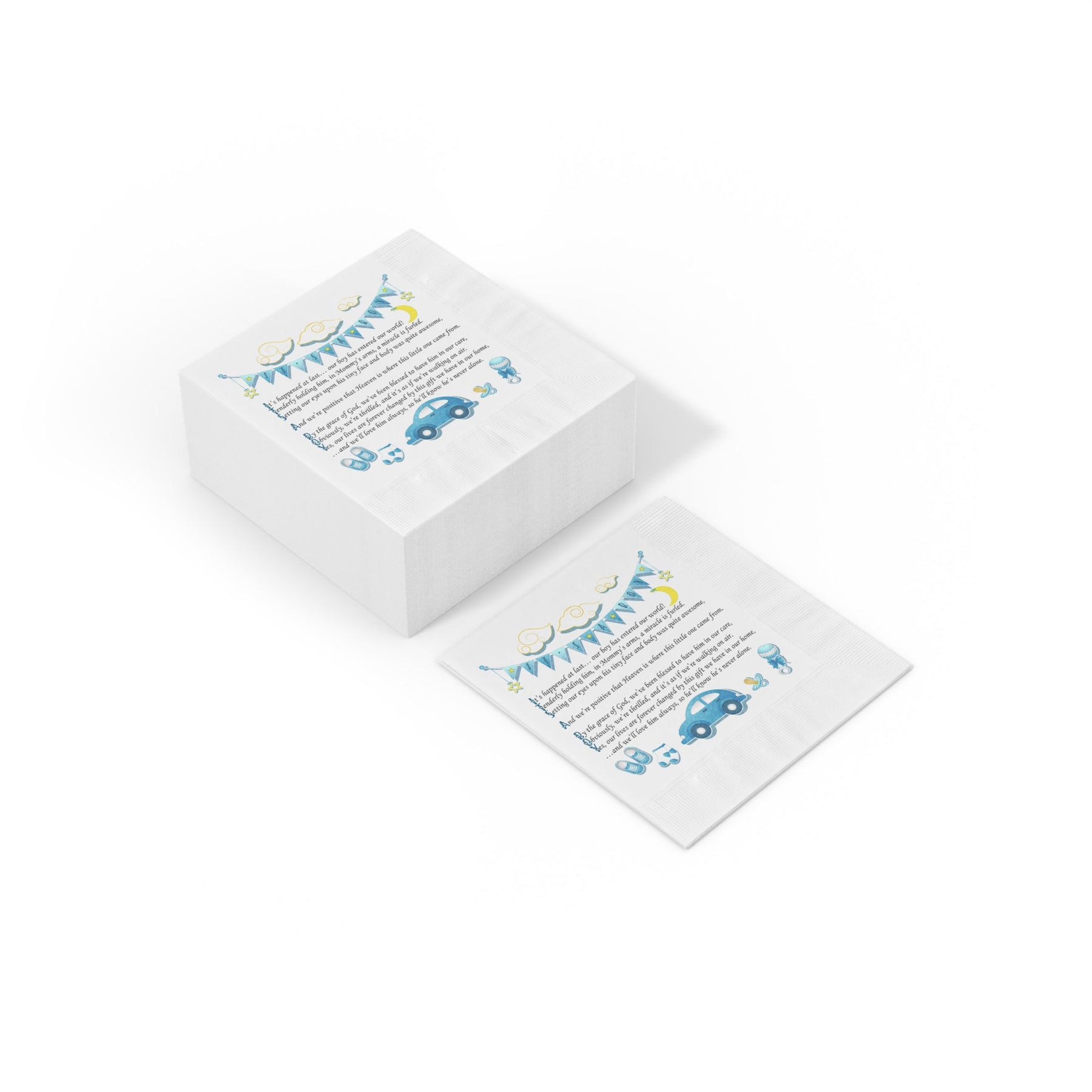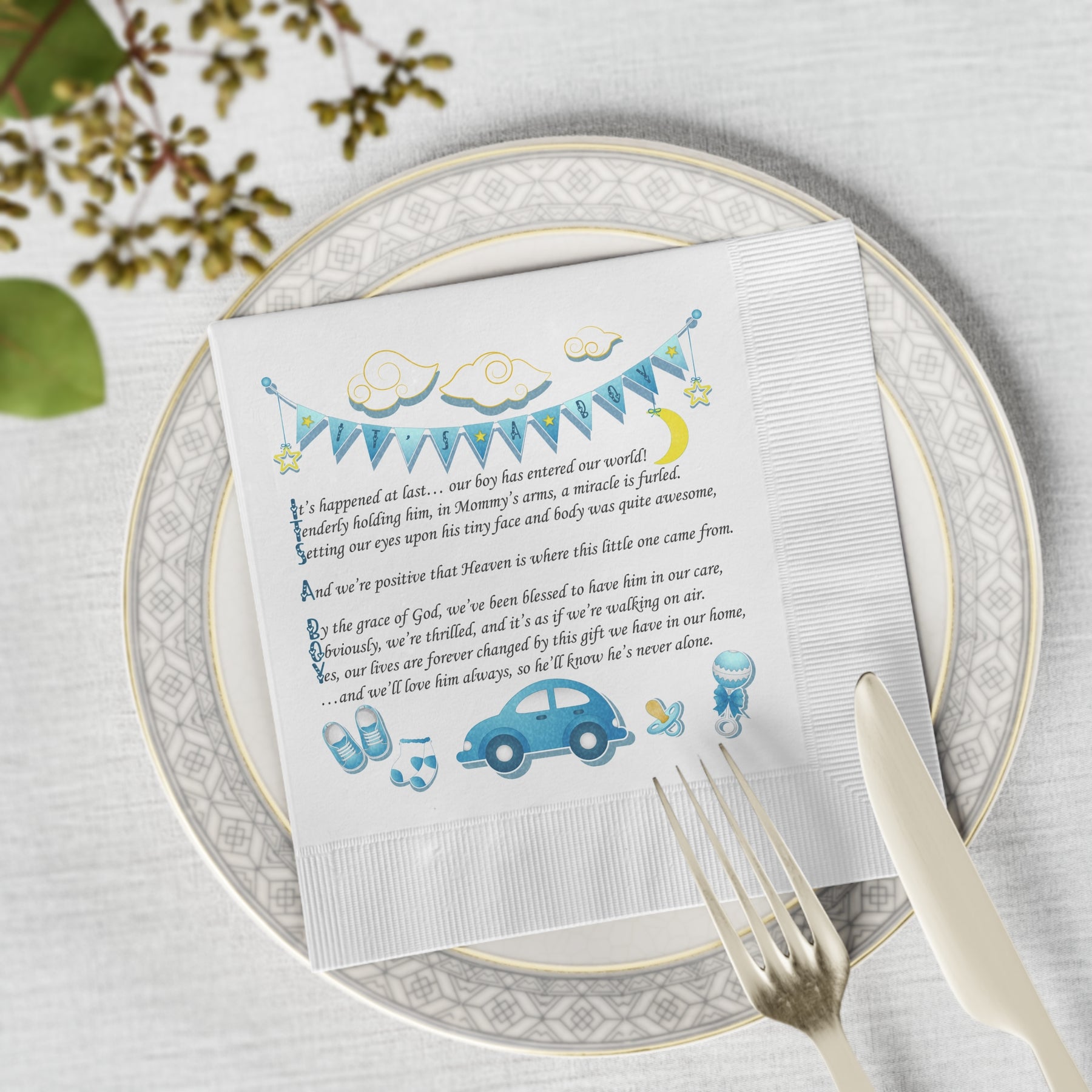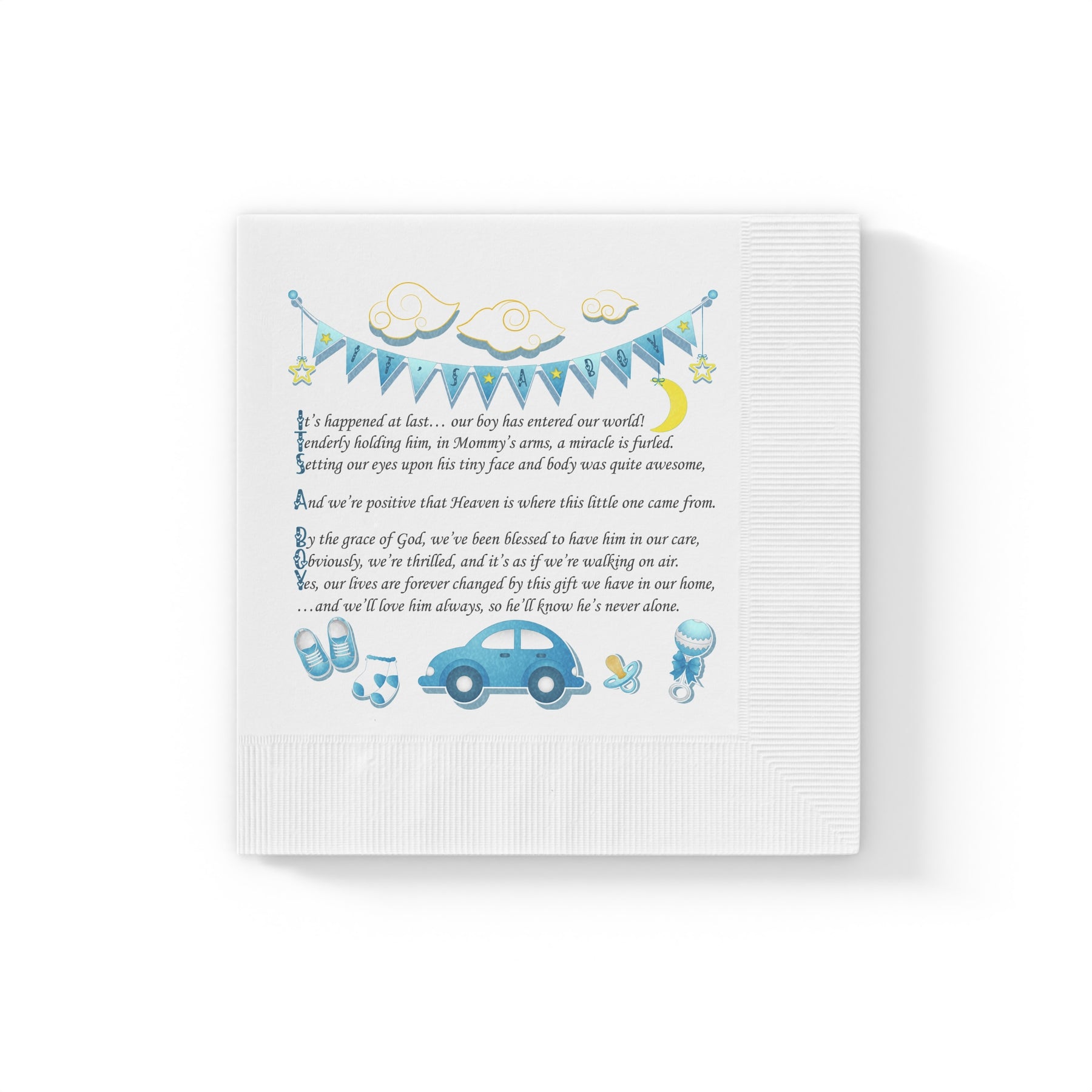 Transform the atmosphere of any baby shower with Baby Steps Napkins. This darling design features an adorable baby body suit design with polka dots, and an acrostic poem spelling out It's a Boy with a heartfelt message to welcome a new baby. You can create the perfect look for the special occasion. Add the It’s a Boy selection of matching products, including balloons, table runner, puzzle, and a backdrop.