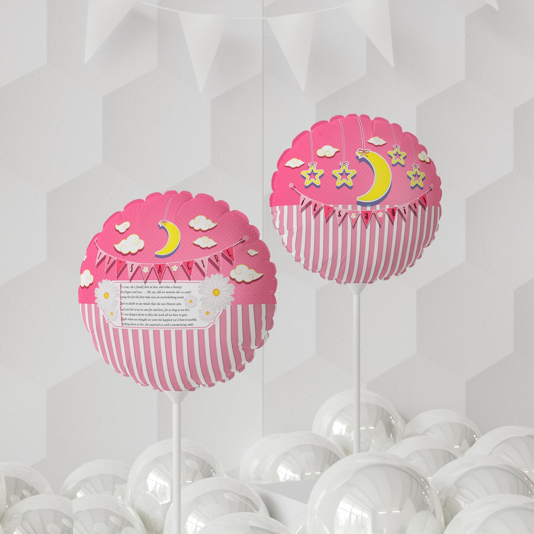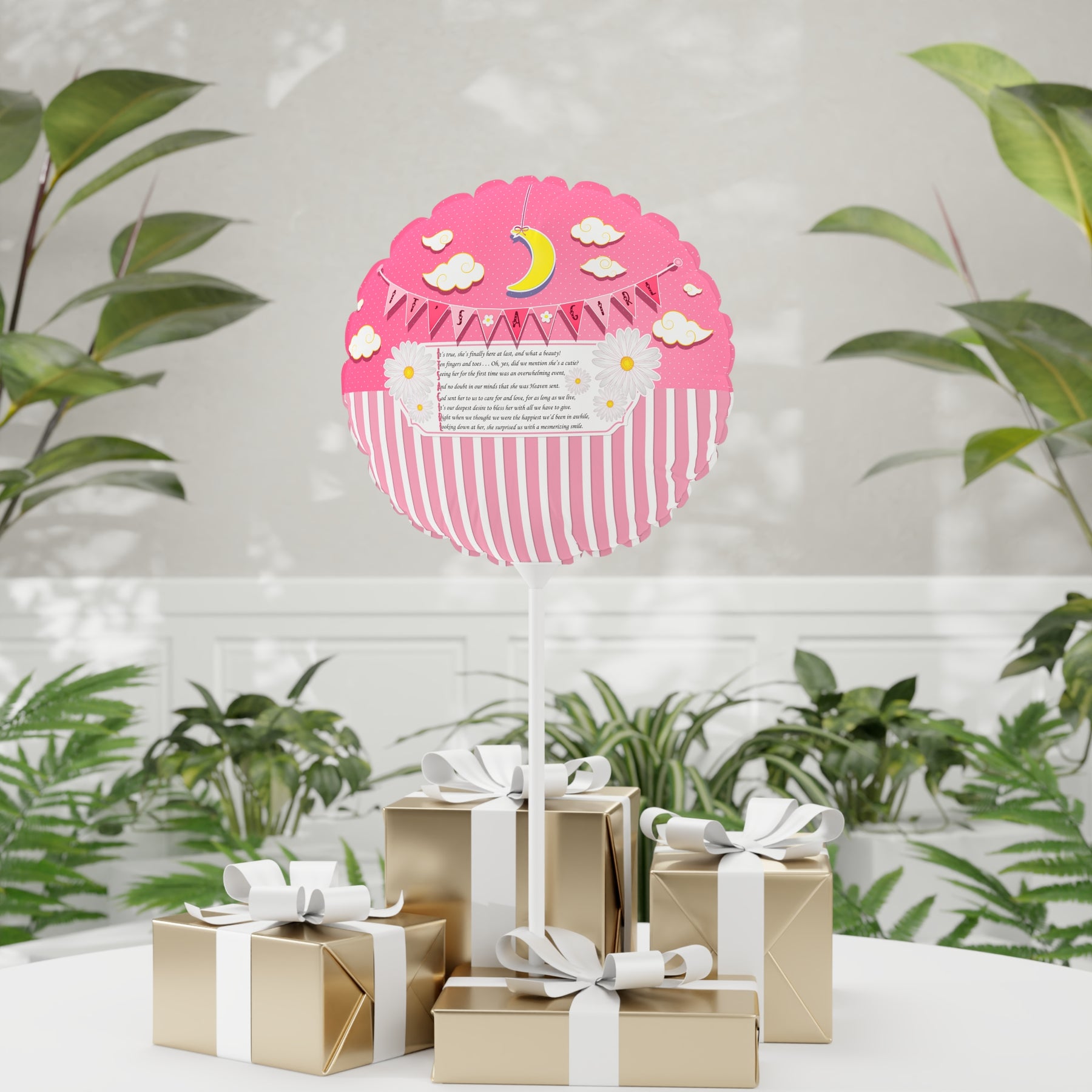 Baby Steps from Moments in Rhyme introduces our Mylar balloons. Such cute decor for your baby shower. These are sure to make your upcoming event a hit! Each balloon features an acrostic poem spelling out It's a Girl. Perfect for adding a festive touch to baby shower decorations! These can be used as both indoor and outdoor decorations. Add a touch of charm to any baby shower with these delightful Baby Steps round balloons with an adorable design! To personalize this balloon, enter the baby's first name at checkout. A $5.00 personalization fee will be added to your cart at checkout.