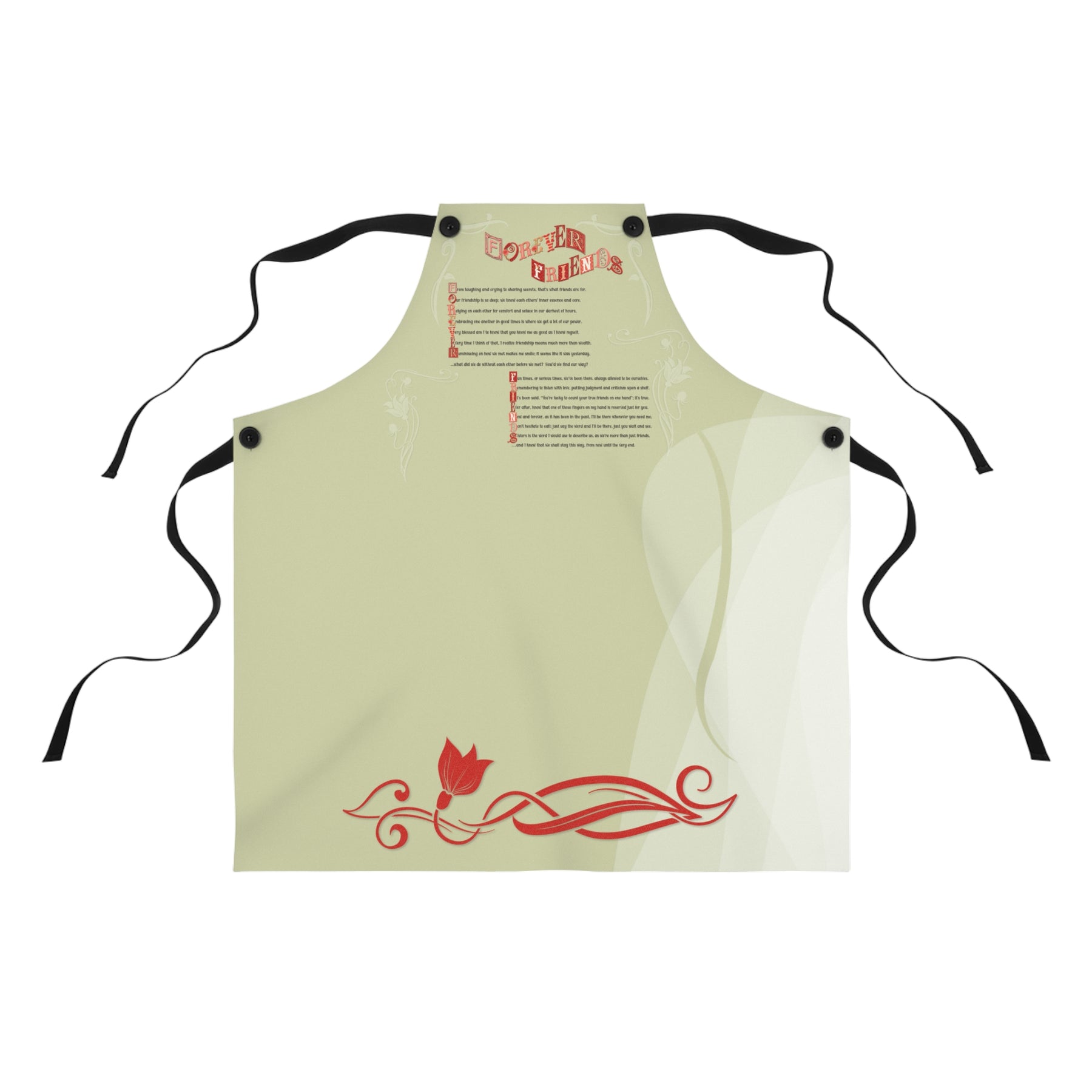 Introducing our It's Just a Phrase Chef Apron. Take a look at the amazing font and the sentimental acrostic poem that spells out Forever Friends. This is designed for legendary friends (or Besties, BFFies, etc.) who love to cook up delicious meals and share unforgettable memories in the kitchen. Not only does this apron protect clothes from culinary disasters, it showcases a unique personality. Made with high-quality material, it ensures durability and comfort, allowing your Bestie to create culinary masterpieces effortlessly. Grab this apron now to unlock the chef within your BFFie. Material: 100% polyester canvas. One size: 31.5" x 25.6". Black, white, and beige strap color options are available—tie-back closure.