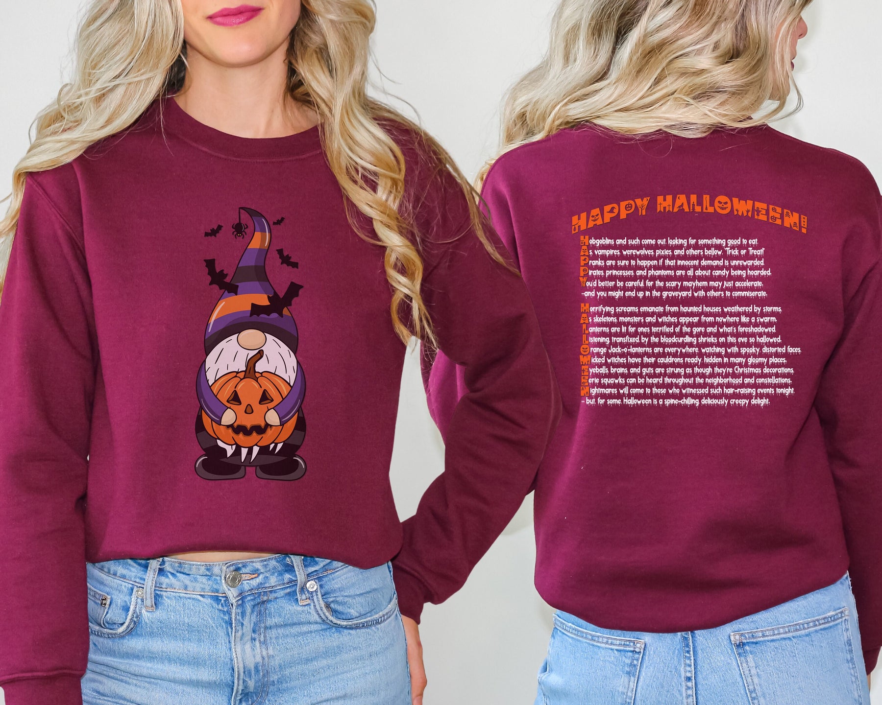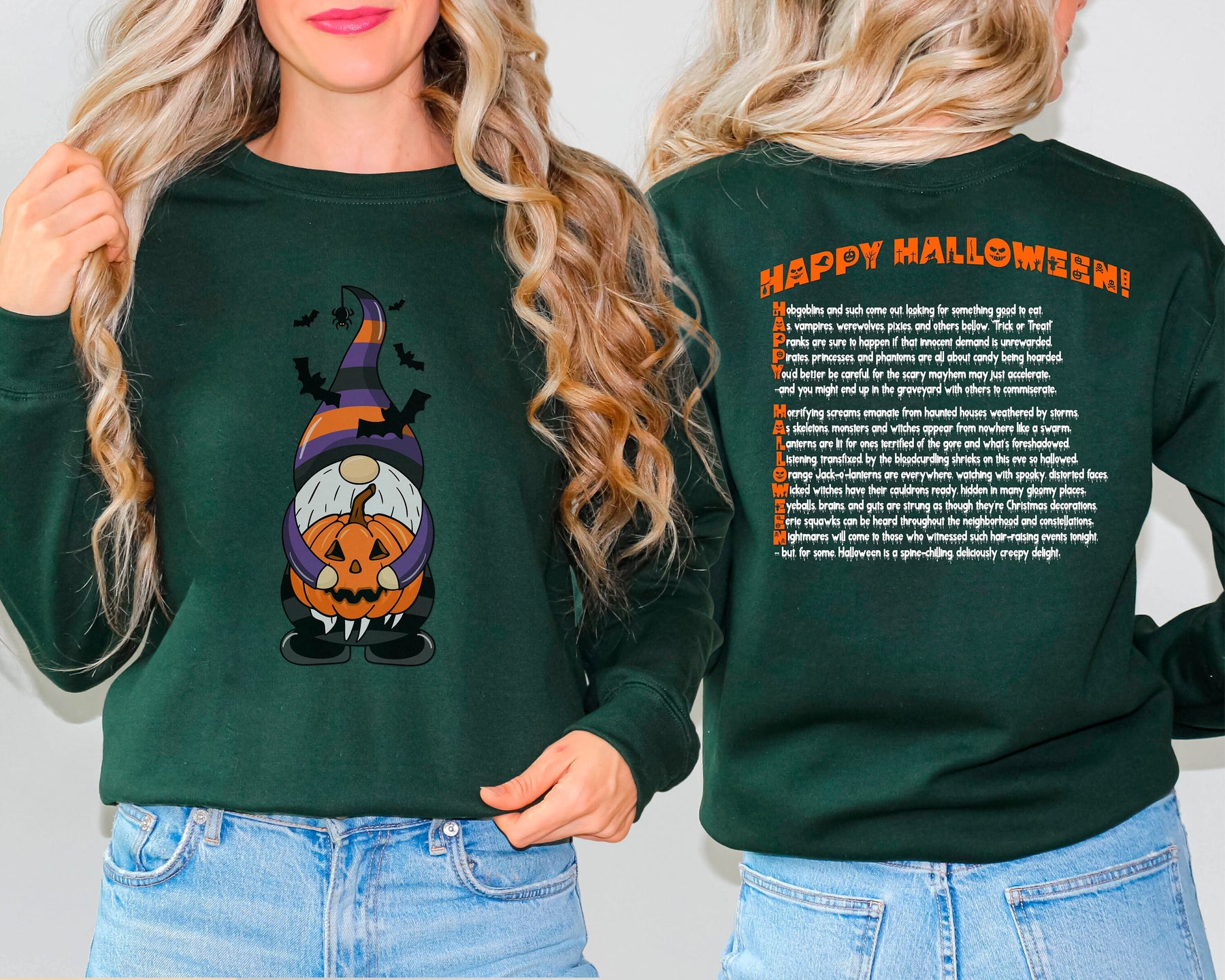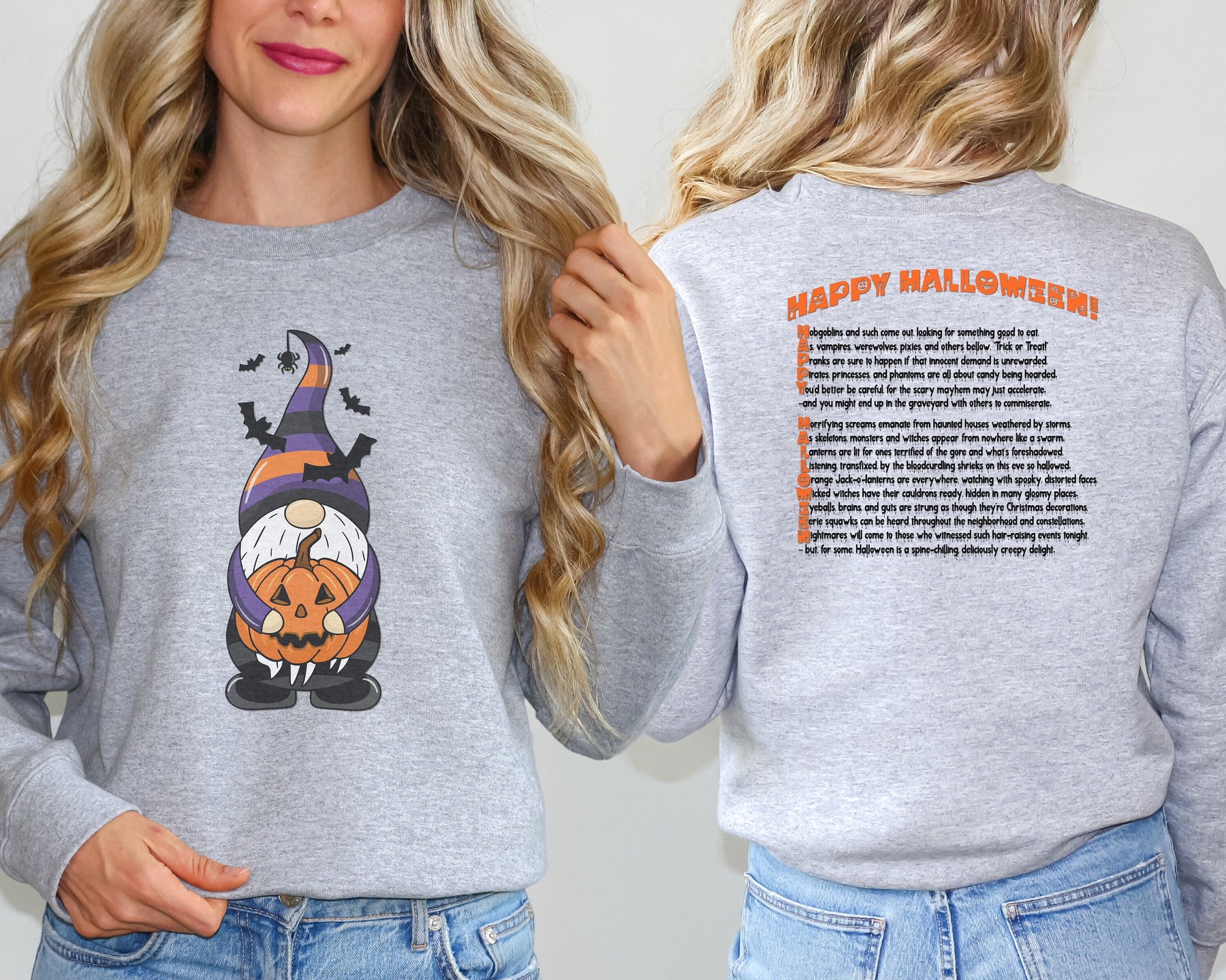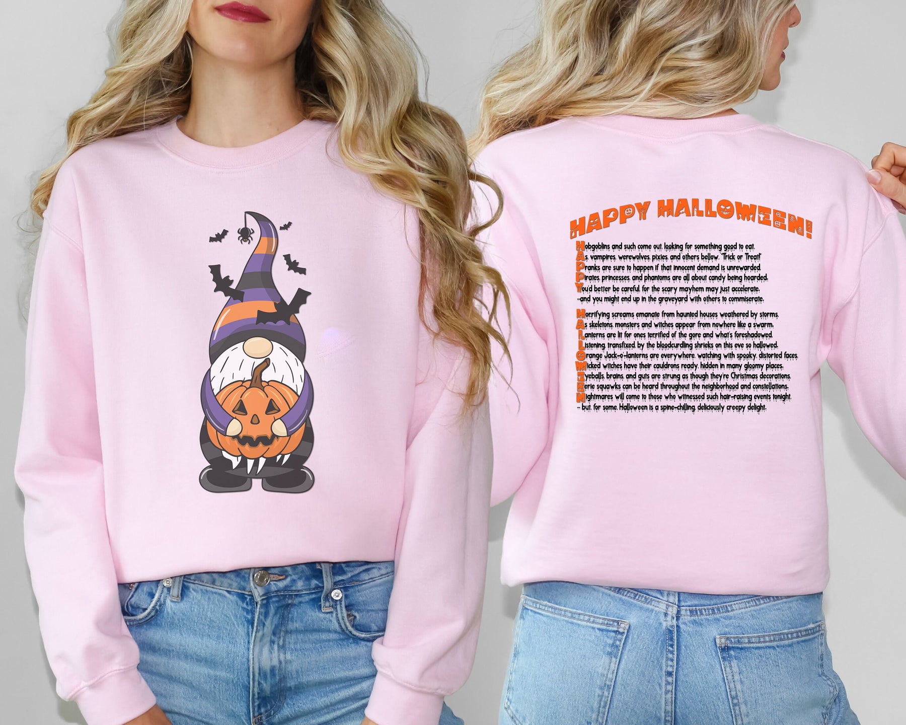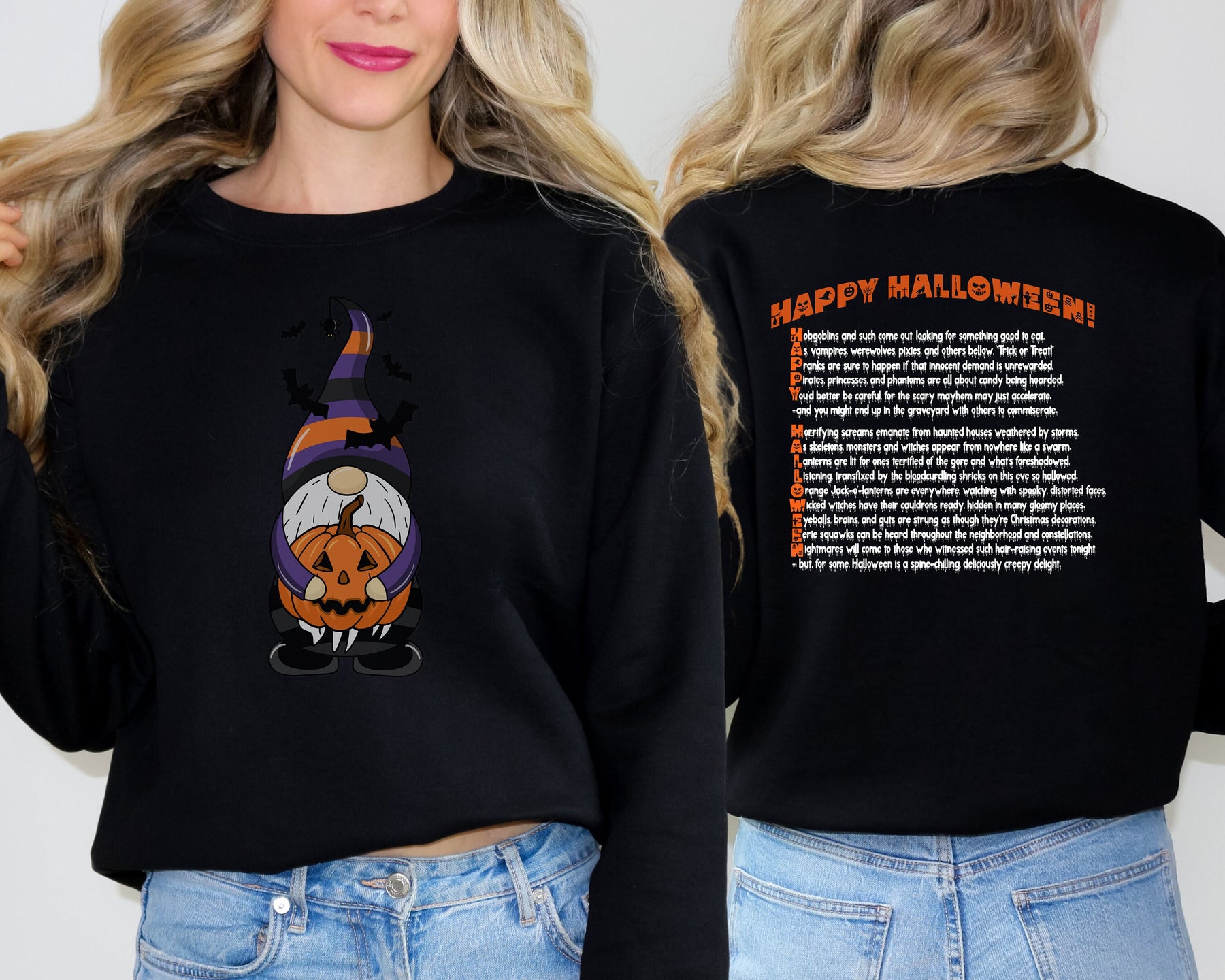 Embrace the thrill with Moments in Rhyme's "It's Just a Phrase" Halloween Sweatshirts! Turn heads with the cute Gnome holding a pumpkin and surrounded by bats. Command attention with the "Happy Halloween" acrostic poem and ooze-dripping text on the back. This crewneck sweatshirt is a daring addition to any wardrobe, and is easy to care for with machine wash and tumble dry instructions. Don't miss out on this unique and playful design!
