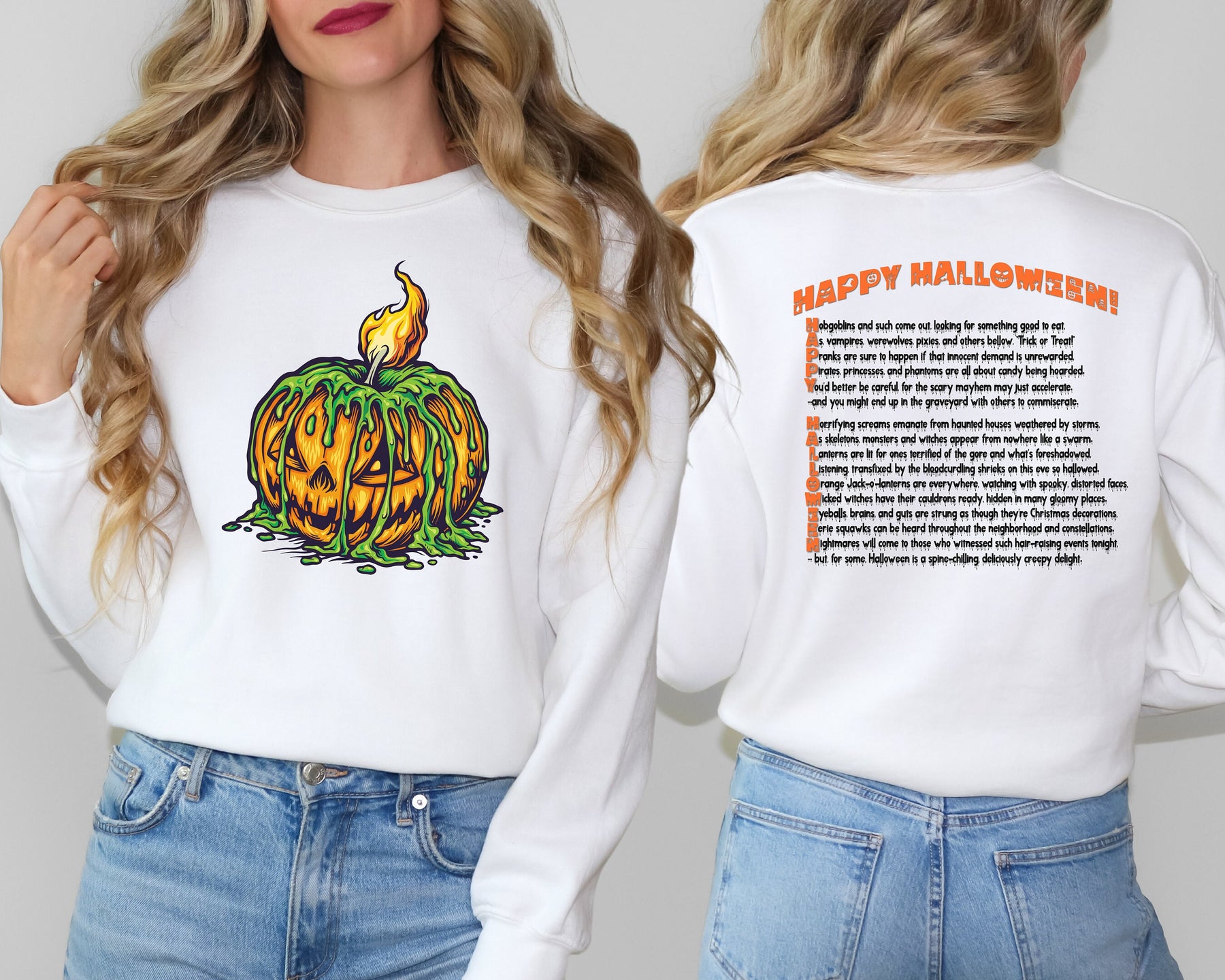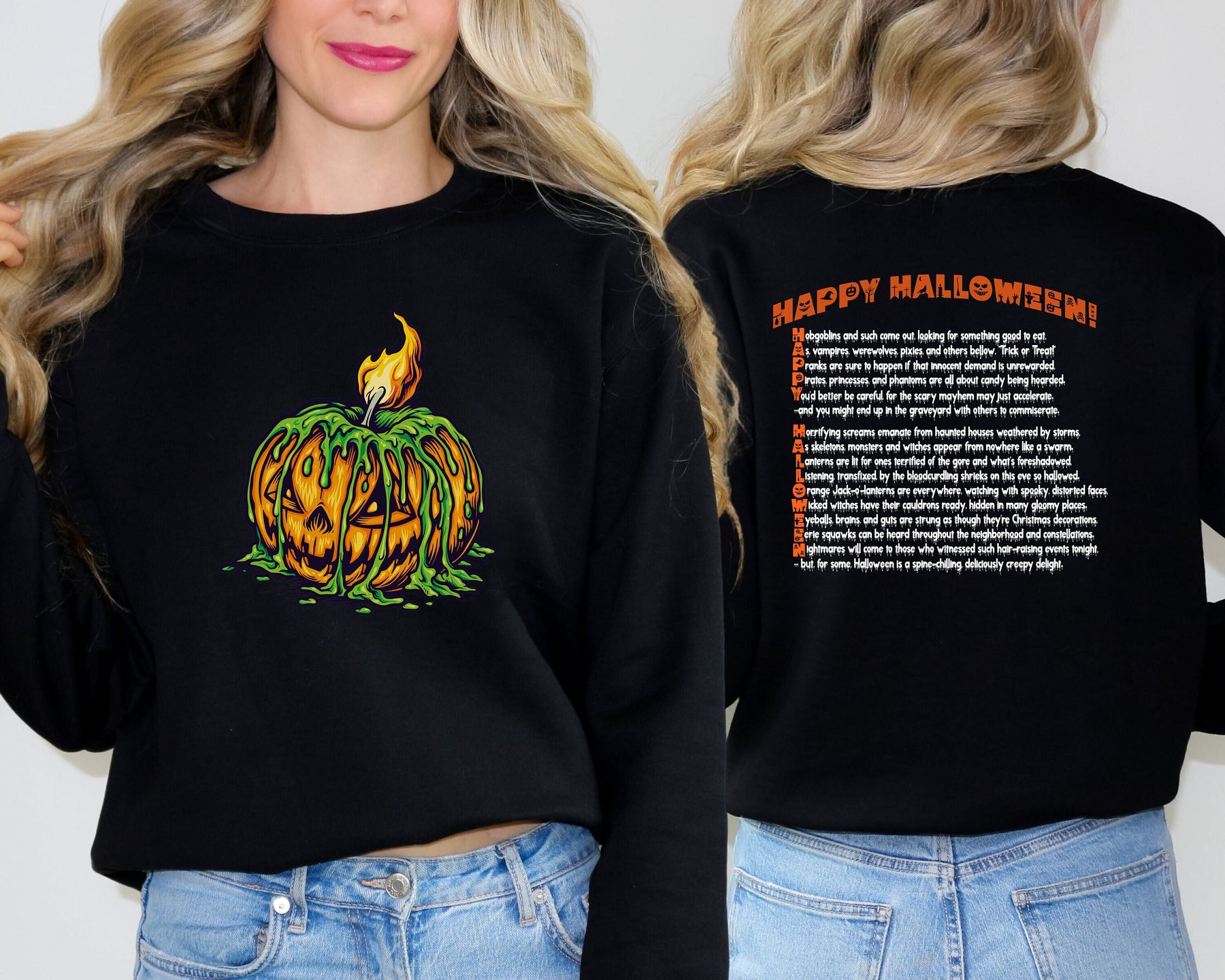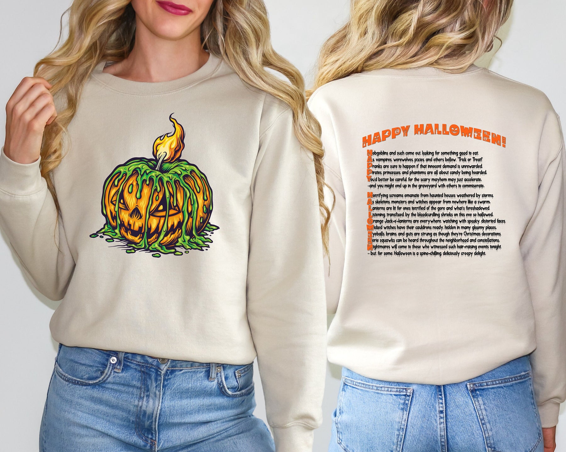 Strike fear into the hearts of all this Halloween with our Creepy Pumpkin Sweatshirt featuring a spine-chilling "Happy Halloween" acrostic poem on the back. Dare to be different with our unique text and poem that will make for an electrifying conversation starter! Notice the eerie Halloween-themed font and dripping ooze text, perfect for any thrill-seeker.