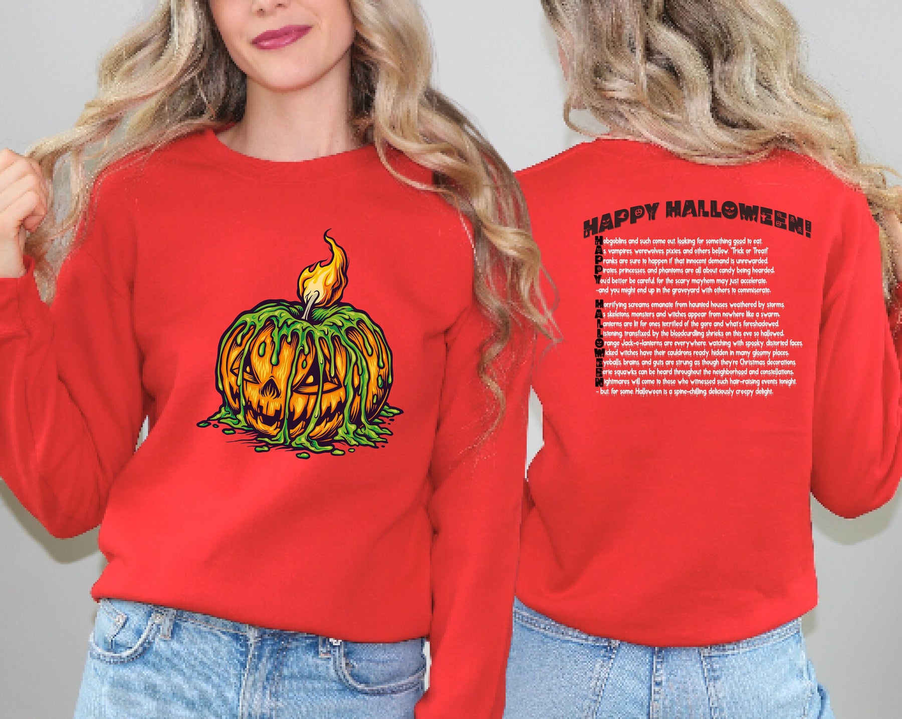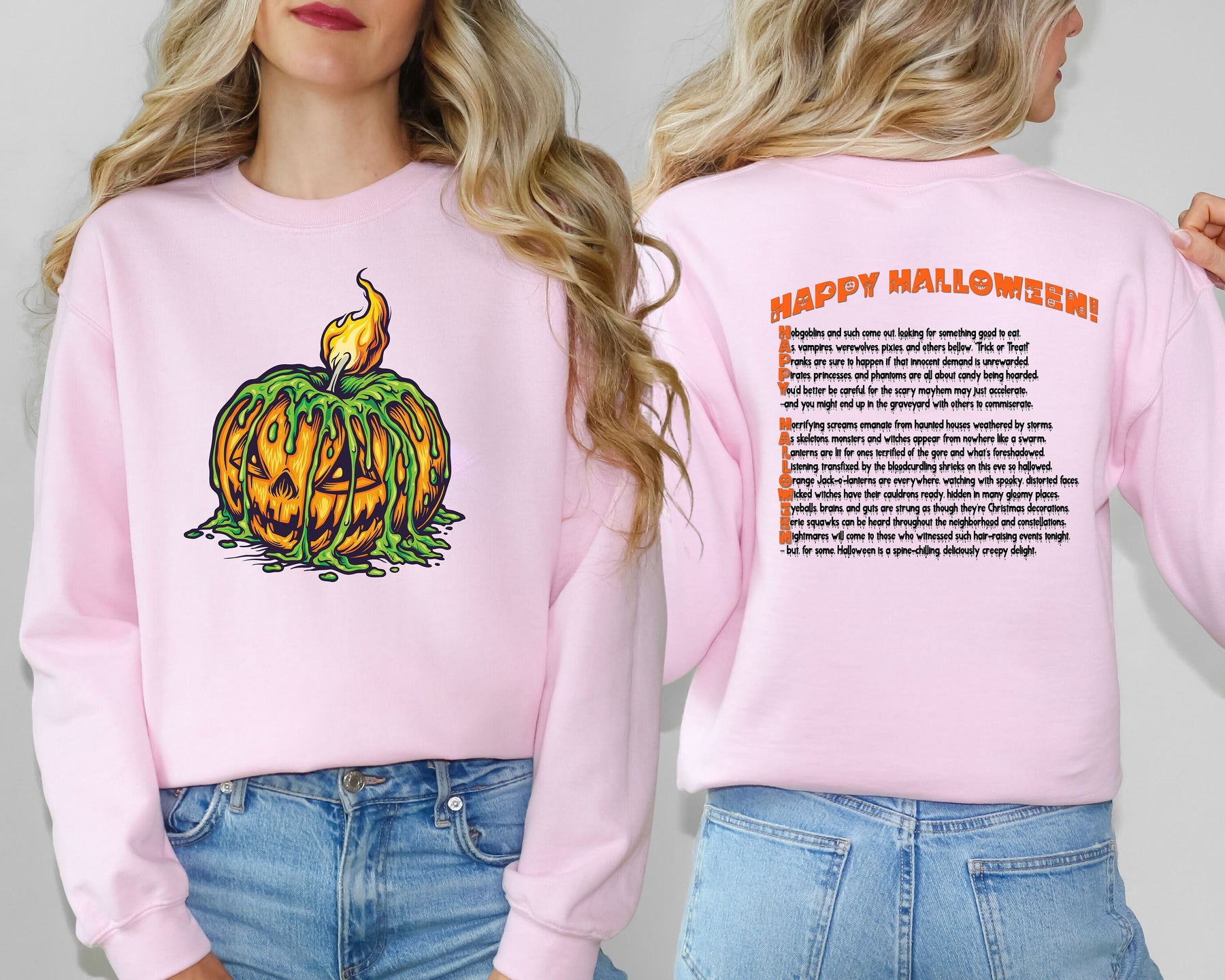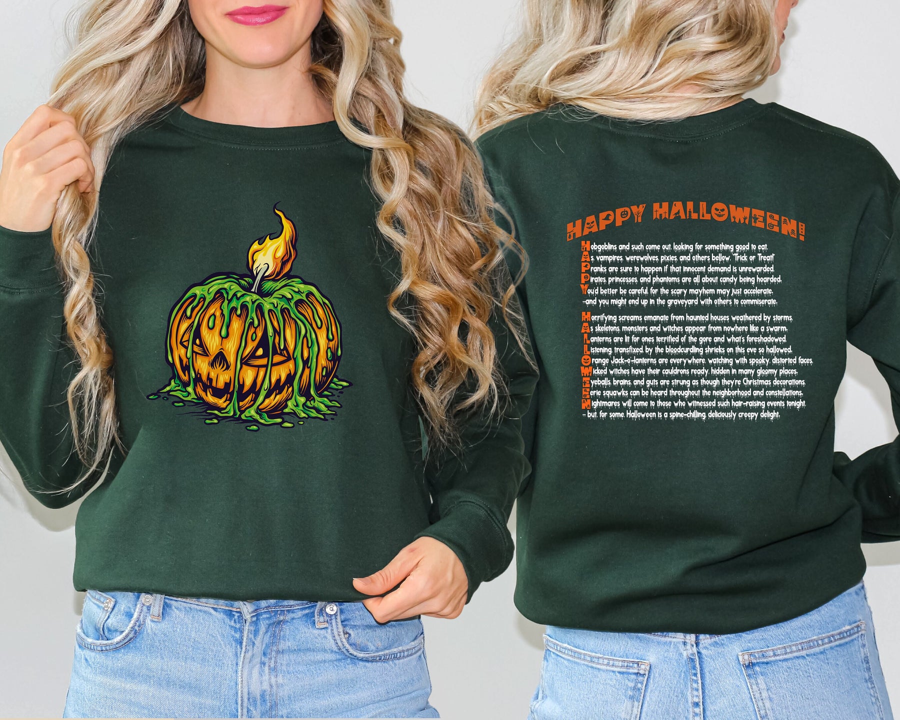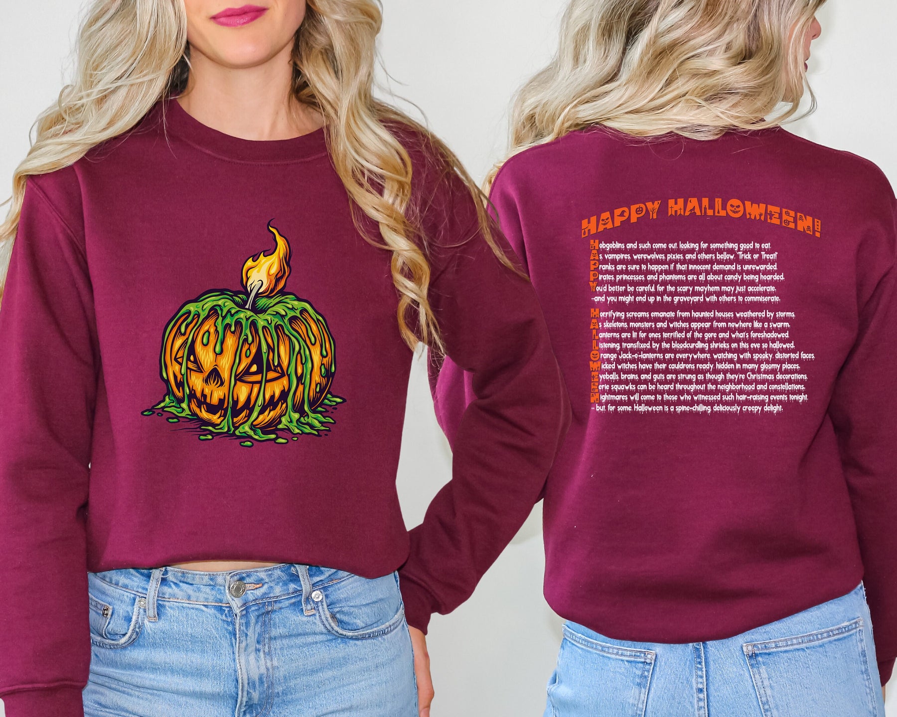 Strike fear into the hearts of all this Halloween with our Creepy Pumpkin Sweatshirt featuring a spine-chilling "Happy Halloween" acrostic poem on the back. Dare to be different with our unique text and poem that will make for an electrifying conversation starter! Notice the eerie Halloween-themed font and dripping ooze text, perfect for any thrill-seeker.