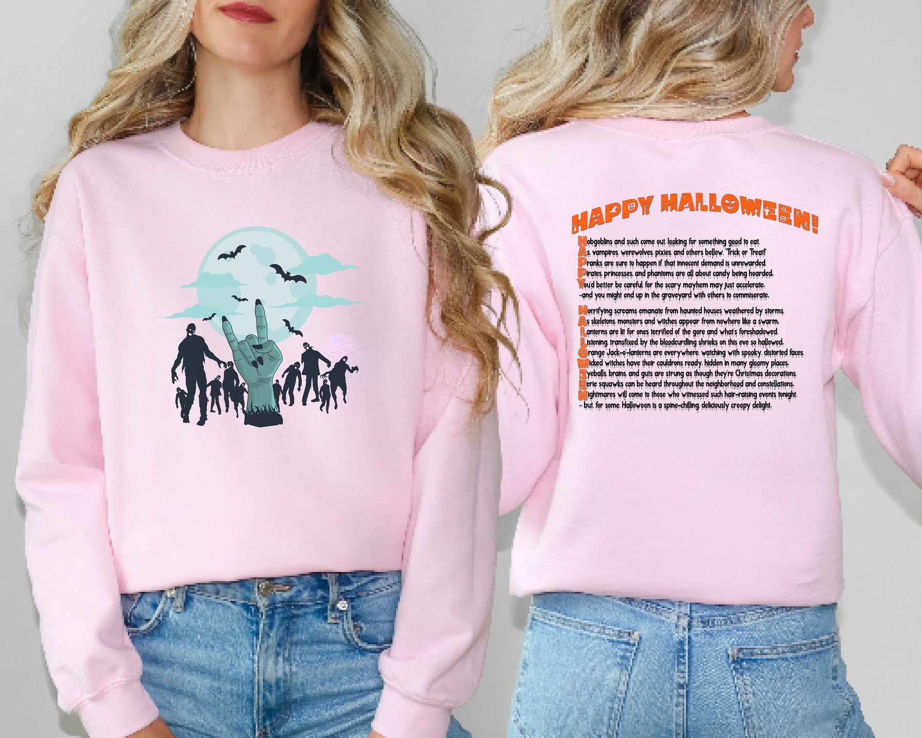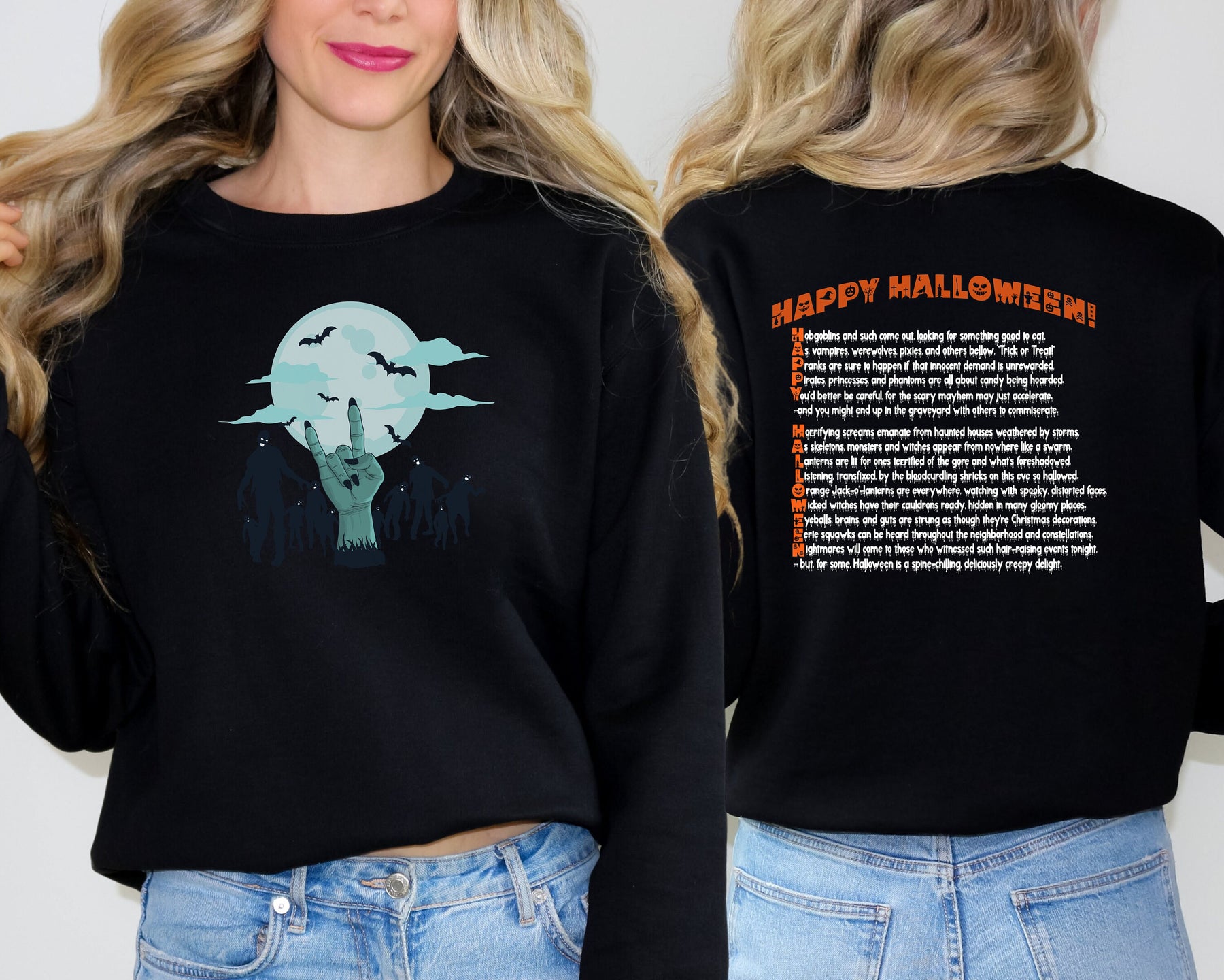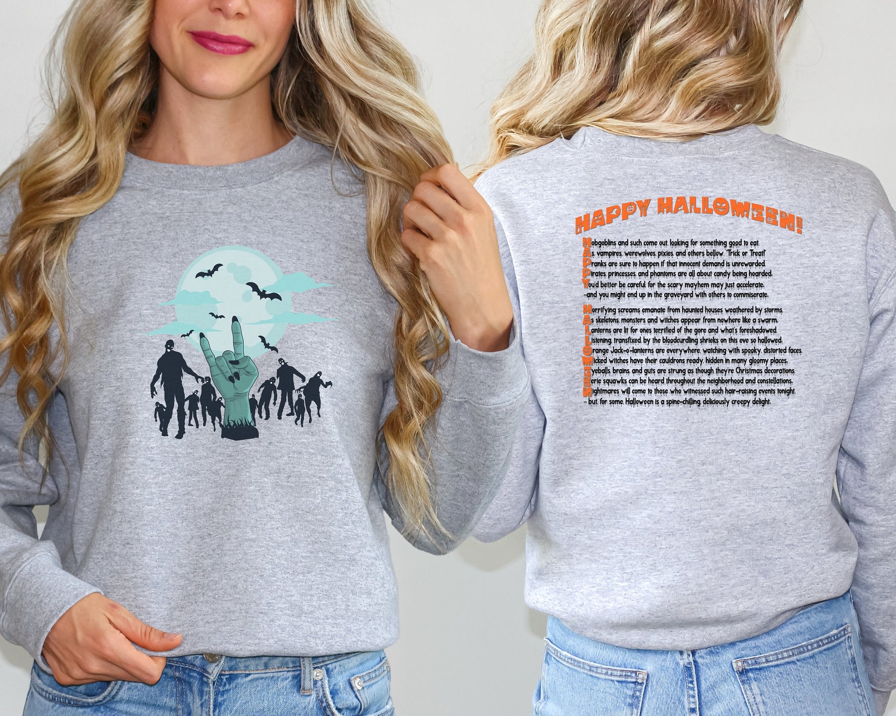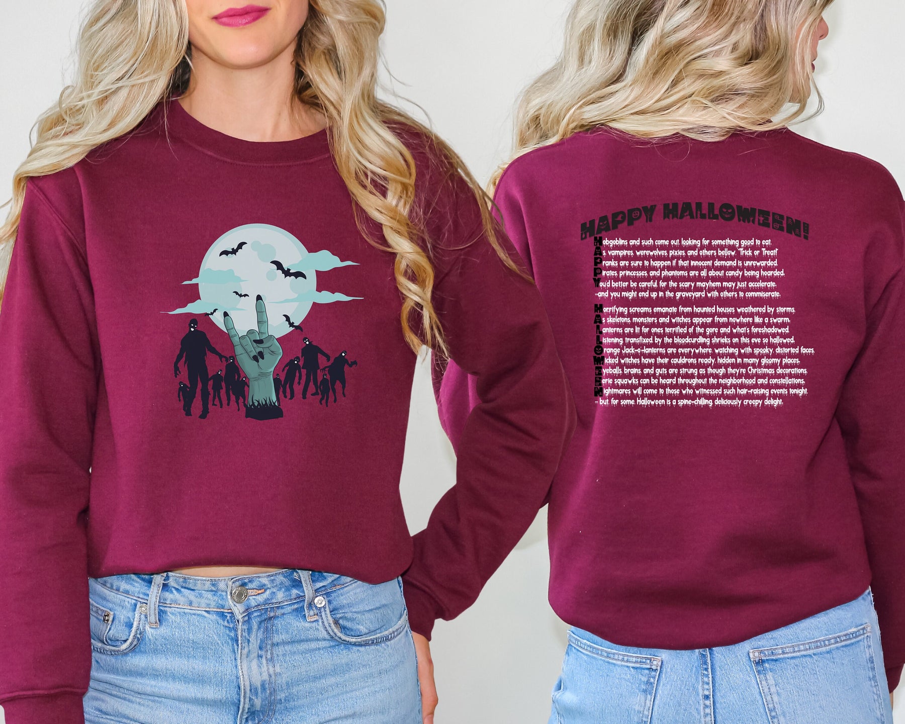 Spooky and fantastic "Rock On" hand and zombie motif, complete with an acrostic poem that spells out "Happy Halloween" on the back of this cozy crewneck sweatshirt. The clever writing and artwork are sure to spark some interesting discussions! Check out the Font with Halloween items incorporated and the ooze-dripping text!