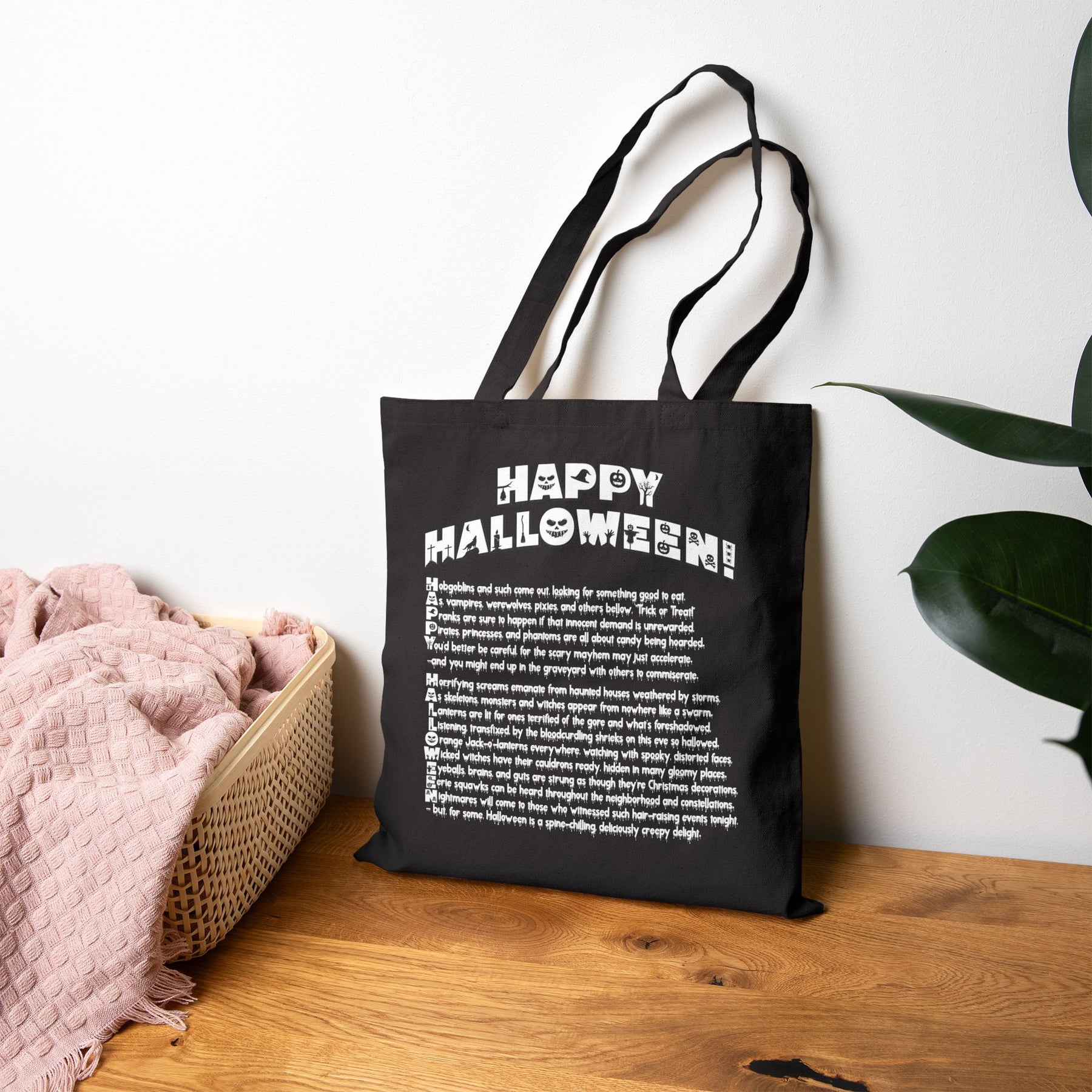 Get into the Halloween spirit with our It’s Just a Phrase candy tote bag, featuring an acrostic poem that spells out Happy Halloween and a spooky pink pumpkin.The amazing Halloween font adds to the charm of this tote. It's a fun and festive way to carry treats, and it can be used year after year. Great for both kids and adults who want to add a little extra spookiness to their costumes. Made from 100% cotton canvas with sturdy handles, this 15” x 16” tote is available in natural or black. To keep it looking its best, spot clean only, avoid bleach, and let it line dry. Do not iron directly over the print.