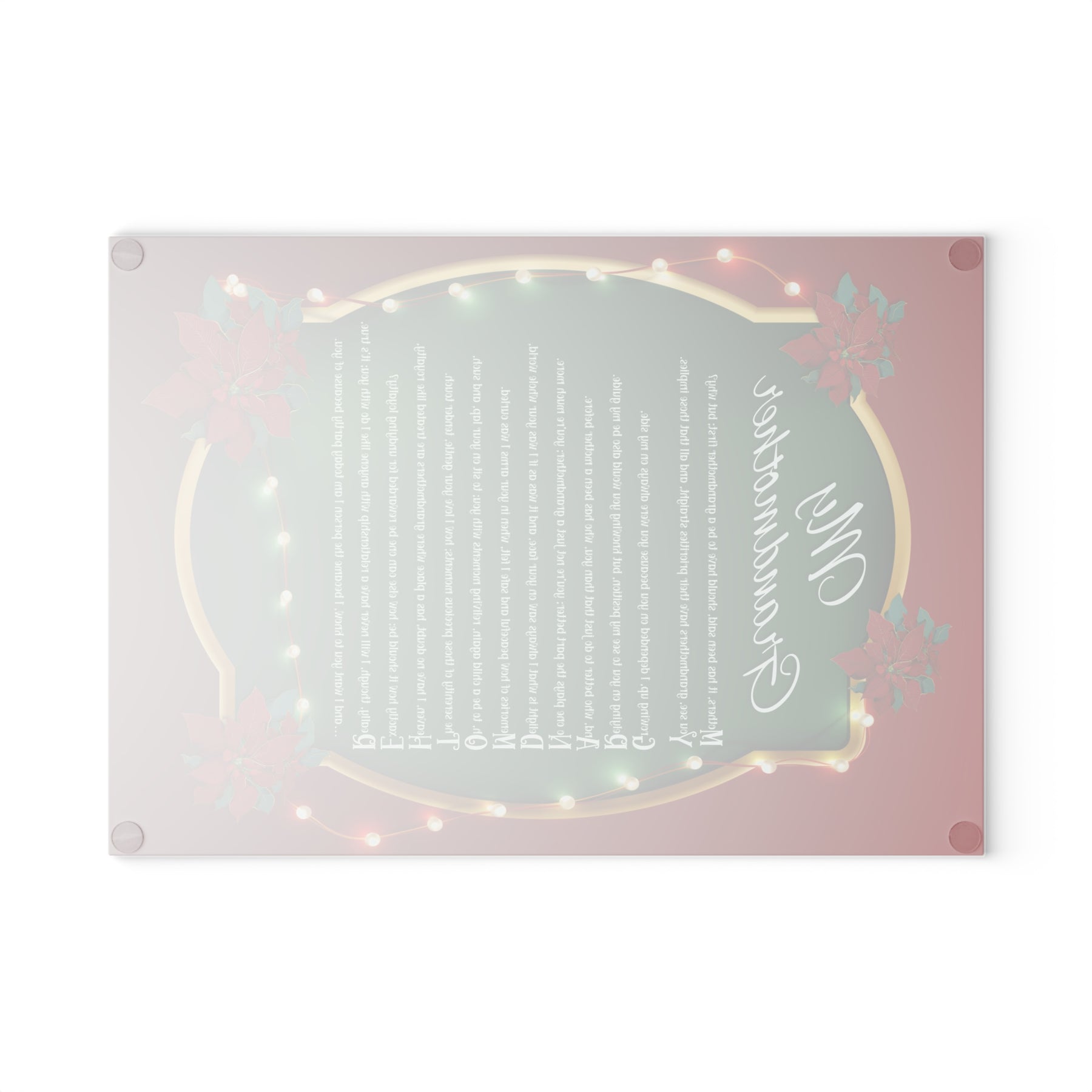 Add some personality to your kitchen with a custom glass cutting board from our It's Just a Phrase Holiday collection. The board features a festive design and an acrostic poem that spells out My Grandmother. Made from durable tempered glass, it stands up to years of meal prep. The textured surface is perfect for chopping, slicing, and dicing. Four rubber feet keep it steady on your counter. Choose from two sizes: 8" x 11" or 11" x 15". For best results, hand wash only.