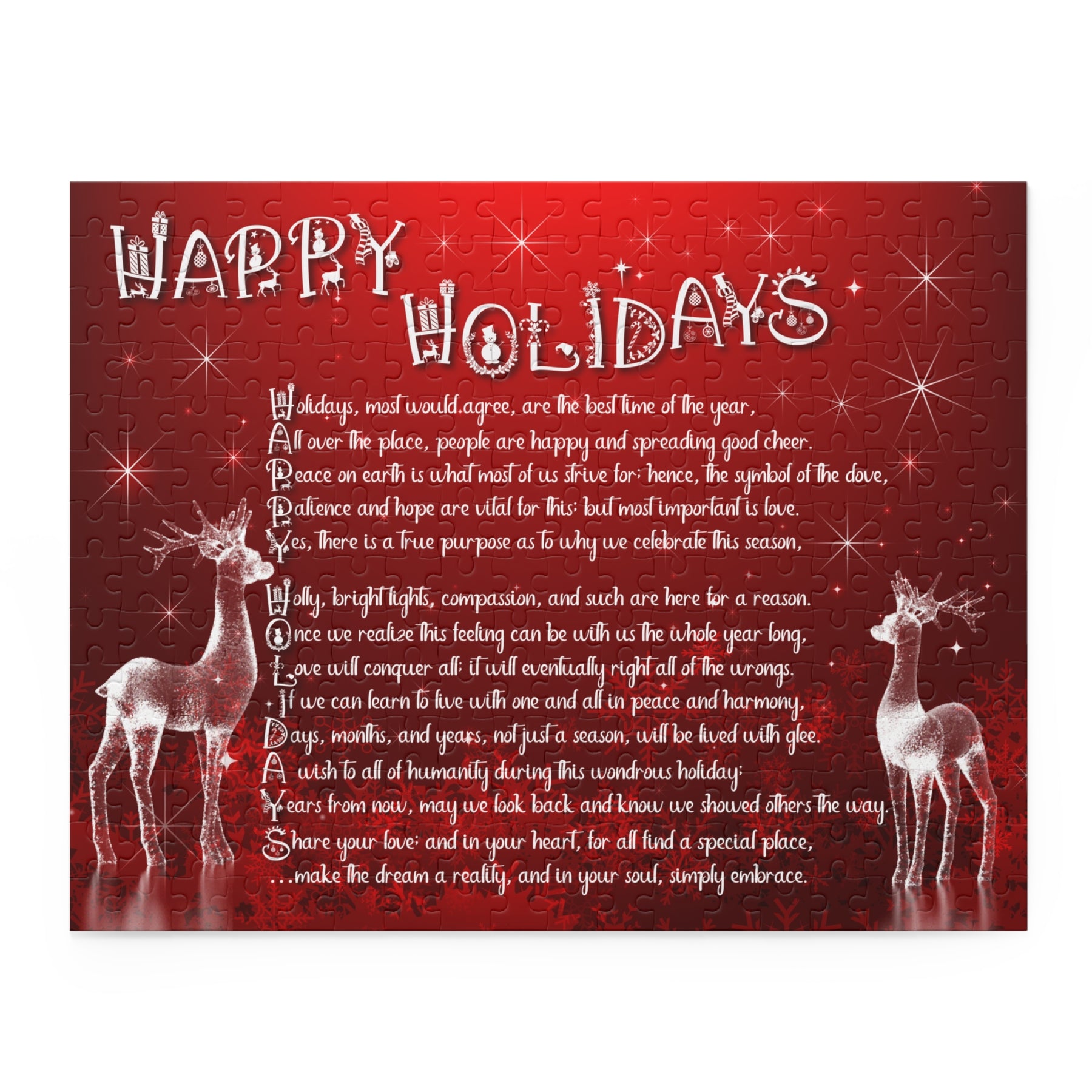Moments in Rhyme introduces our It's Just a Phrase Puzzle Collection, meticulously crafted for puzzle enthusiasts and holiday lovers alike. Gorgeous design featuring an acrostic poem that spells out Happy Holidays. Leave this out all season long and invite family and guests to help with a piece or two here and there. They will piece together this enchanting puzzle, using each letter as a clue to unveil a captivating poem about the holiday season. With its vibrant imagery and intricate design, it's also perfect for those seeking a mindful and immersive experience. Unleash your critical thinking skills and embrace the magic of this exquisite puzzle. It is crafted from high-quality puzzle board and ships in a gift-ready box, which also features the design on the outside. Available in two sizes.