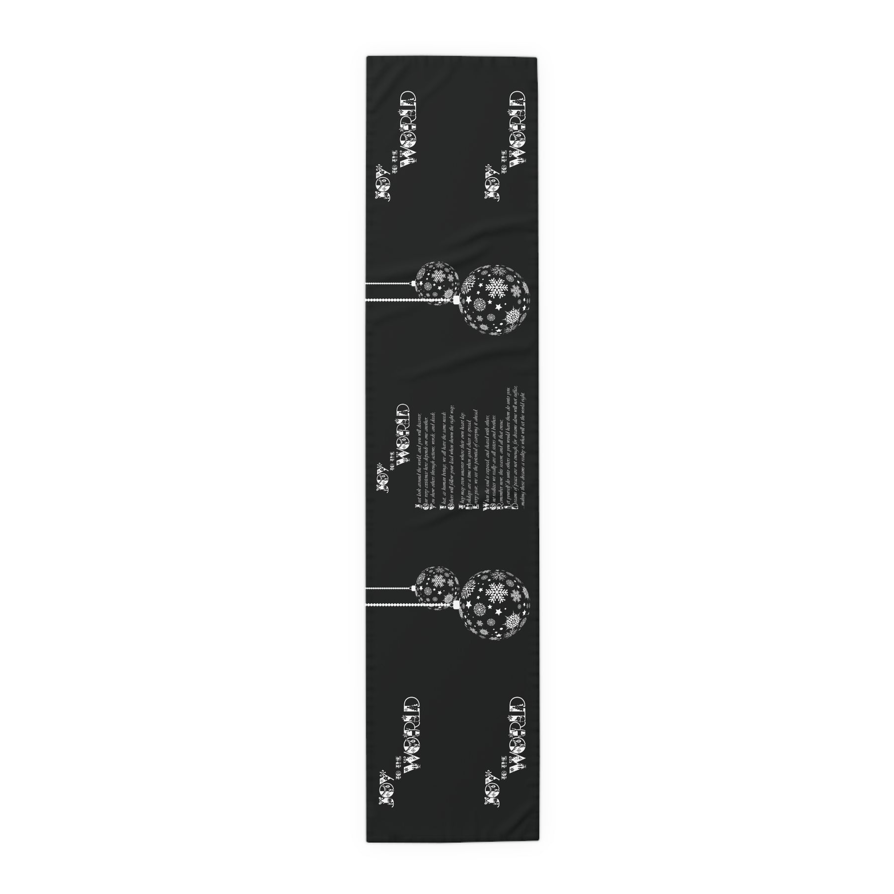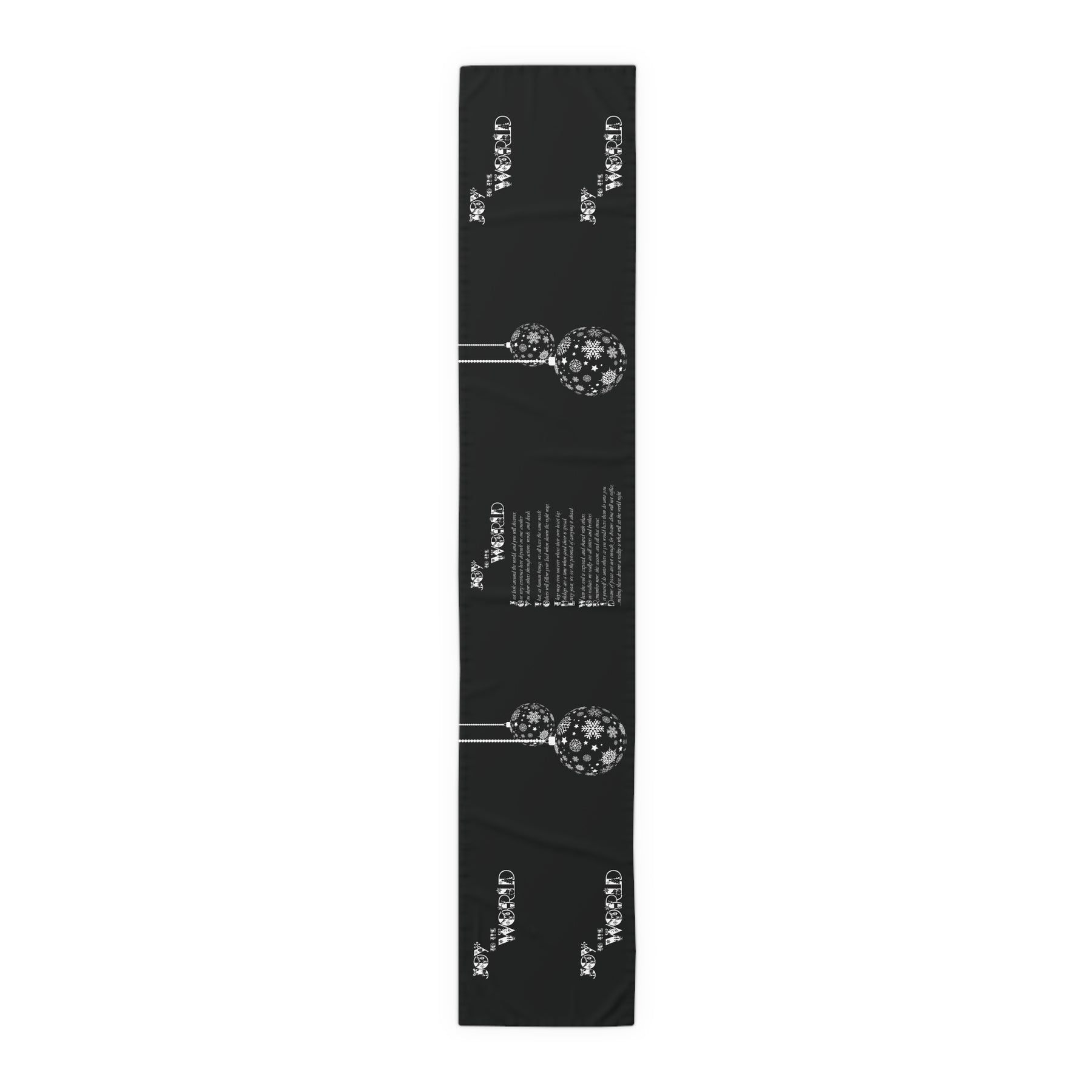 Our It's Just a Phrase Holiday table runner is ideal for holiday lovers and makes a thoughtful gift. This design features a lovely design and an acrostic poem that spells out Joy to the World. Add a playful accent to your next holiday get-together. You’ll be using this for many years to come. Hemmed edges for durability. Machine wash: cold, gentle cycle, mild detergent. Do not bleach. Line dry.