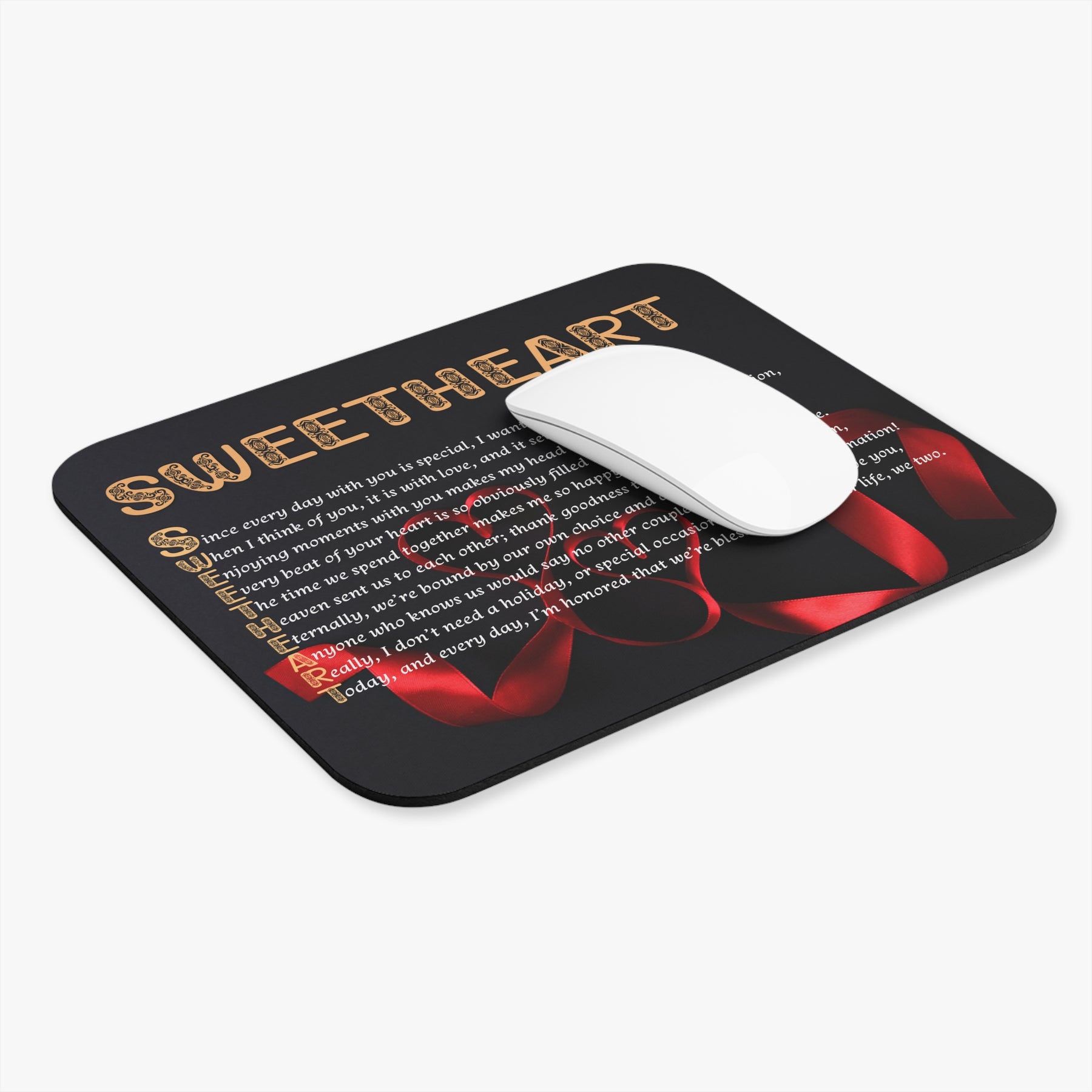 Enhance your online browsing and gaming experience with this It's Just a Phrase mouse pad. The rubber base provides a firm grip on the desk, while the stain-resistant cloth top side features an acrostic poem spelling out "Sweetheart". This mouse pad delivers smooth mouse sliding action for both work and play. Makes a great gift for birthdays and special occasions. This will become a lifetime keepsake!