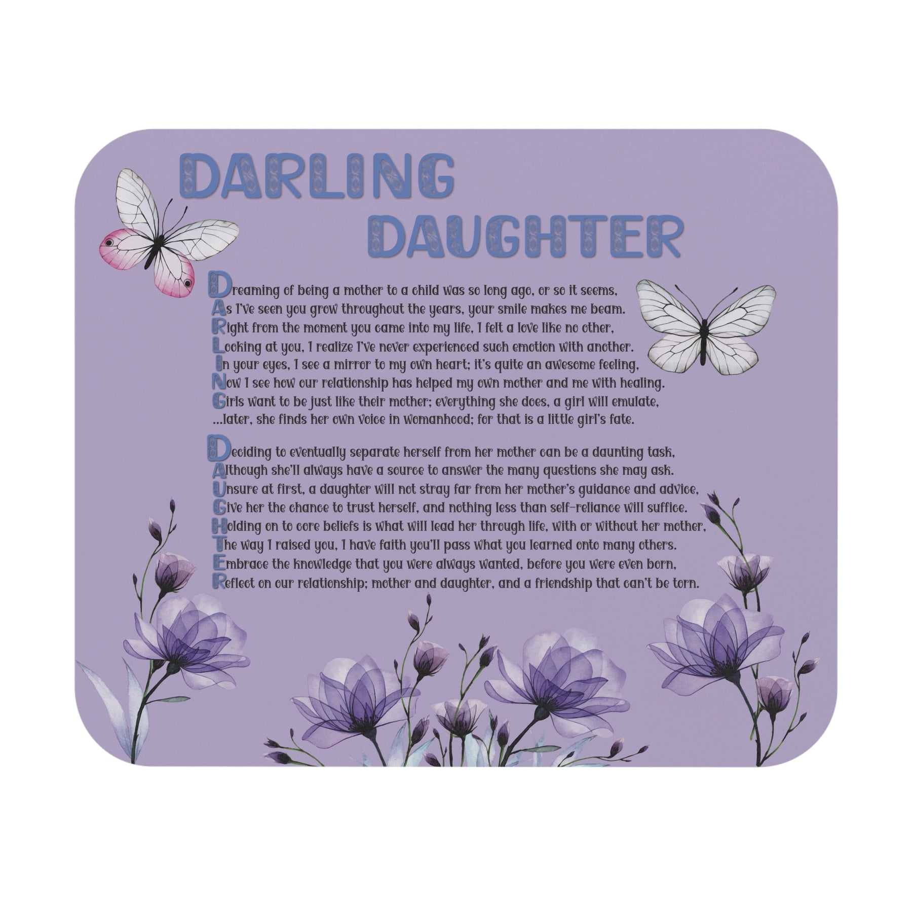 Enhance your online browsing and gaming experience with this It's Just a Phrase mouse pad. The rubber base provides a firm grip on the desk, while the stain-resistant cloth top side features an acrostic poem spelling out "Darling Daughter". This mouse pad delivers smooth mouse sliding action for both work and play. Makes a great gift for birthdays and special occasions. This will become a lifetime keepsake!