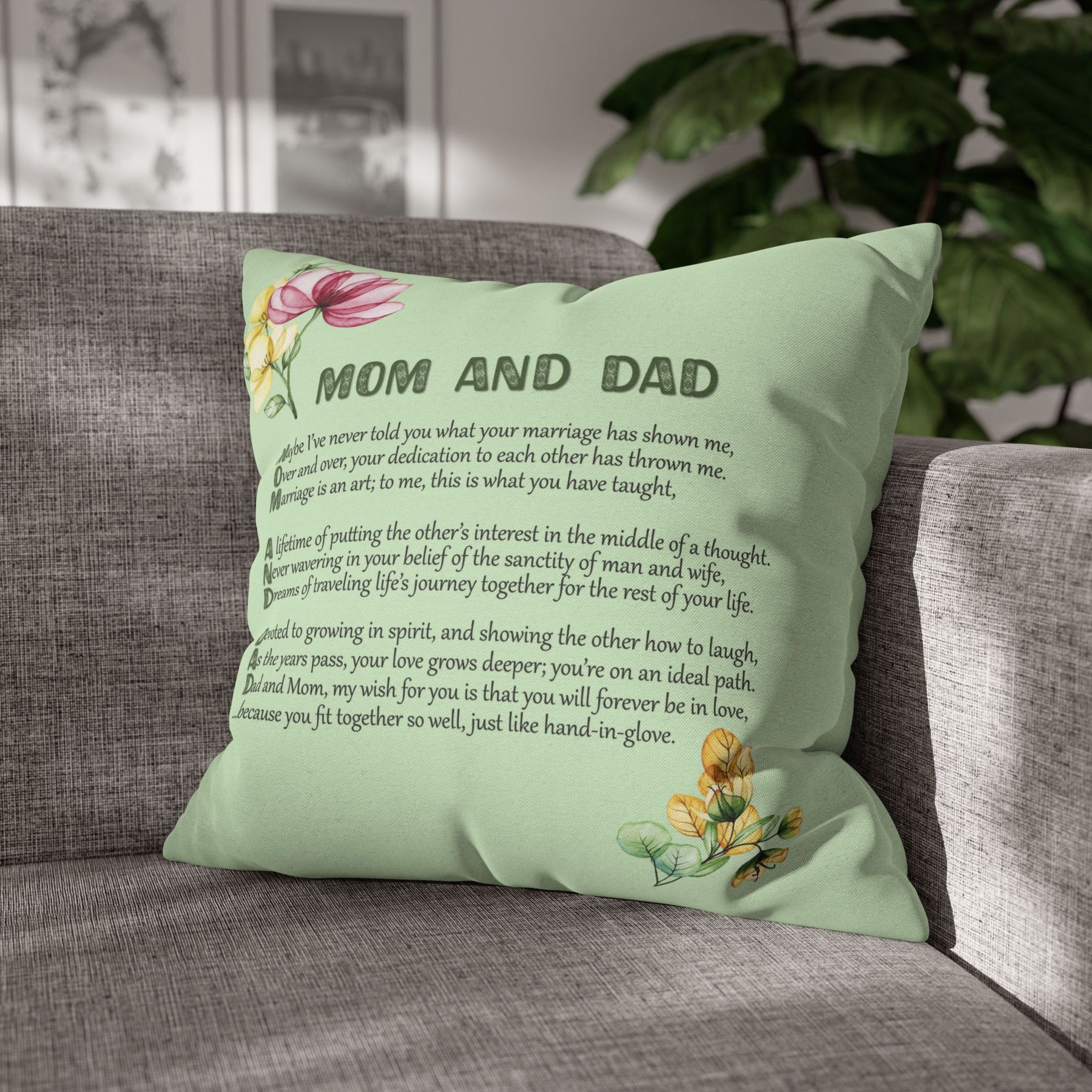 Moments in Rhyme introduces our It's Just a Phrase Pillow Collection, spelling out Mom and Dad to bring cheer to any room. Perfect for gift-giving, this will become a lifetime keepsake. Create a heartfelt ambiance in any room with these square pillow covers, and add a sentimental touch to your parents' decor. Perfect for expressing love, this pillowcase is ideal for Mother's Day, Father’s Day, birthdays, anniversaries, and Christmas, to show your appreciation. To clean, pre-treat stains with a soft cloth or bristle brush soaked in warm, soapy water. Machine wash on normal cycle. Do not bleach, tumble dry on low, do not dry-clean. Iron, steam, or dry on low heat only. Fluff to reshape.