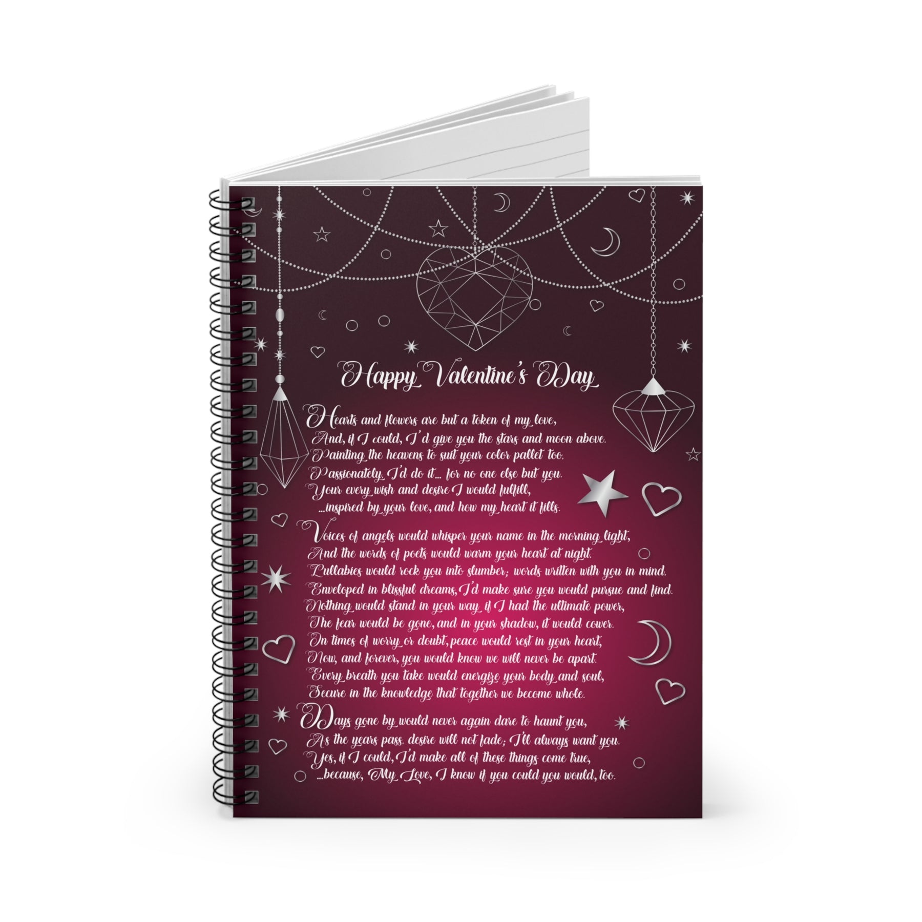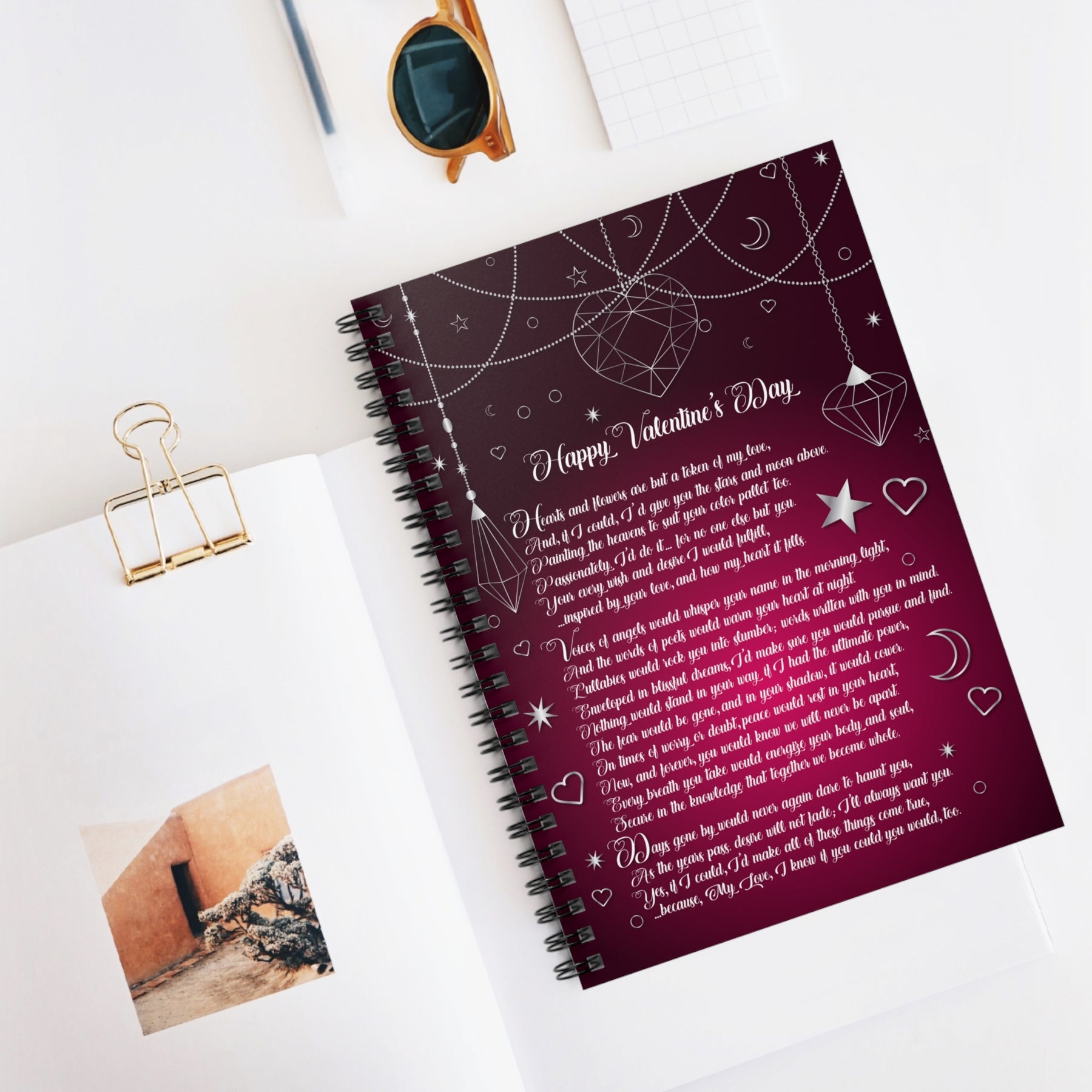 Take a look at the It's Just a Phrase Spiral Notebook Collection from Moments in Rhyme. This notebook has an acrostic poem that spells out Happy Valentine's Day and a cute heart graphic. It’s a thoughtful way to show your Valentine you care. Use it for shopping lists, recipes, or journaling. The sturdy printed cover keeps it safe wherever you take it, and the elegant font helps it stand out. It comes with a dark grey back cover and 59 double-sided sheets.