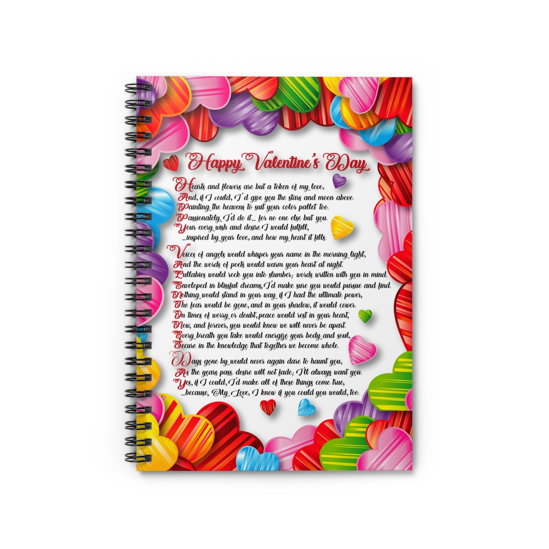 Take a look at the It's Just a Phrase Spiral Notebook Collection from Moments in Rhyme. This notebook has an acrostic poem that spells out Happy Valentine's Day and a cute heart graphic. It’s a thoughtful way to show your Valentine you care. Use it for shopping lists, recipes, or journaling. The sturdy printed cover keeps it safe wherever you take it, and the adorable font helps it stand out. It comes with a dark grey back cover and 59 double-sided sheets.